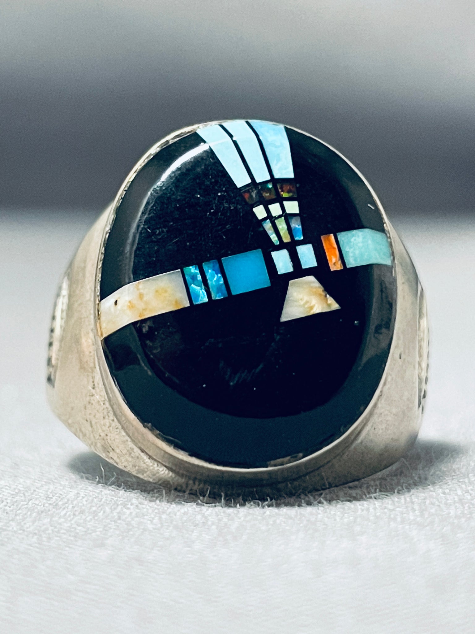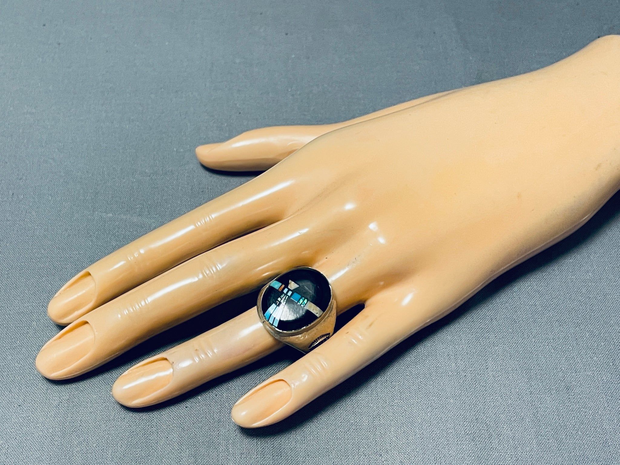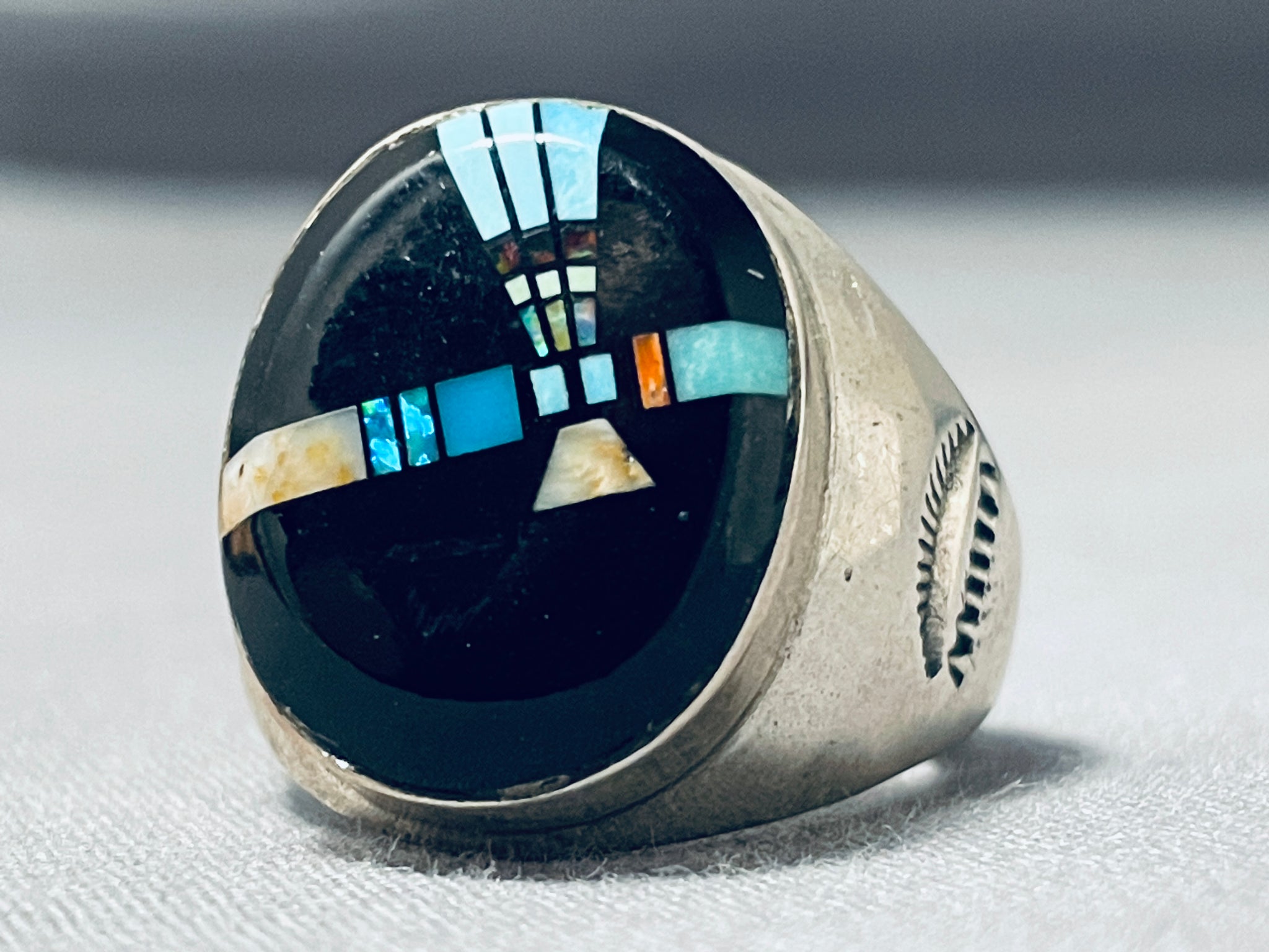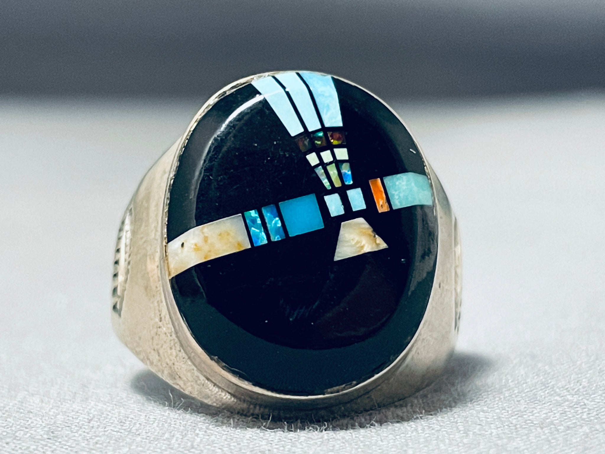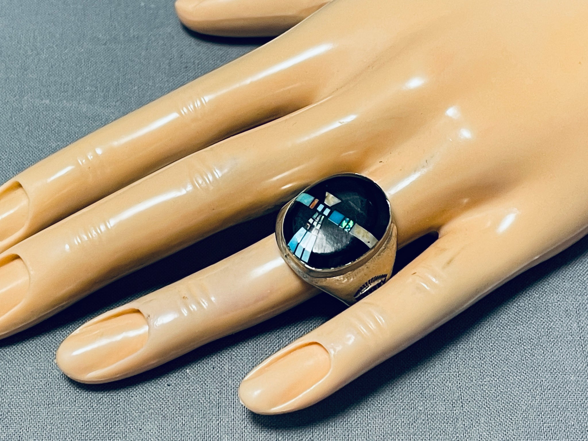 This is a wonderful vintage Navajo inlaid thick silver ring. This ring contains a beautiful inlaid oval shaped face that consists of onyx, Sleeping Beauty turquoise, opal, and shell. The intricacy of the inlay is just amazing. This ring is very thick and sturdy with side accenting sun stampings. The ring face measures around 3/4" x 5/8". The ring size is around 10. Cir. Mid century . Sterling silver, marked. Sturdy 17 grams.