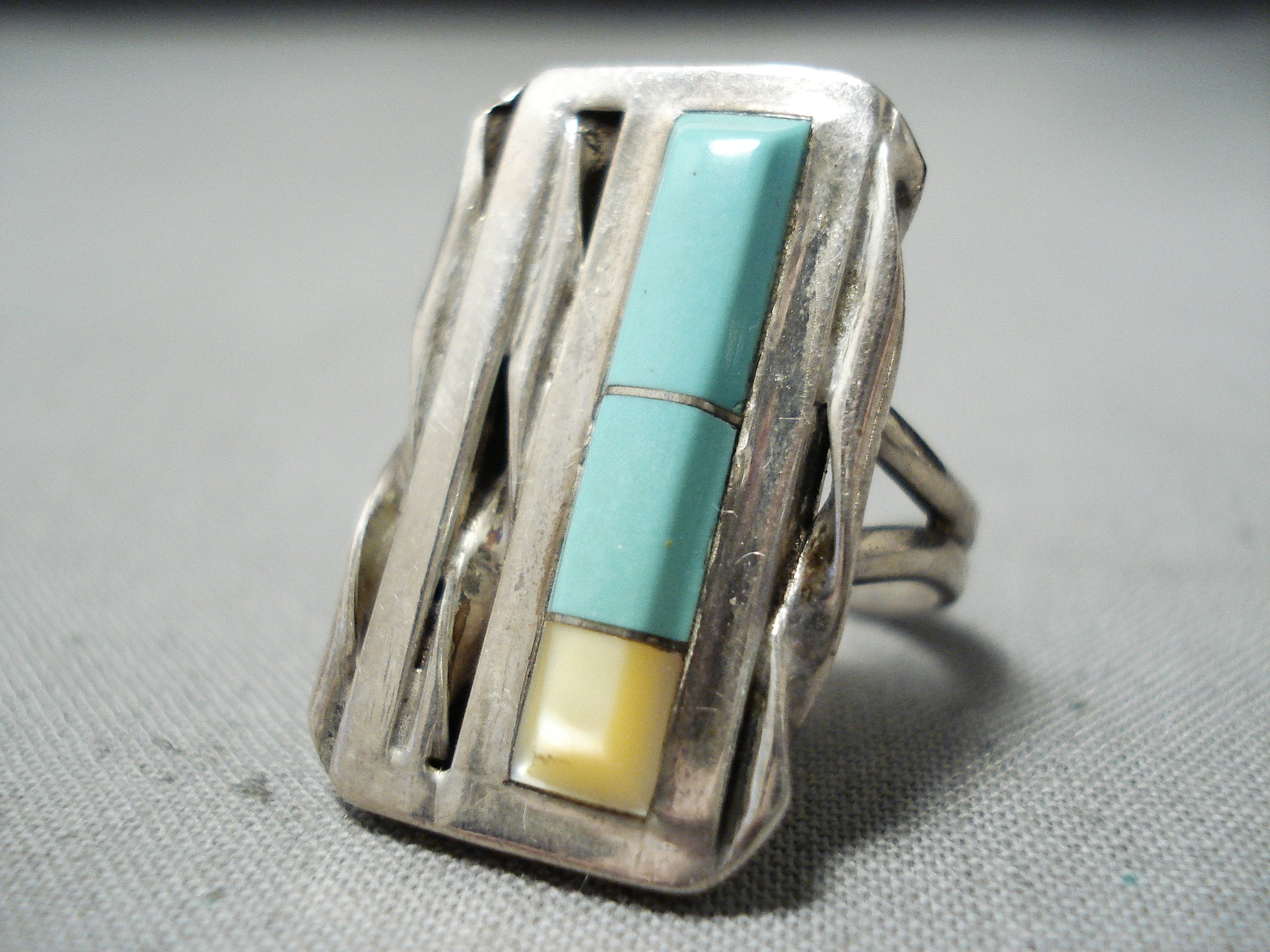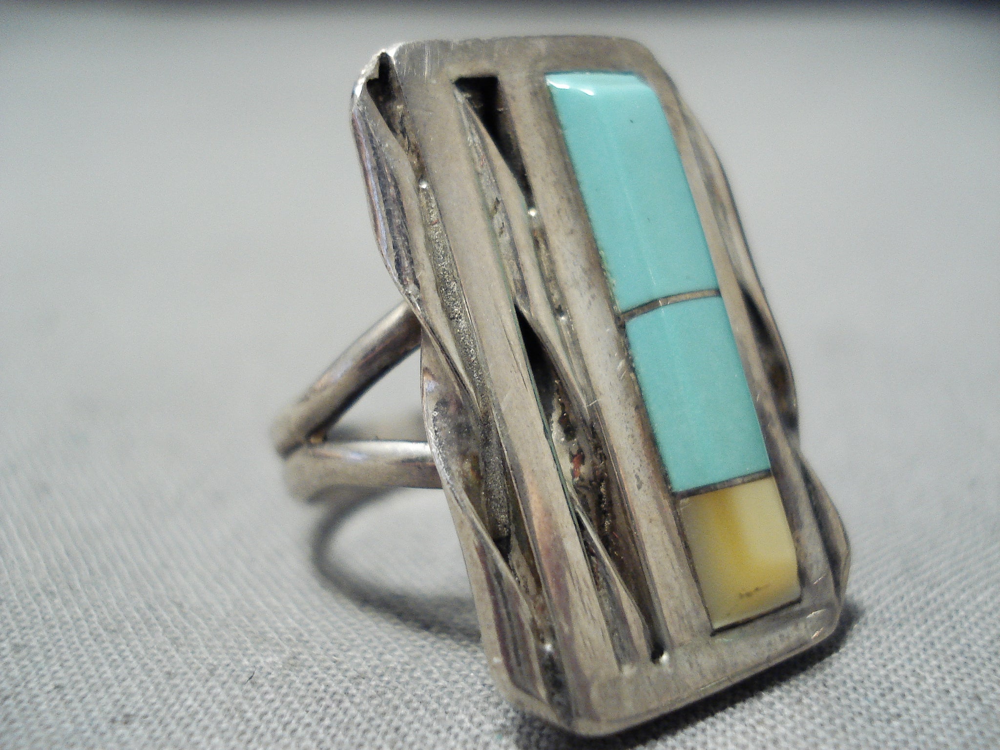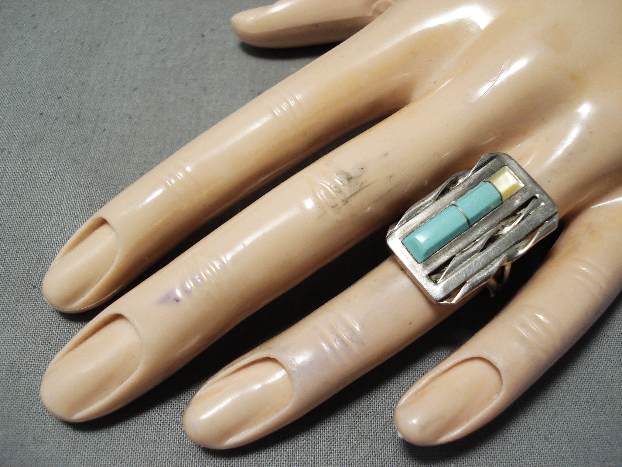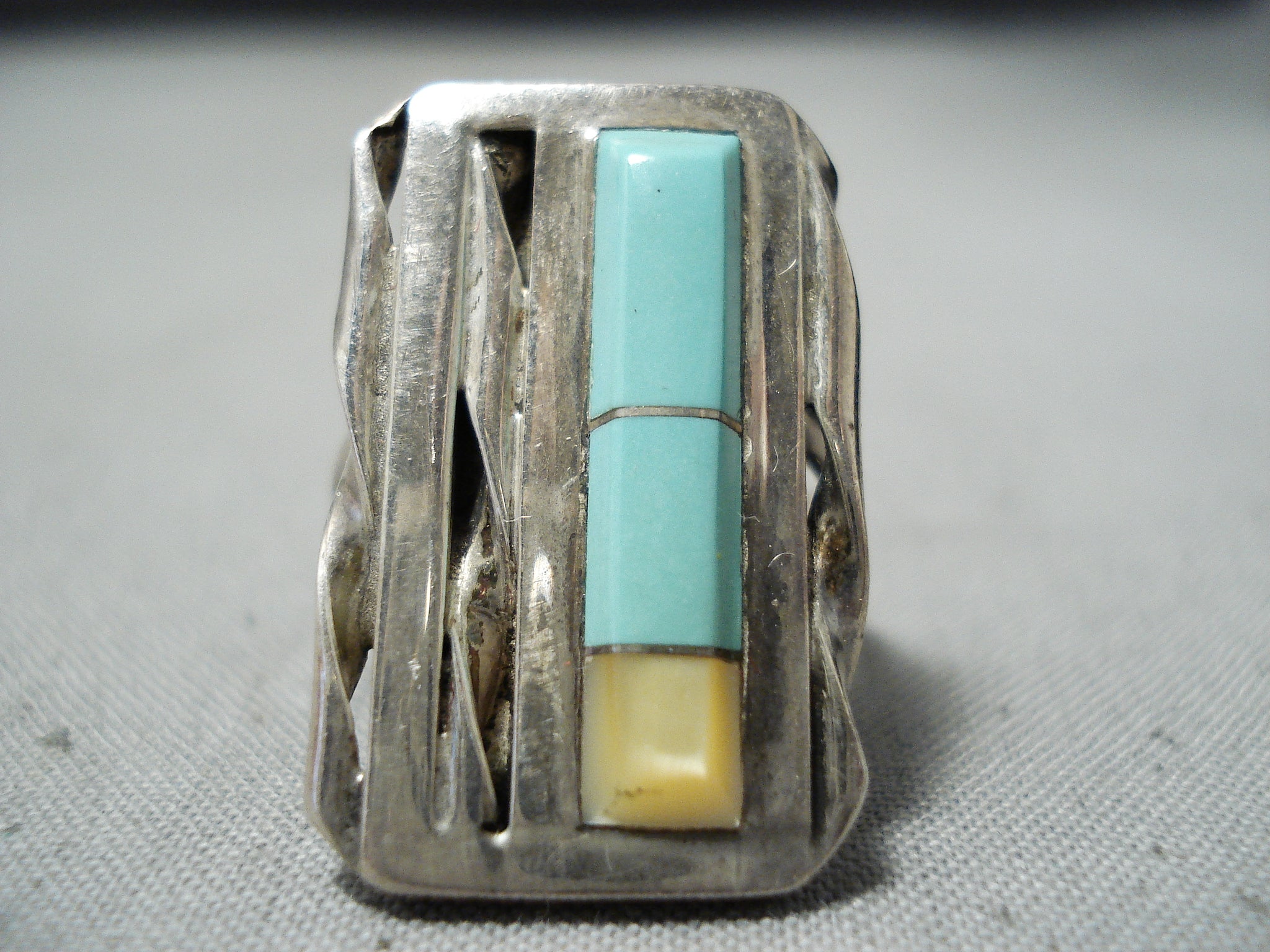 Huge Rare Vintage Native American Zuni Signed Turquoise Sterling Silver Shell Ring Old