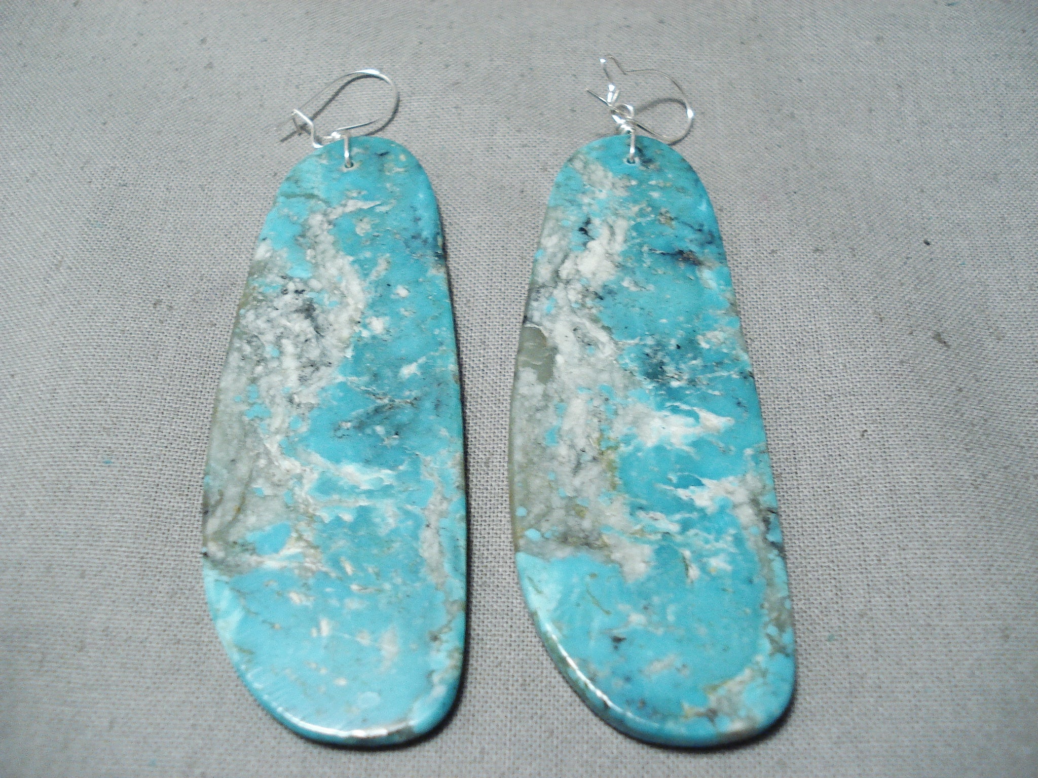 This is a remarkable vintage Navajo turquoise slab earrings. These are some of the finest turquoise slab earrings we have collected this year. Each slab measures a mind blowing 2-5/8" X 1". The turquoise appears to be from the amazing Blue Diamond turquoise mine. Sterling silver. The earrings weigh around 17 grams.