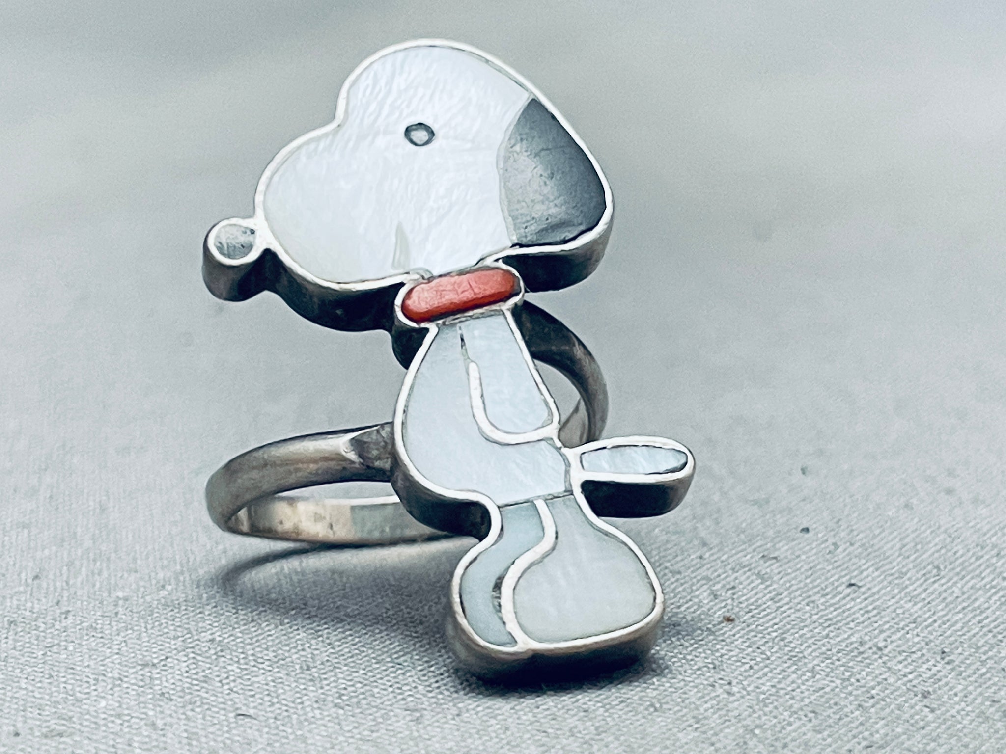 Huge Snoopy Vintage Native American Zuni Pearl Inlay Sterling Silver Ring
