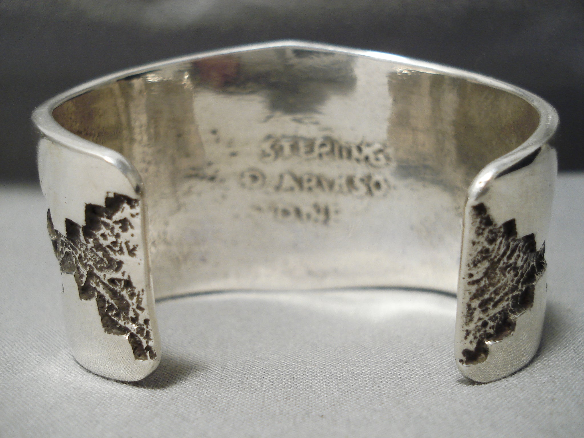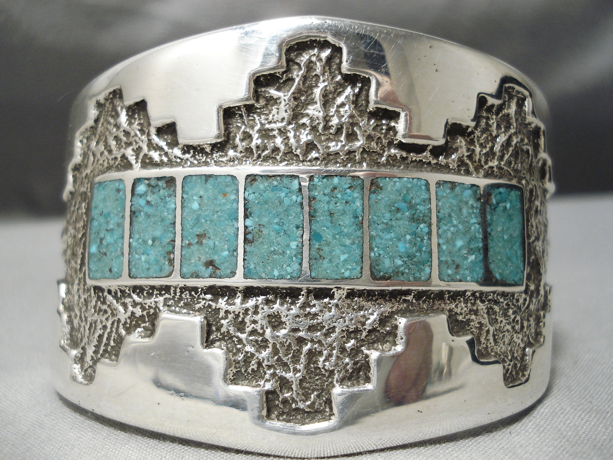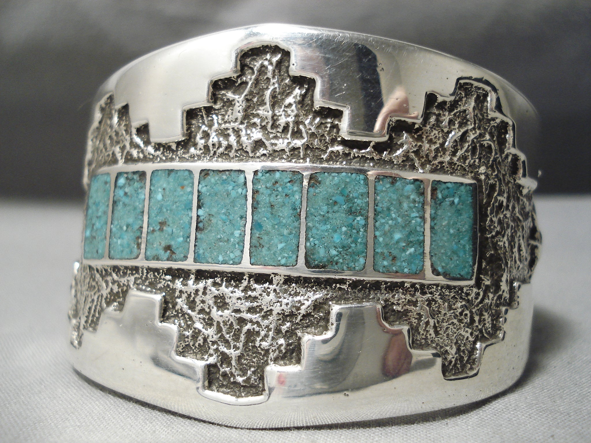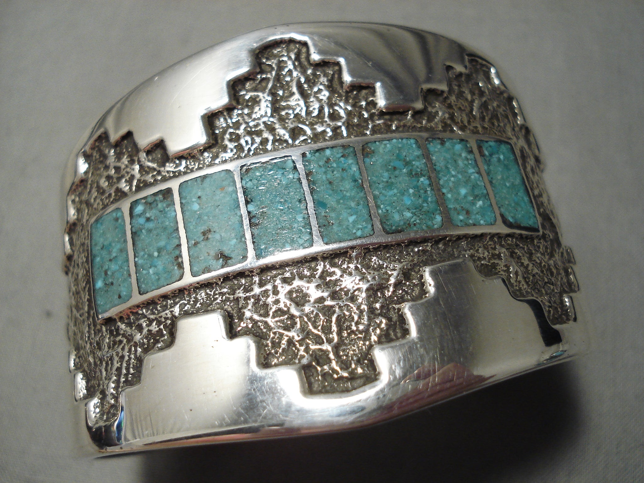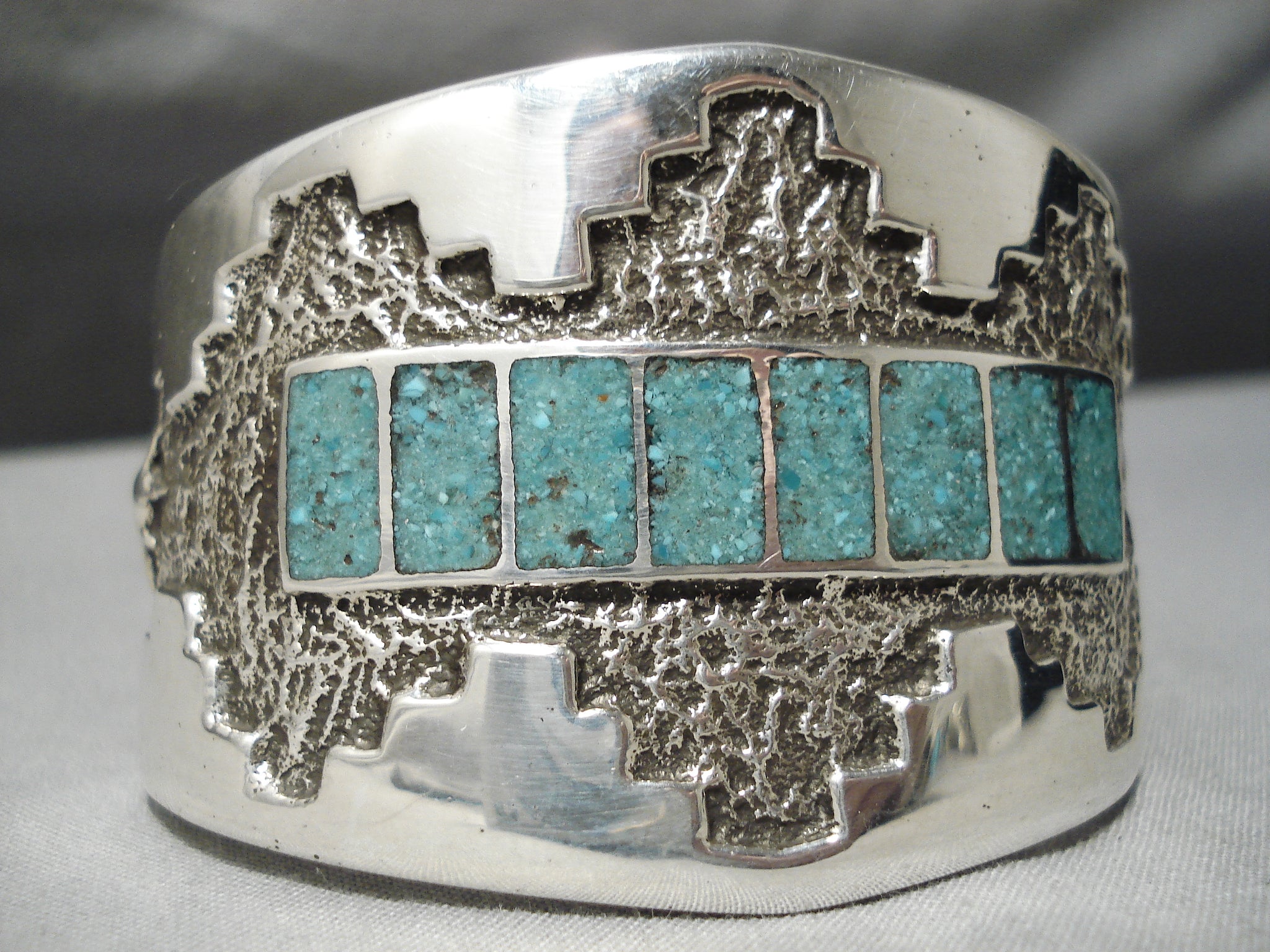 This is a tremendous vintage Navajo inlaid silver bracelet. This piece is very large and heavy and consists of remarkable inlaid channeled turquoise. The inlay is situated in large hand carved pueblo geometric patterns. The cuff is very thick and sturdy. The width of the bracelet measures around 1-3/4". Signed by Navajo artist, Del Arviso. Sterling silver, marked. Cir. 1970's+. The inside end to end measures around 5-1/2" with an additional 1-1/4" gap. Sturdy 127 grams.