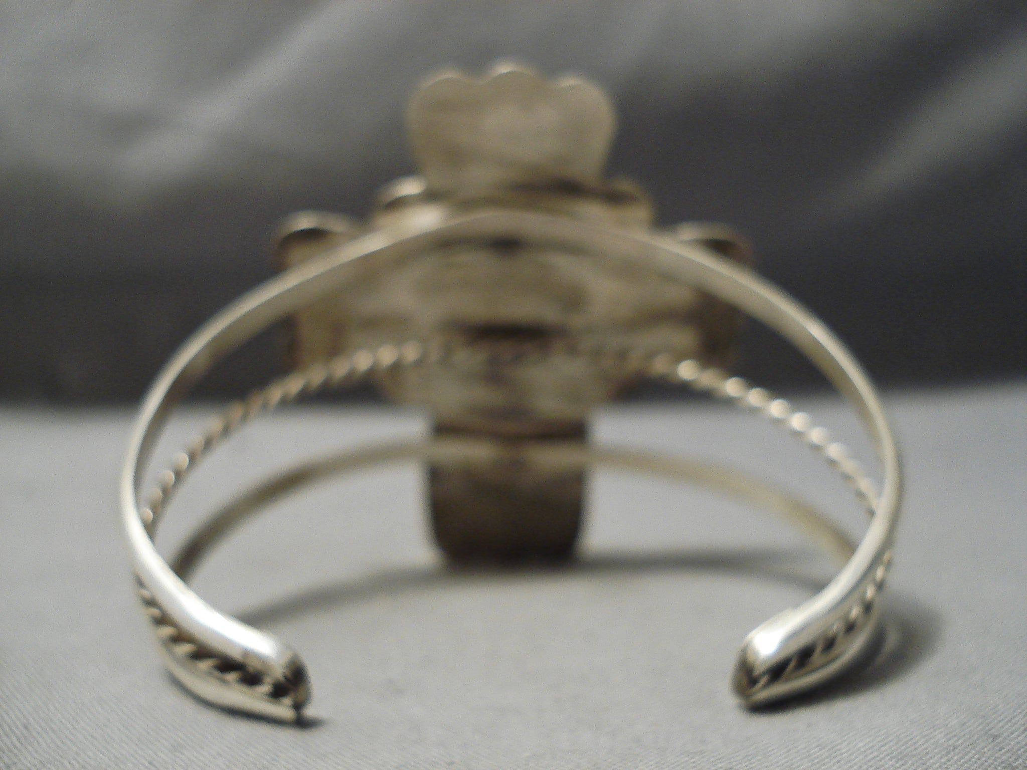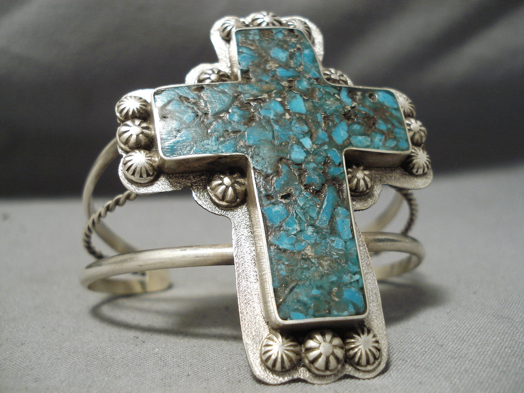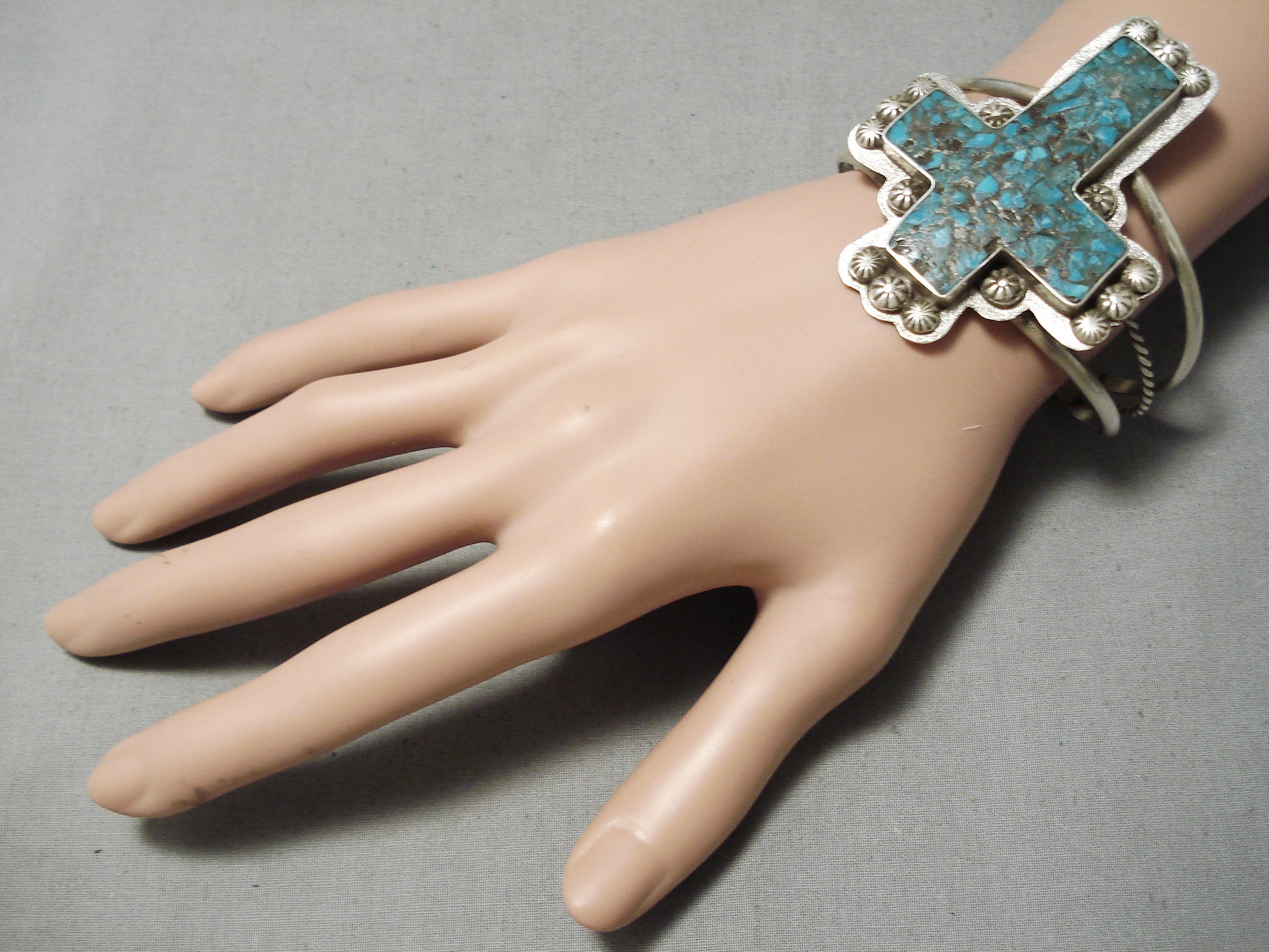 Huge Towering Vintage Native American Navajo Turquoise Cross Christian Sterling Silver Bracelet