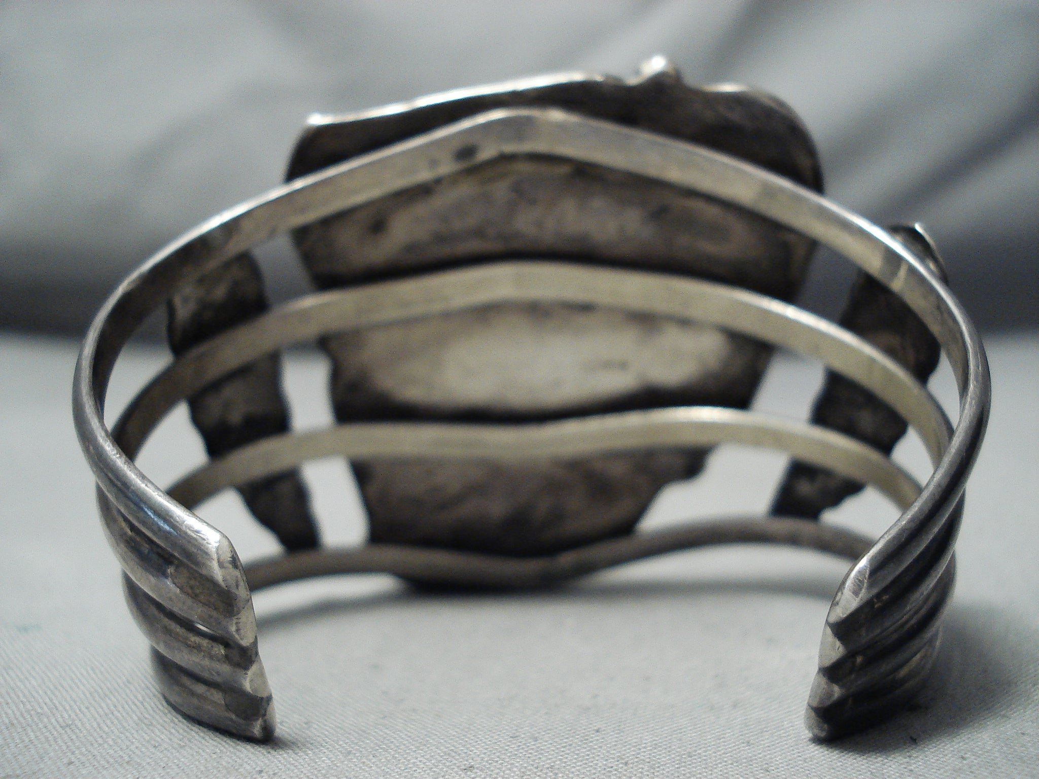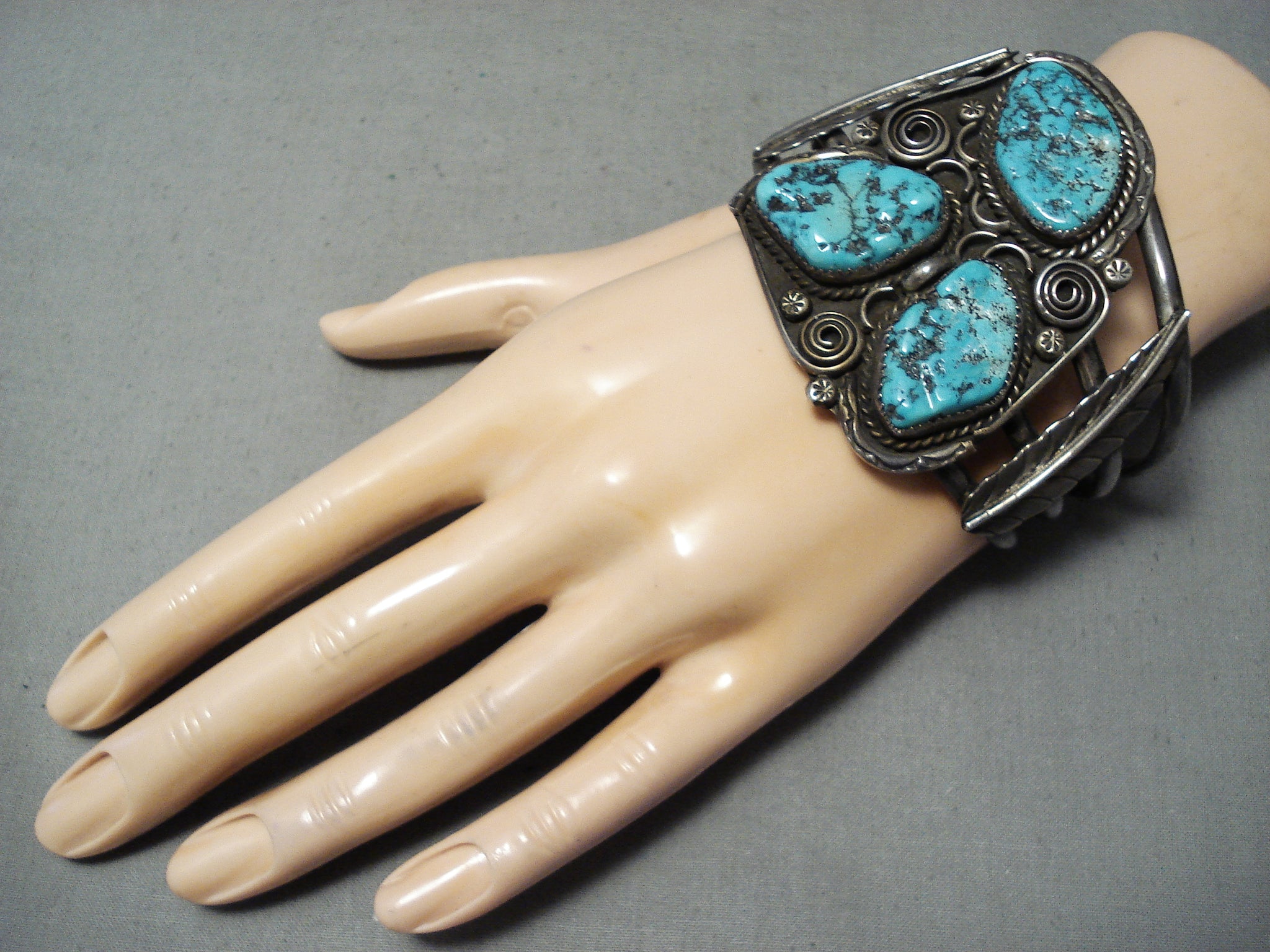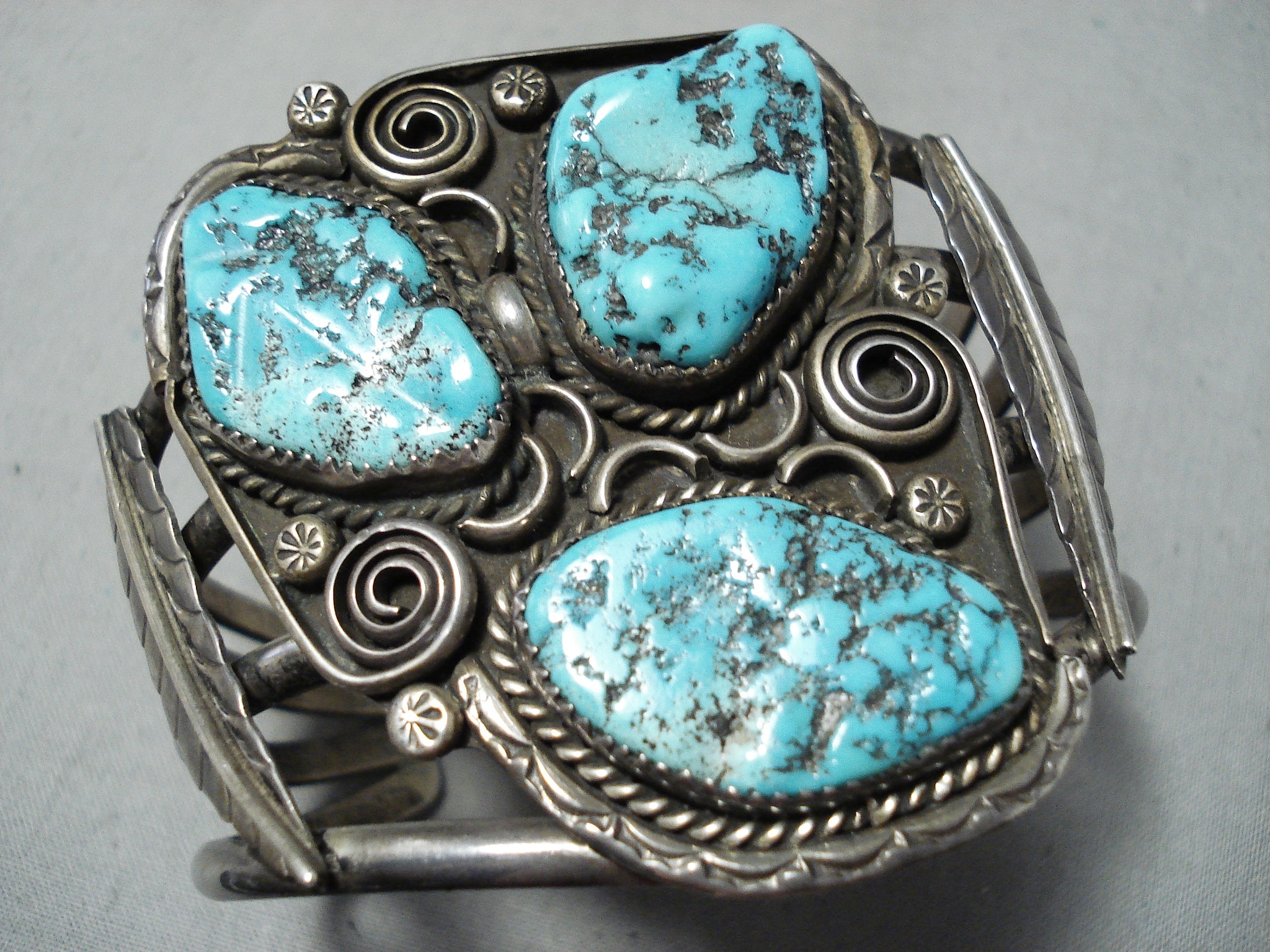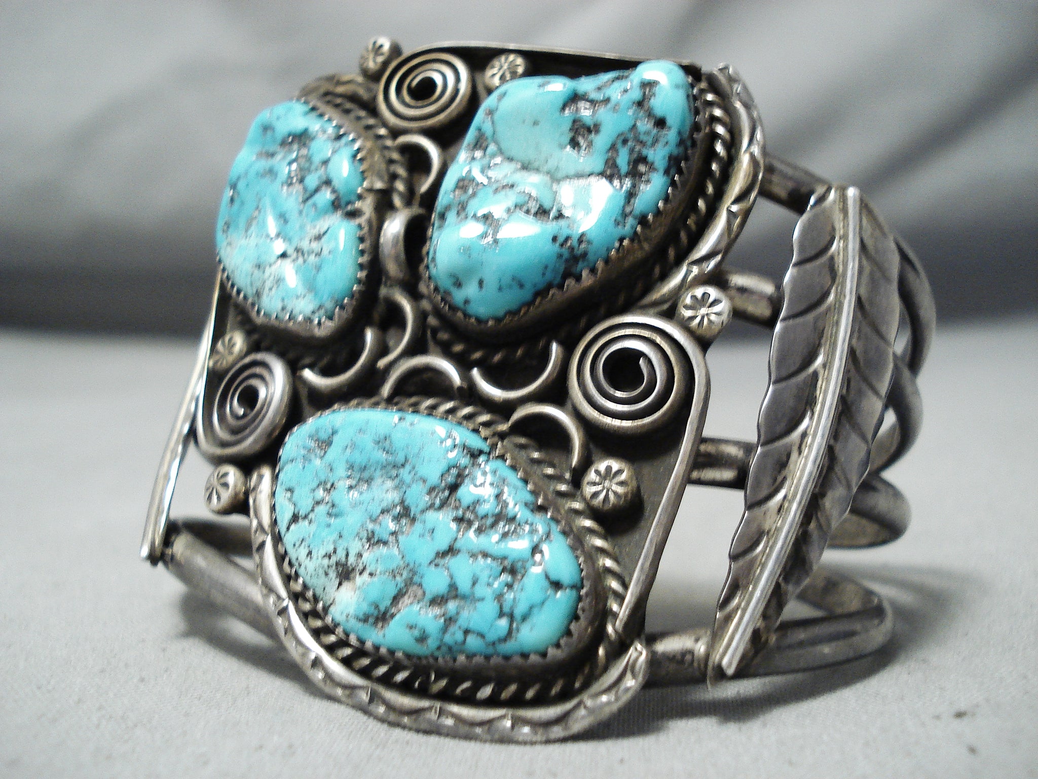 Huge Triple Nugget Turquoise Vintage Native American Navajo Sterling Silver Bracelet