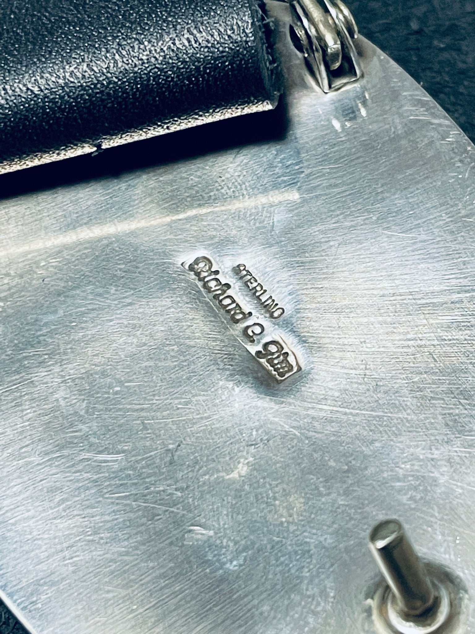 This is a magnificent vintage Navajo very heavy and thick turquoise silver concho belt. This mind blowing concho belt contains 8 impeccable large silver conchos with a matching large silver buckle. The average stone measures a whopping 2-3/8" X 2". This belt contains 9 wonderful turquoise stones that are large and thick and appear to be from the phenomenal Morenci turquoise mine. I absolutely love this very thick and heavy silver concho belt. The total length of this belt measures around 46" long. Signed by Navajo artist, Richard Jim. Sterling silver, marked. Sturdy 708 grams.