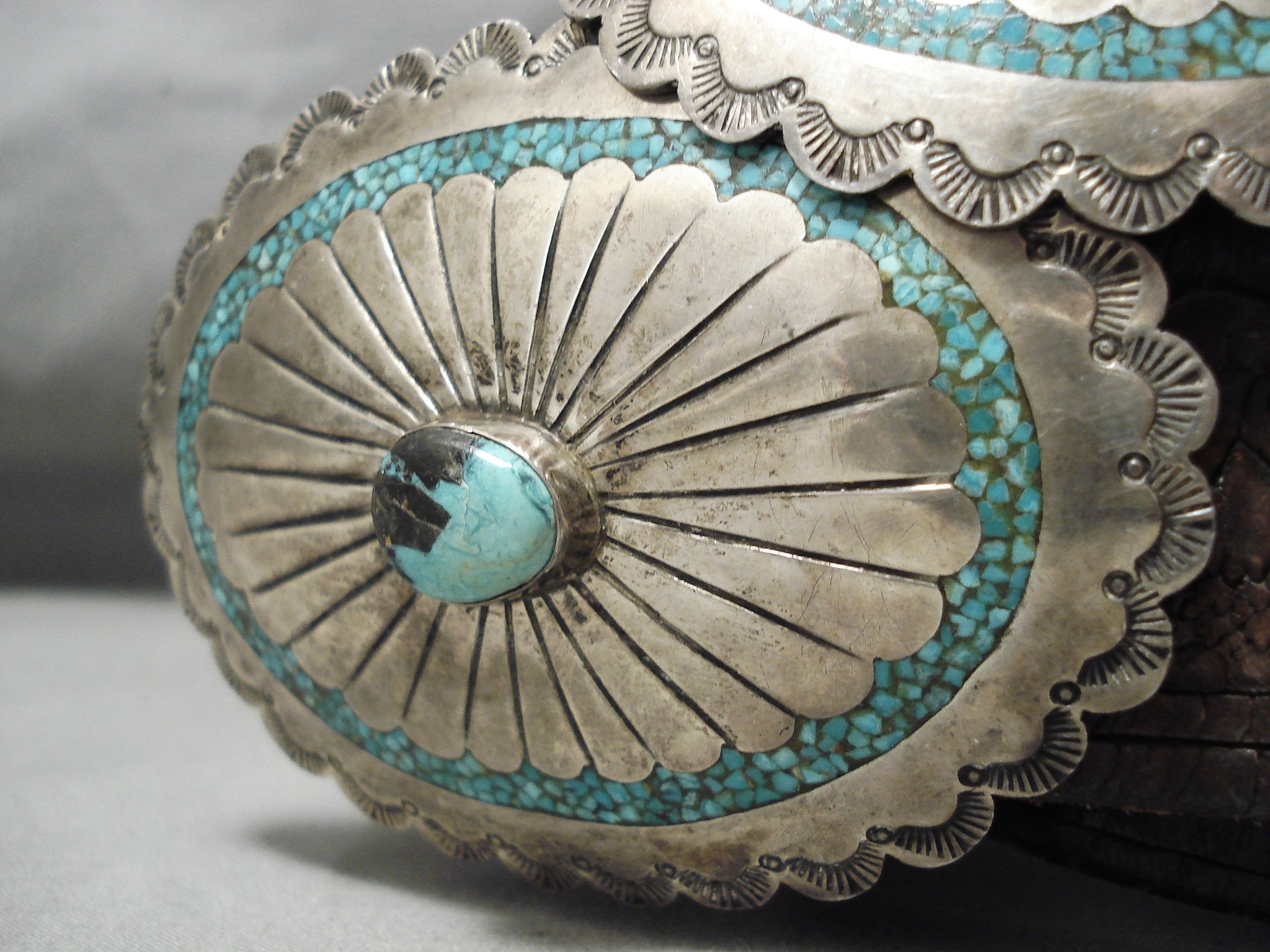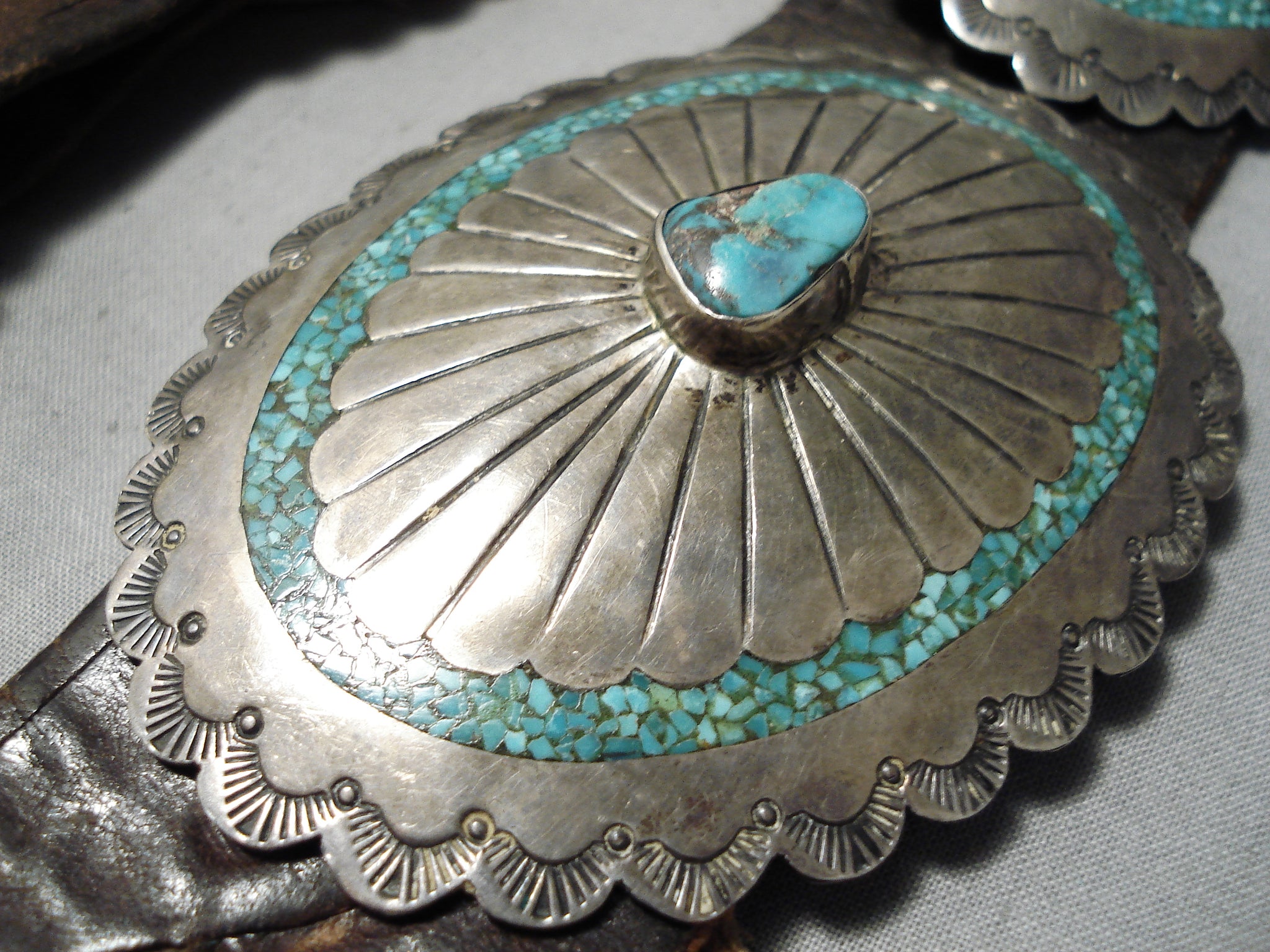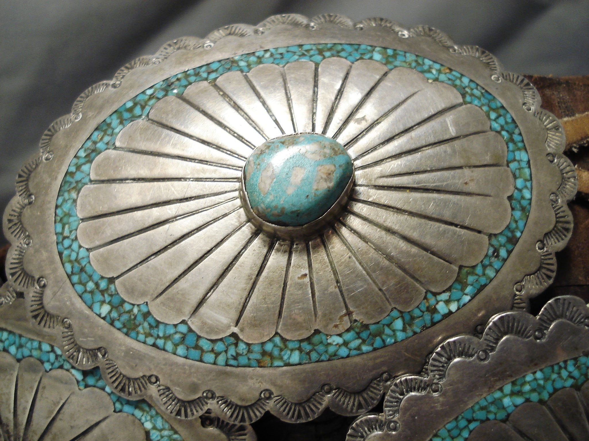 Huge Very Unique Vintage Native American Navajo Sterling Silver Turquoise Inlay Concho Belt Old
