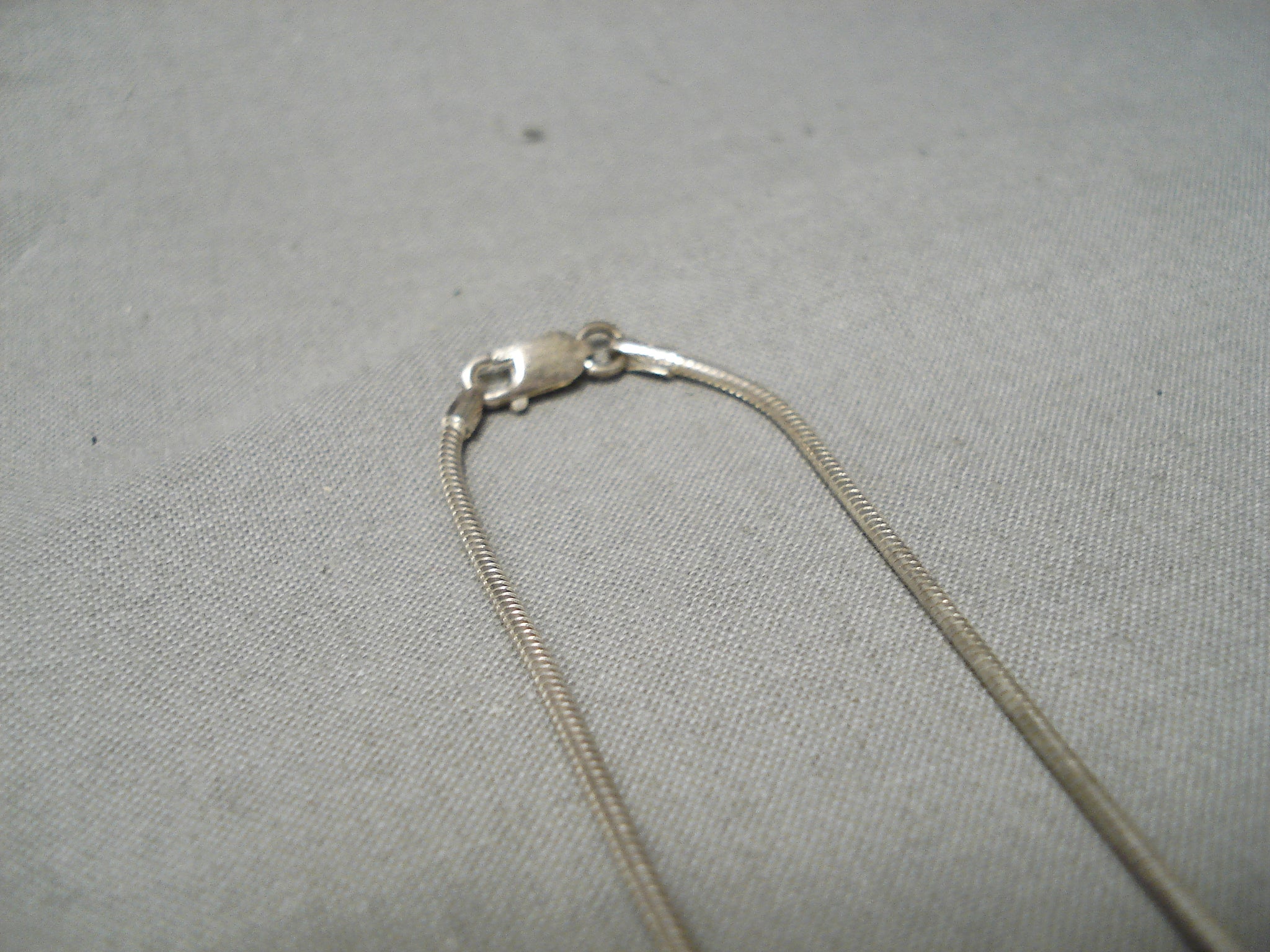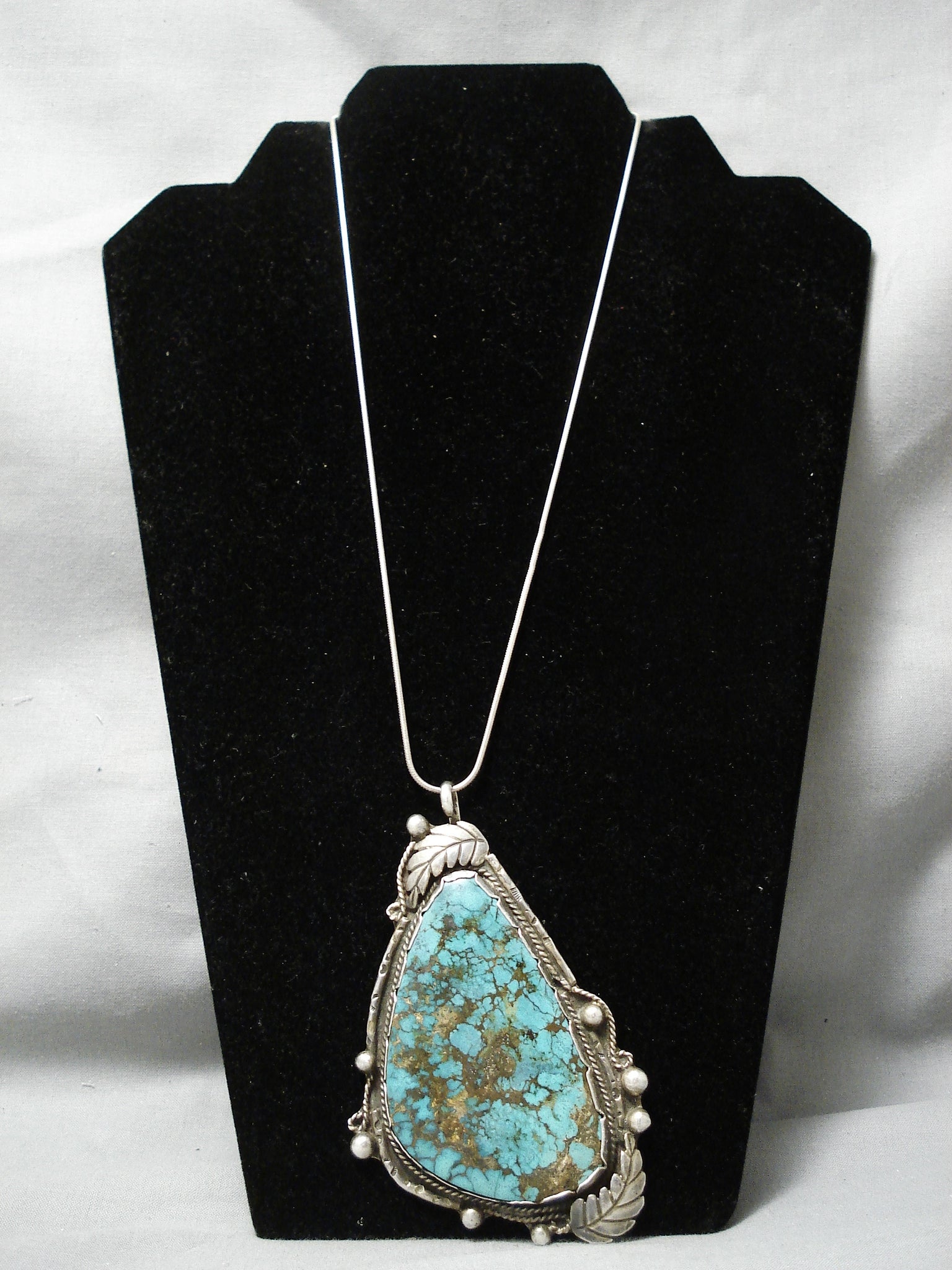 This is a magnificent vintage Navajo silver necklace. You’re not going to believe what mother nature has created here! This most remarkable, mesmerizing huge 2-1/8” x 1-3/4” spiderweb turquoise stone has been made into a pendant! In beautiful balance, it’s surrounded with silver rope and a marvelous border of silver applique leaves, swirling stems and berries! The pendant measures about 4” x 2-1/2” and has a ¼” bail opening to accommodate another chain you may already have – but it does come with this thick silver 19” snake chain with lobster clasp. Sterling silver. Signed by Navajo artist, W. Sturdy 88 grams.