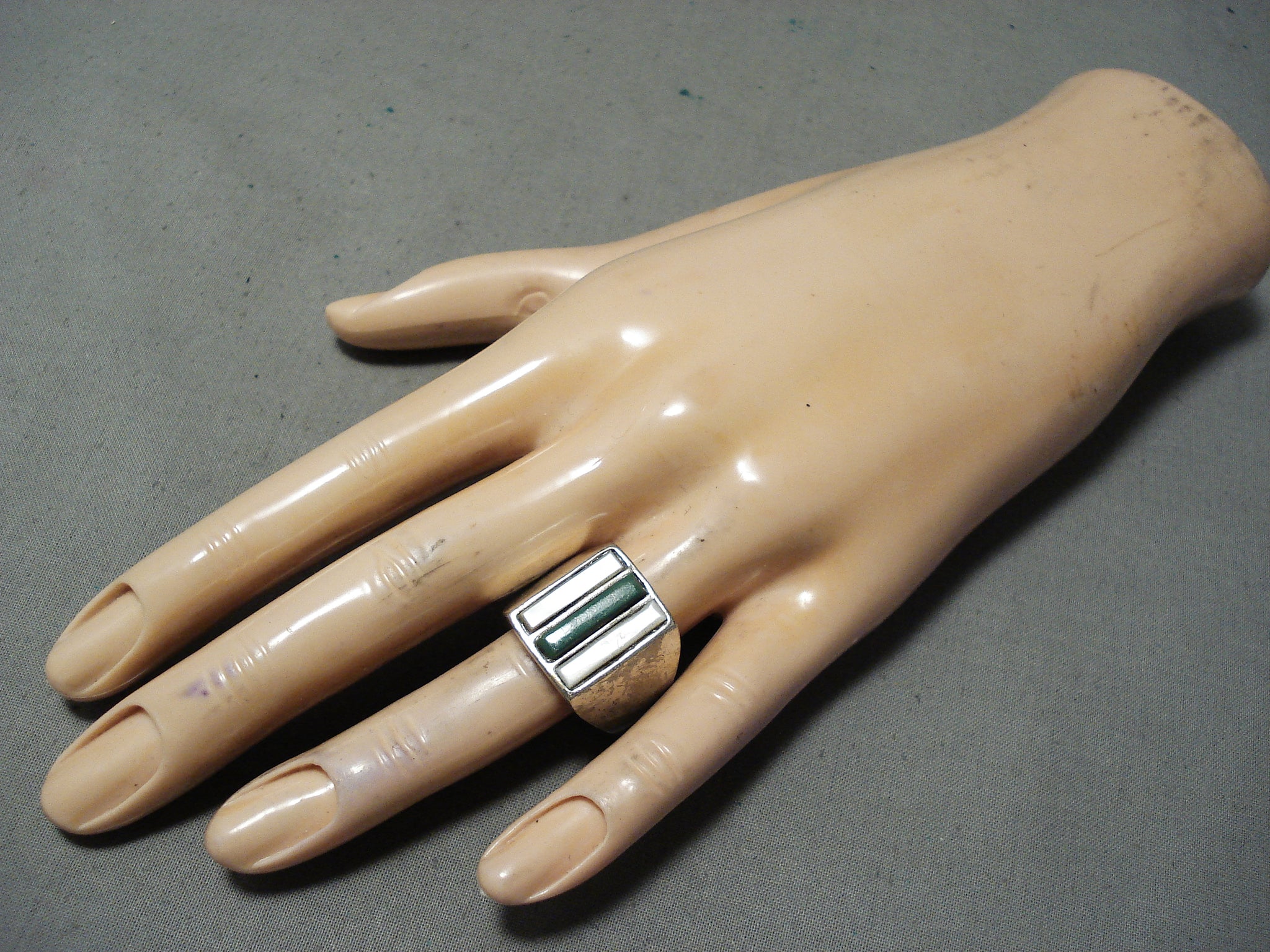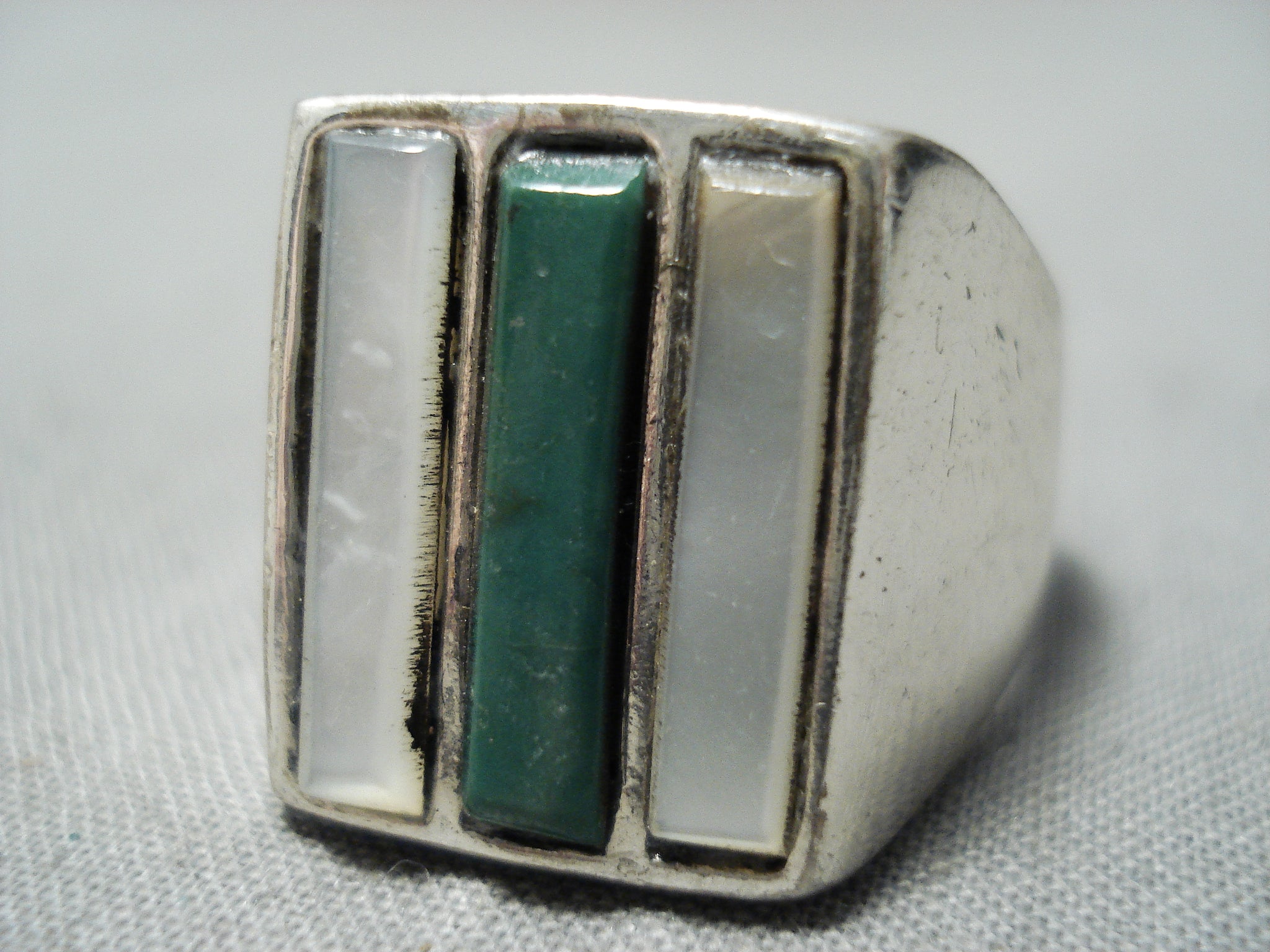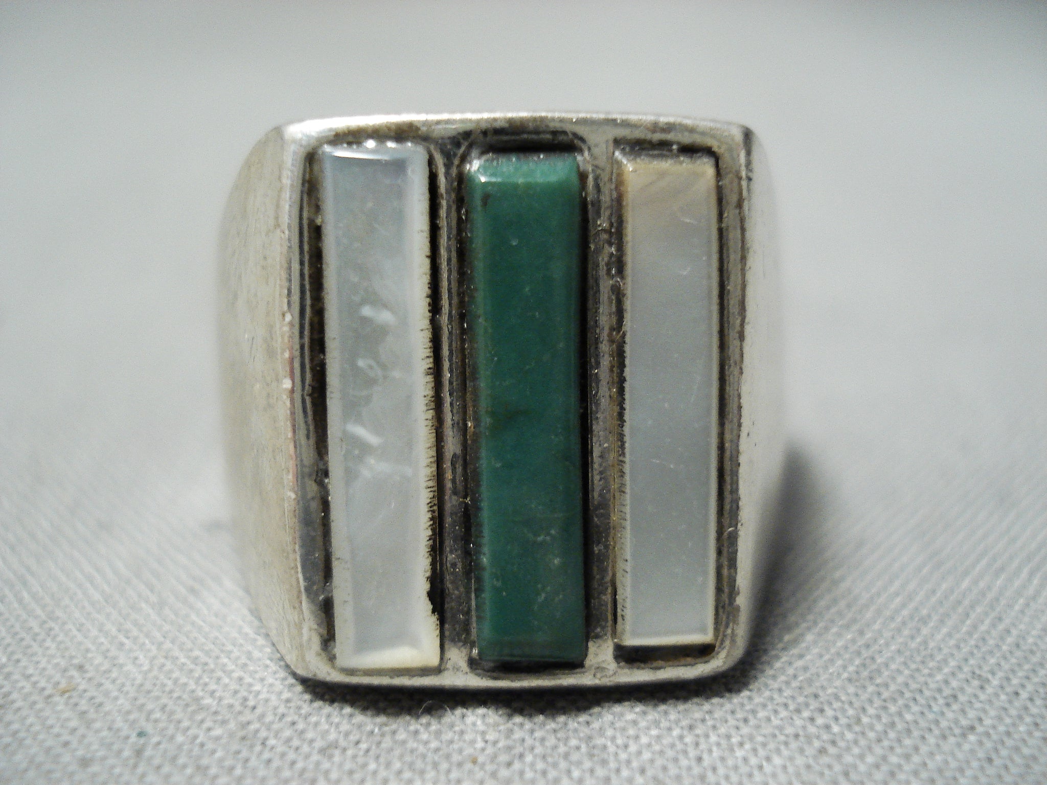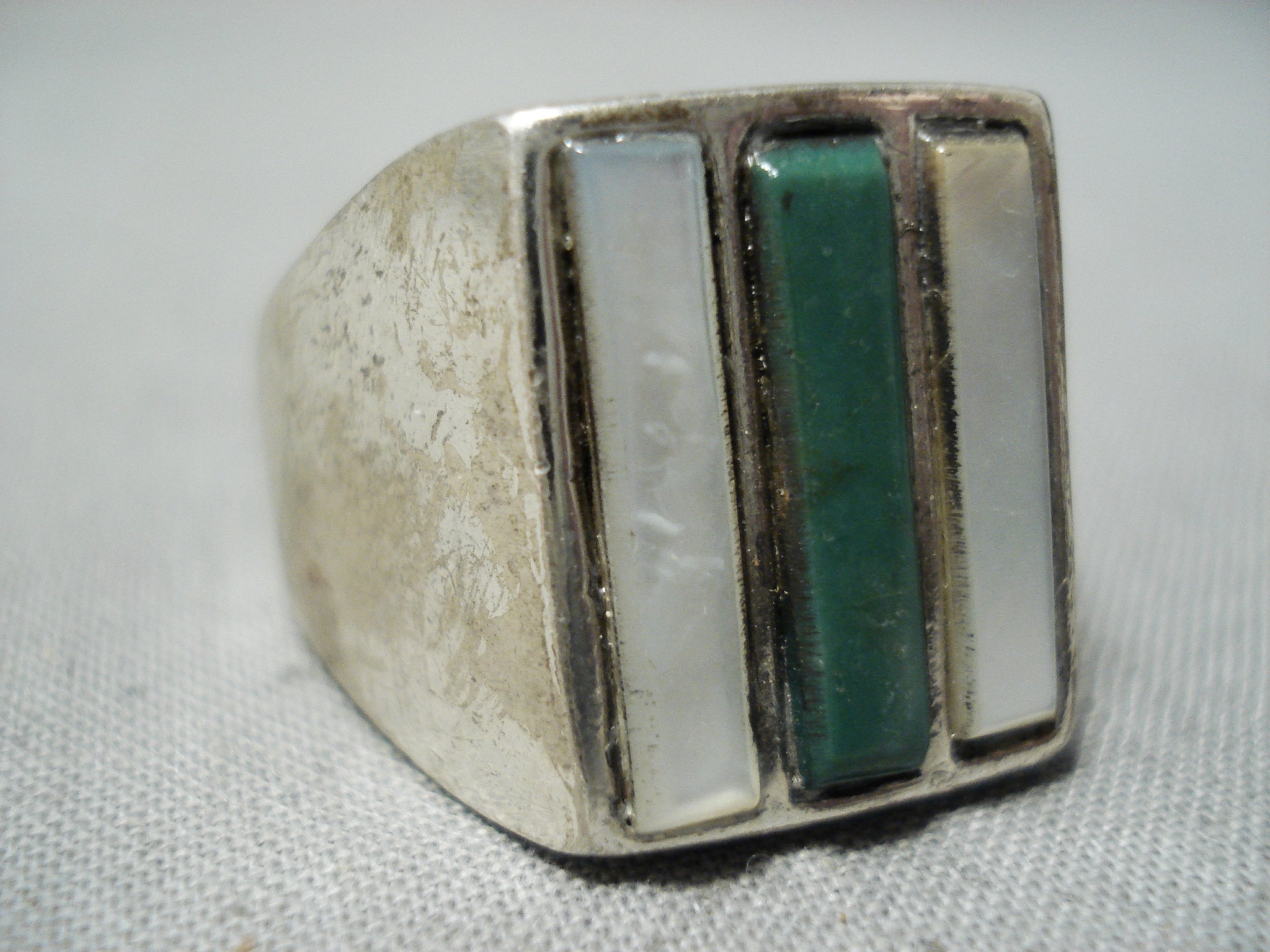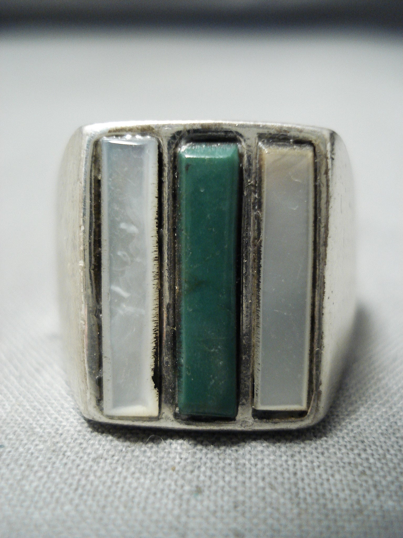 This is a superior vintage Navajo inlaid silver ring. This ring is beautiful and contains three inlaid stones and shells that consist of 2 mother of pearl shells and a wonderful center Cerrillos turquoise stone. The ring is very thick and sturdy. The ring face measures around 3/4" x 3/4". The ring size is around 11.5. Cir. Mid century . Sterling silver. Sturdy 12 grams.