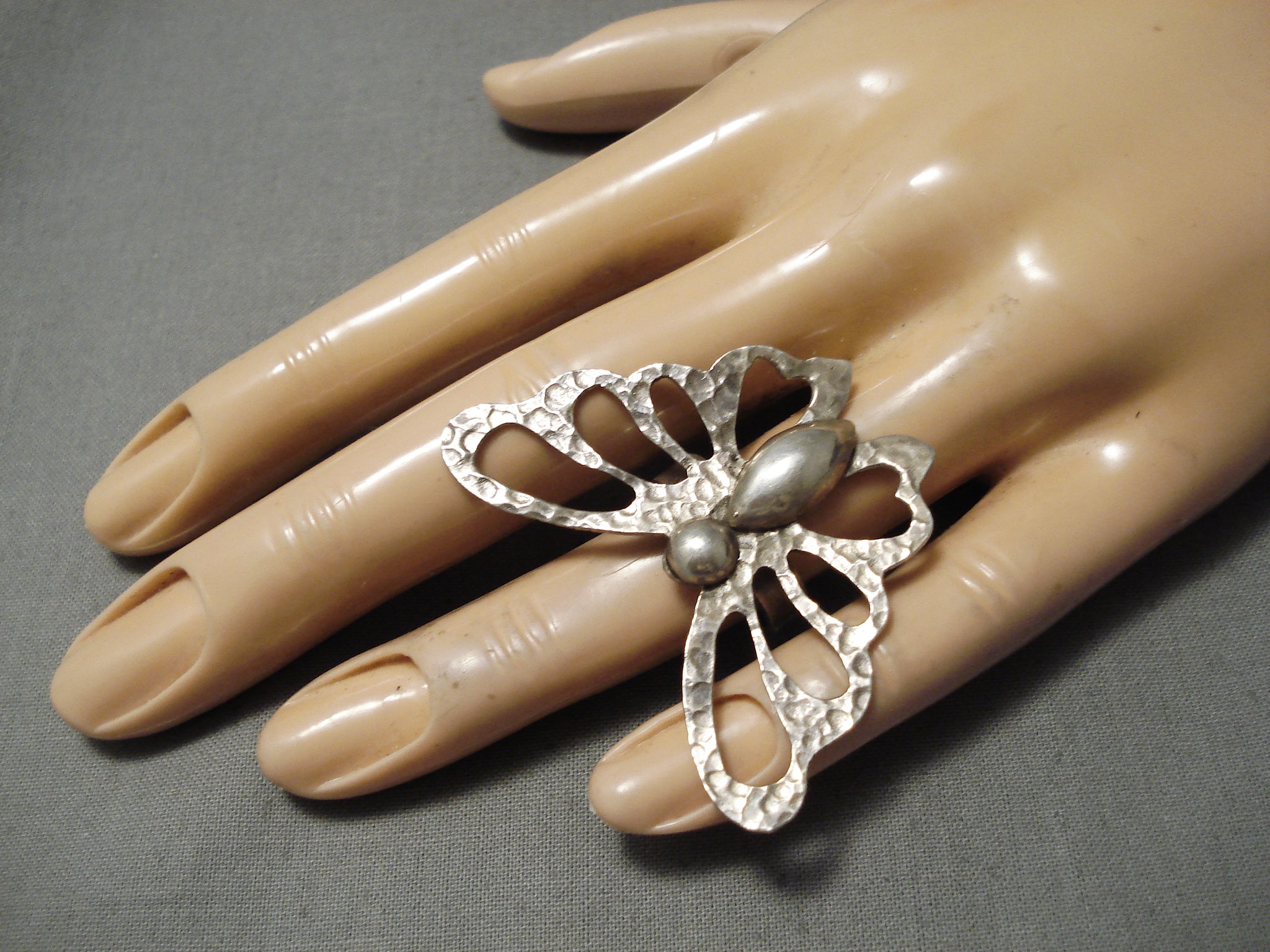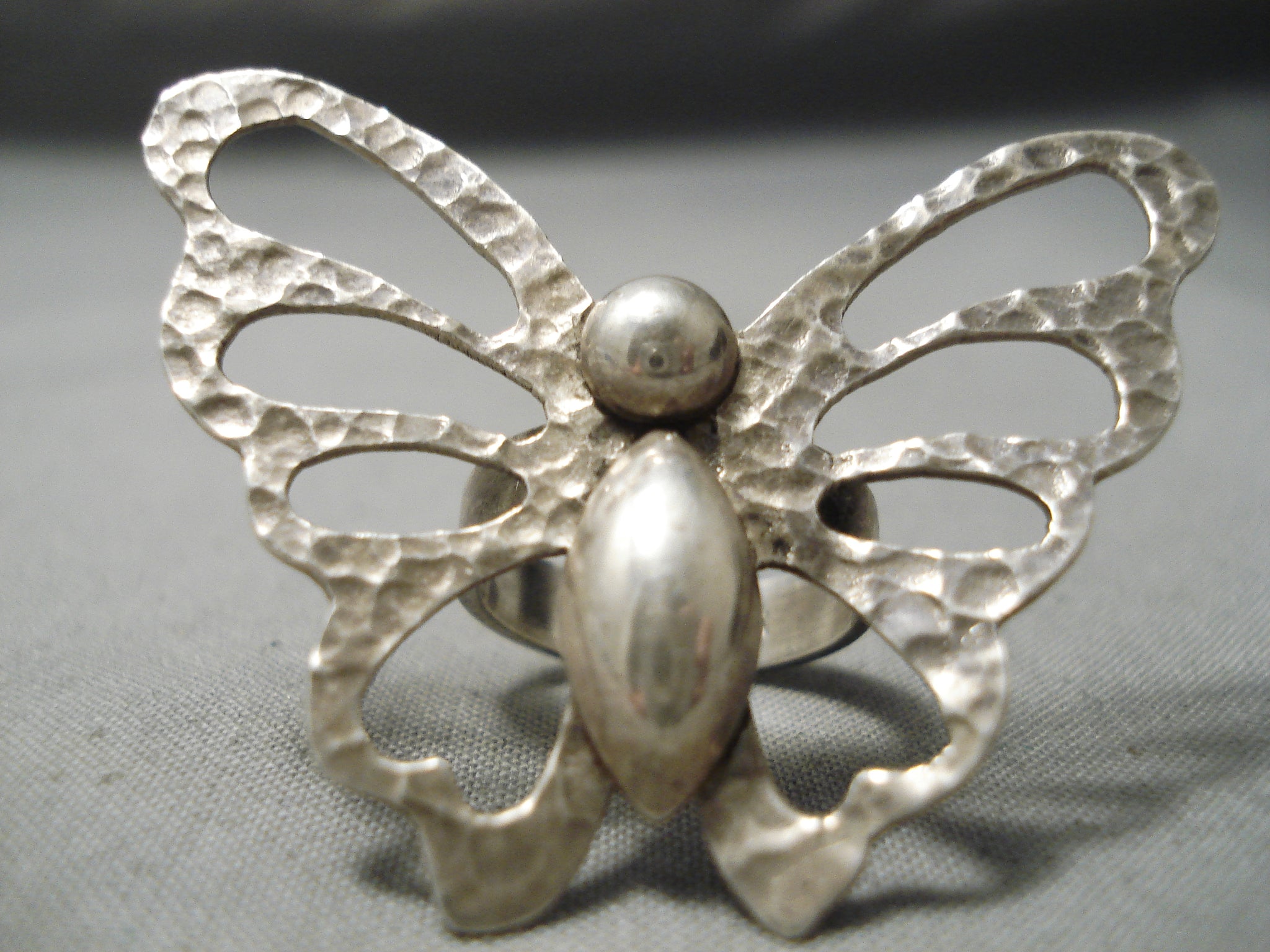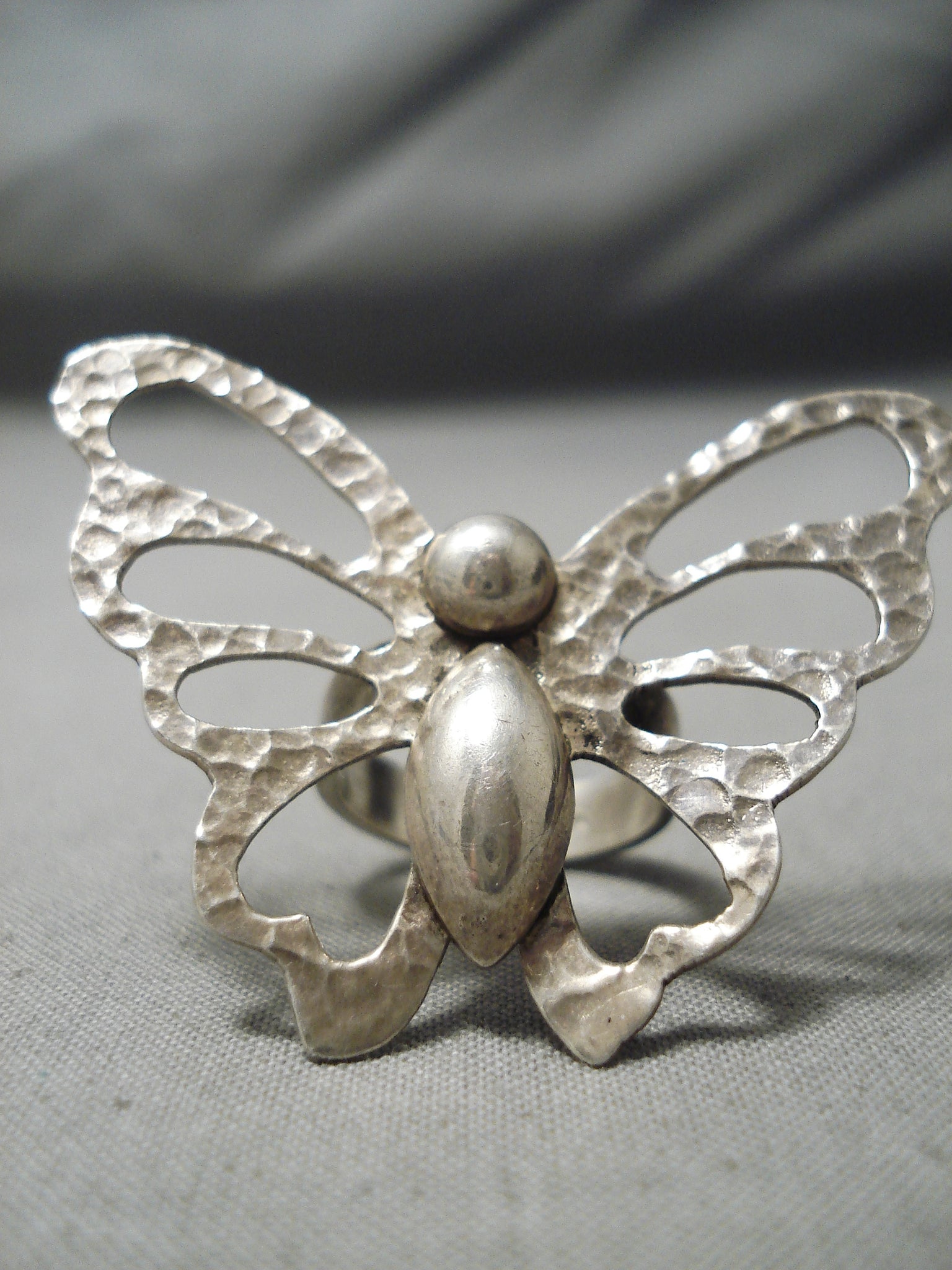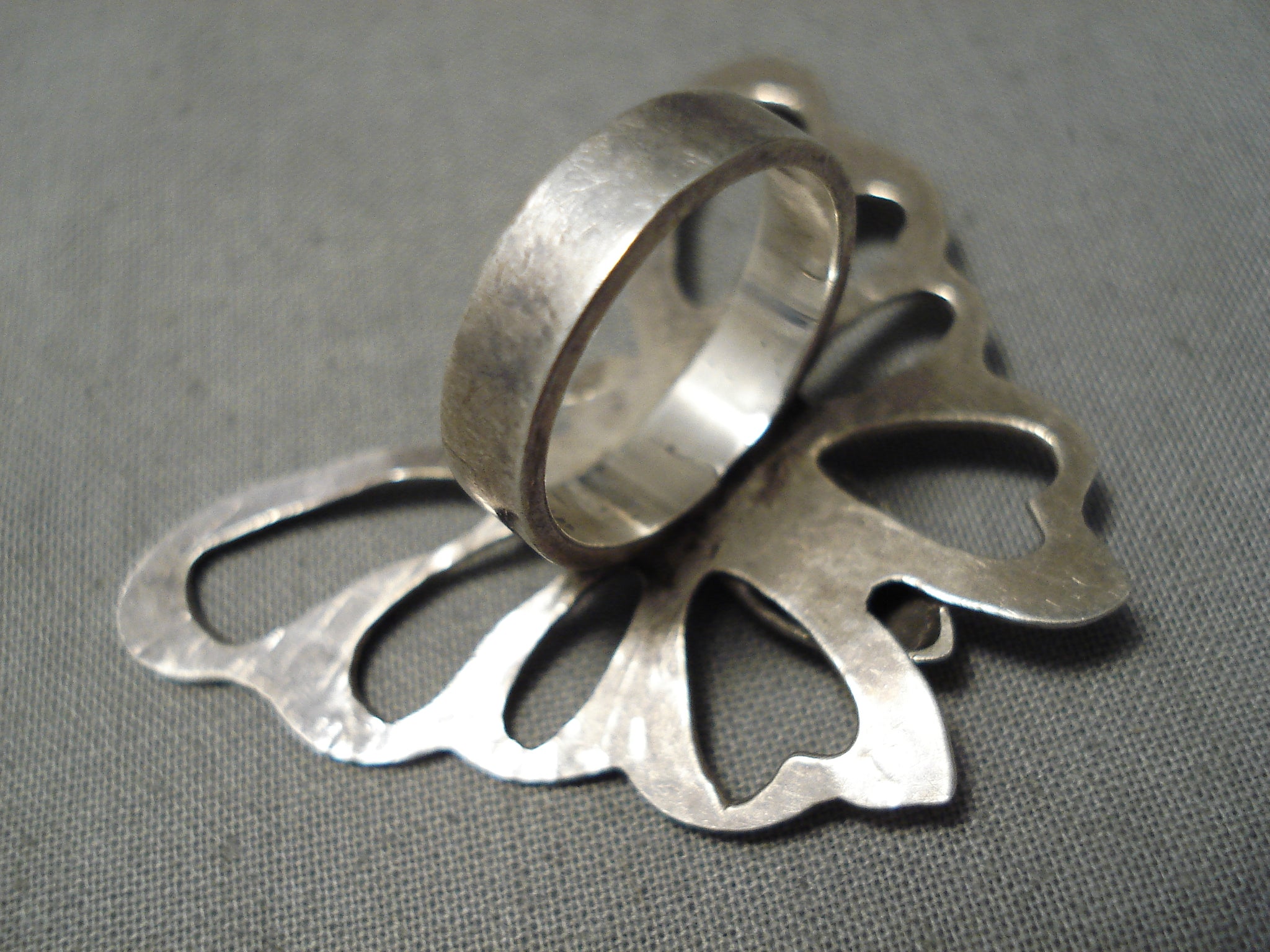Huge Vintage Native American Navajo Hand Tooled Butterfly Sterling Silver Ring