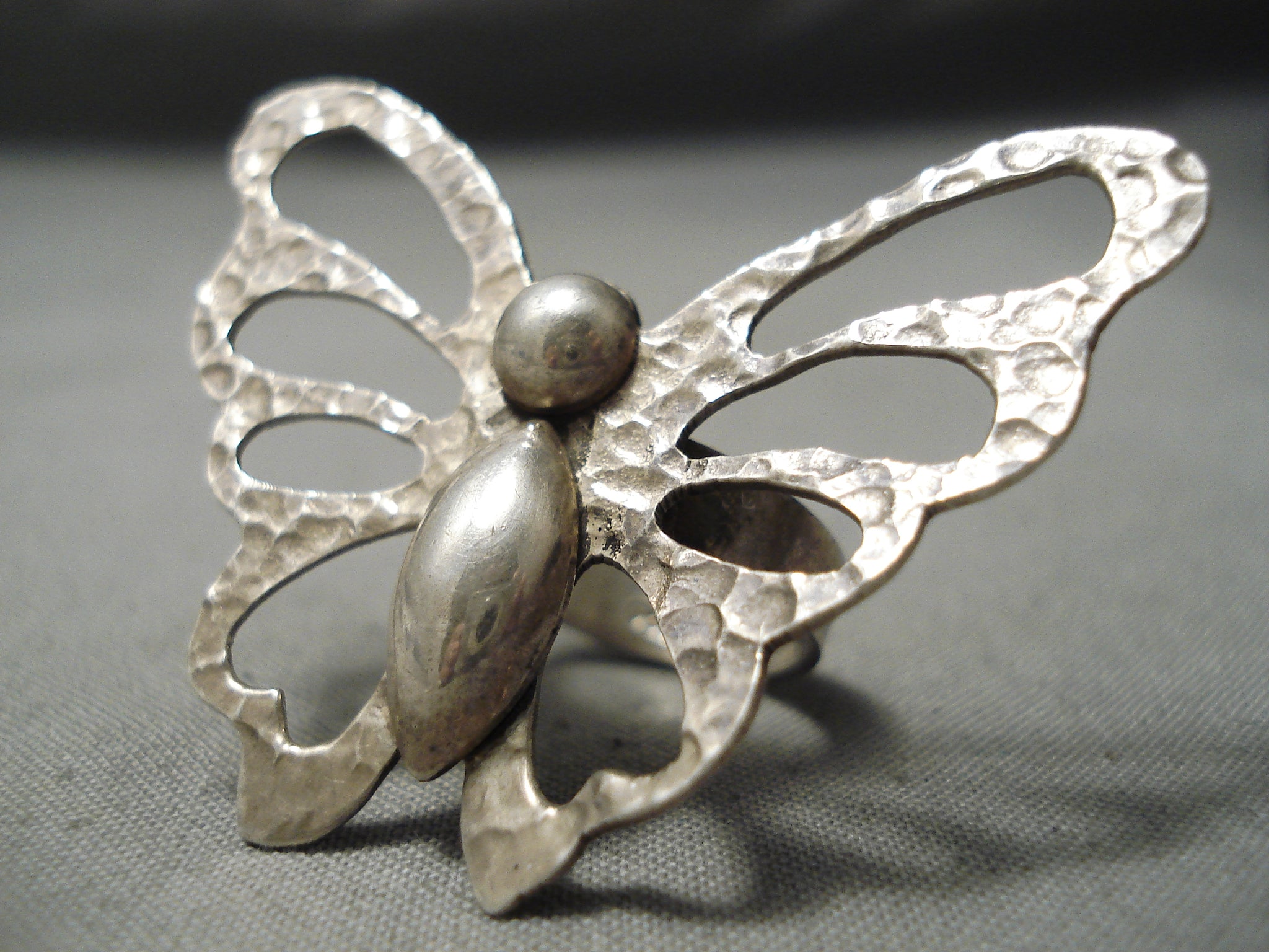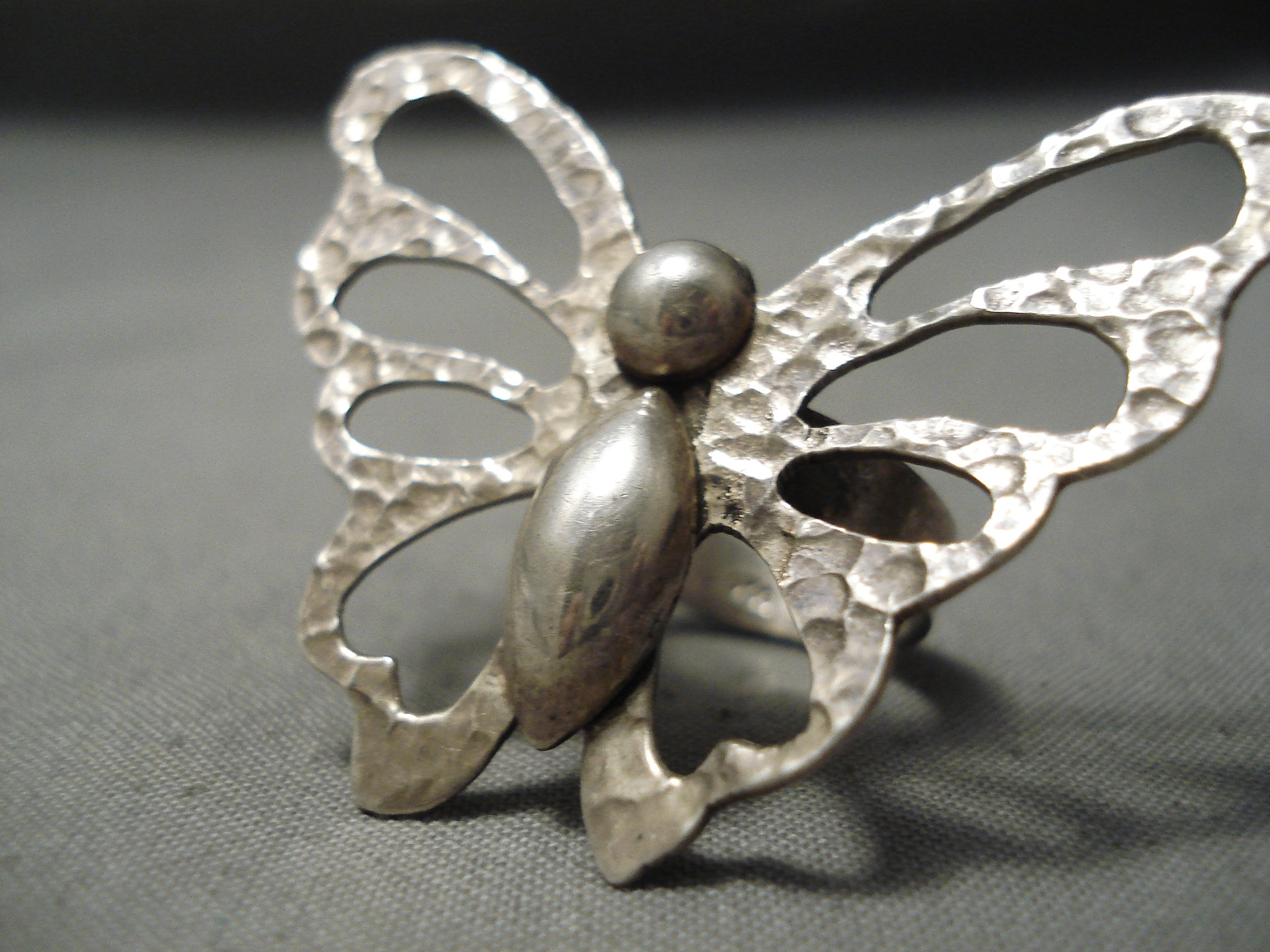 This is a fabulous vintage Navajo/ Mexican silver ring. The wings of this large peaceful dimensional butterfly are done in an expressive open-cut, textured design that really adds that extra touch to the beautiful ring. The ring face measures around 1-3/4" x 1-3/8". The ring size is around 5-1/2. Sterling silver, marked. Sturdy 10 grams.