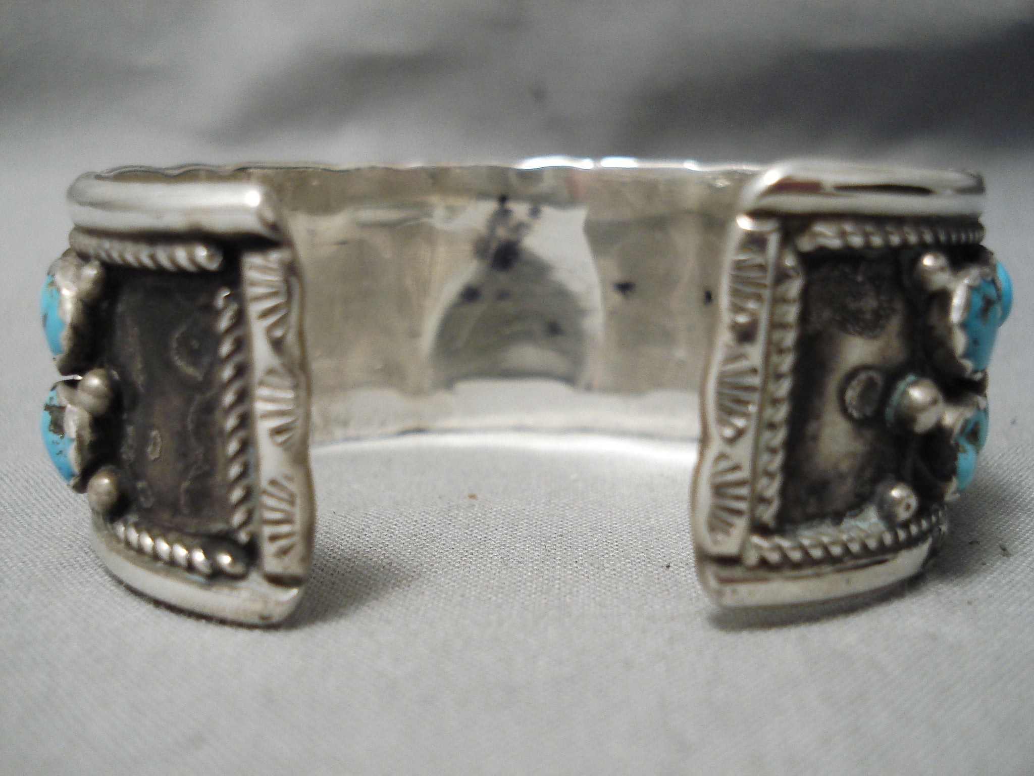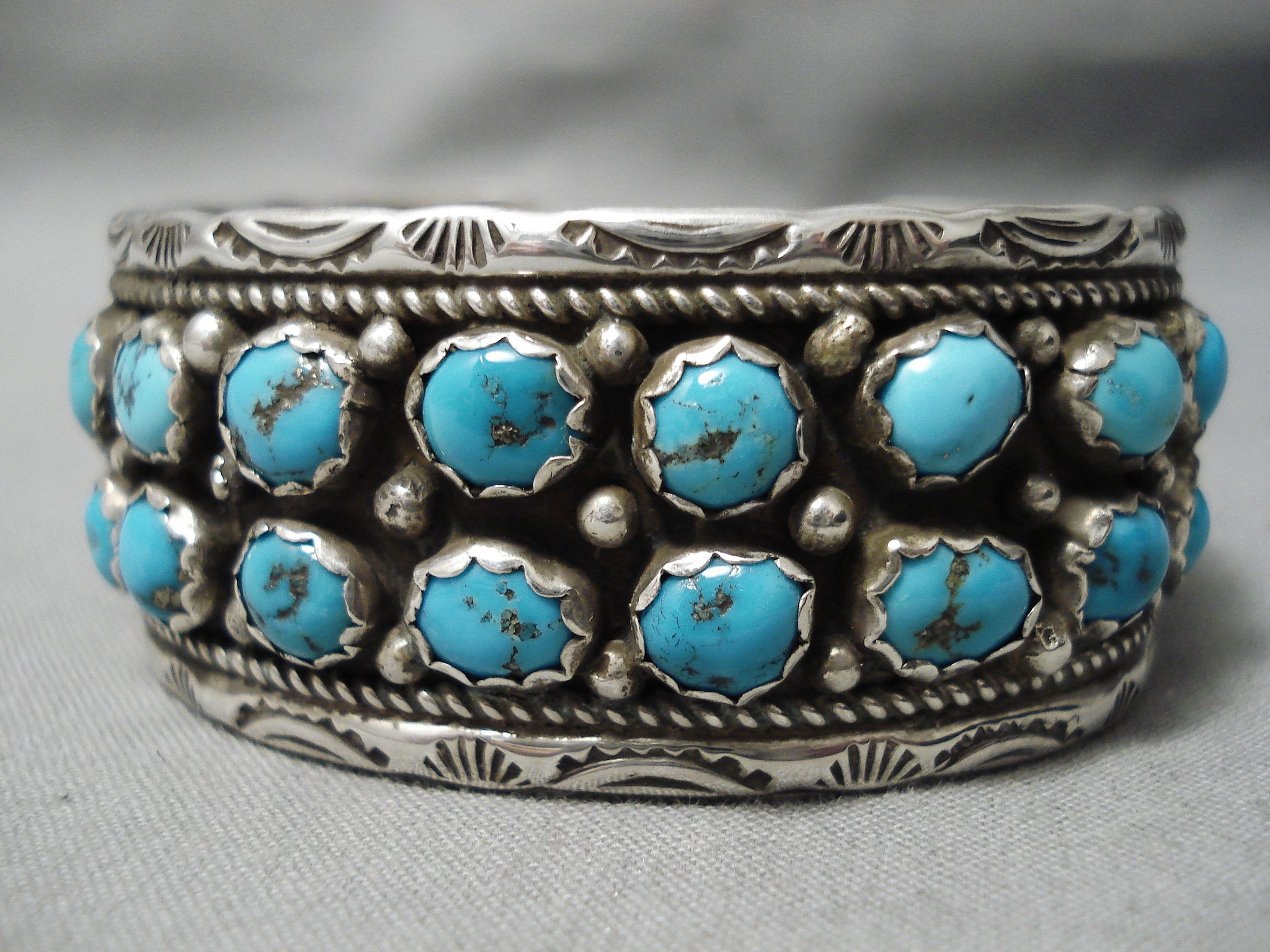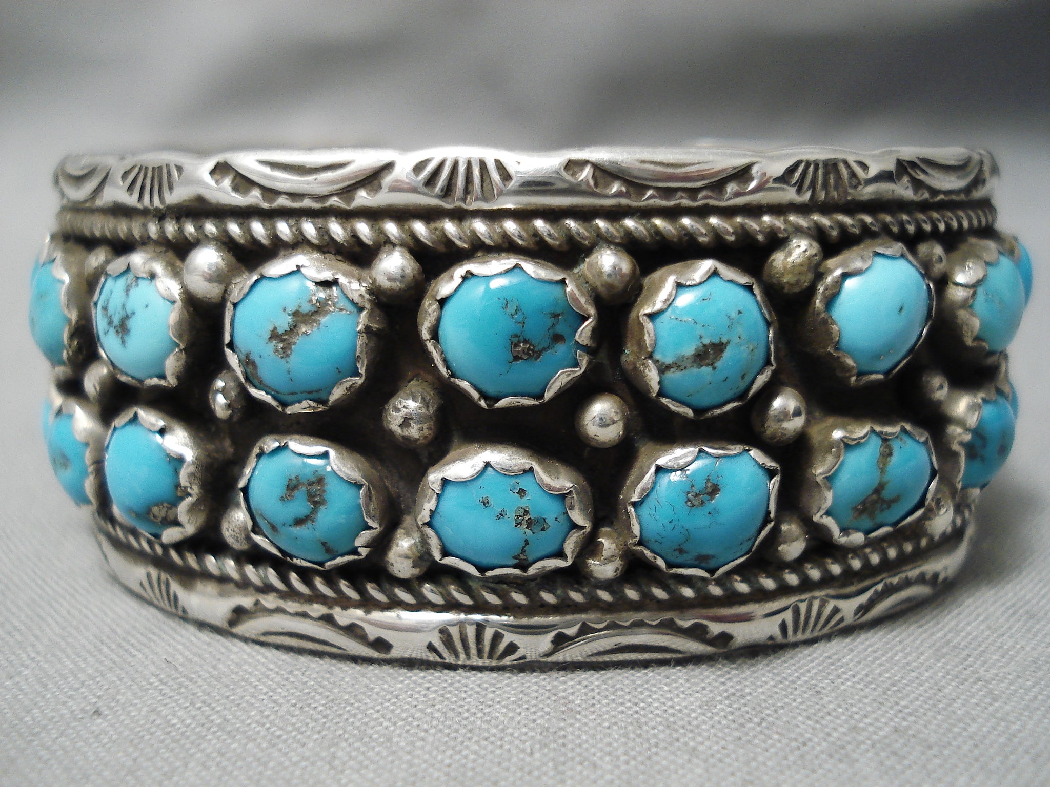 Huge Vintage Native American Navajo Old Blue Turquoise Sterling Silver Wave Bracelet Old