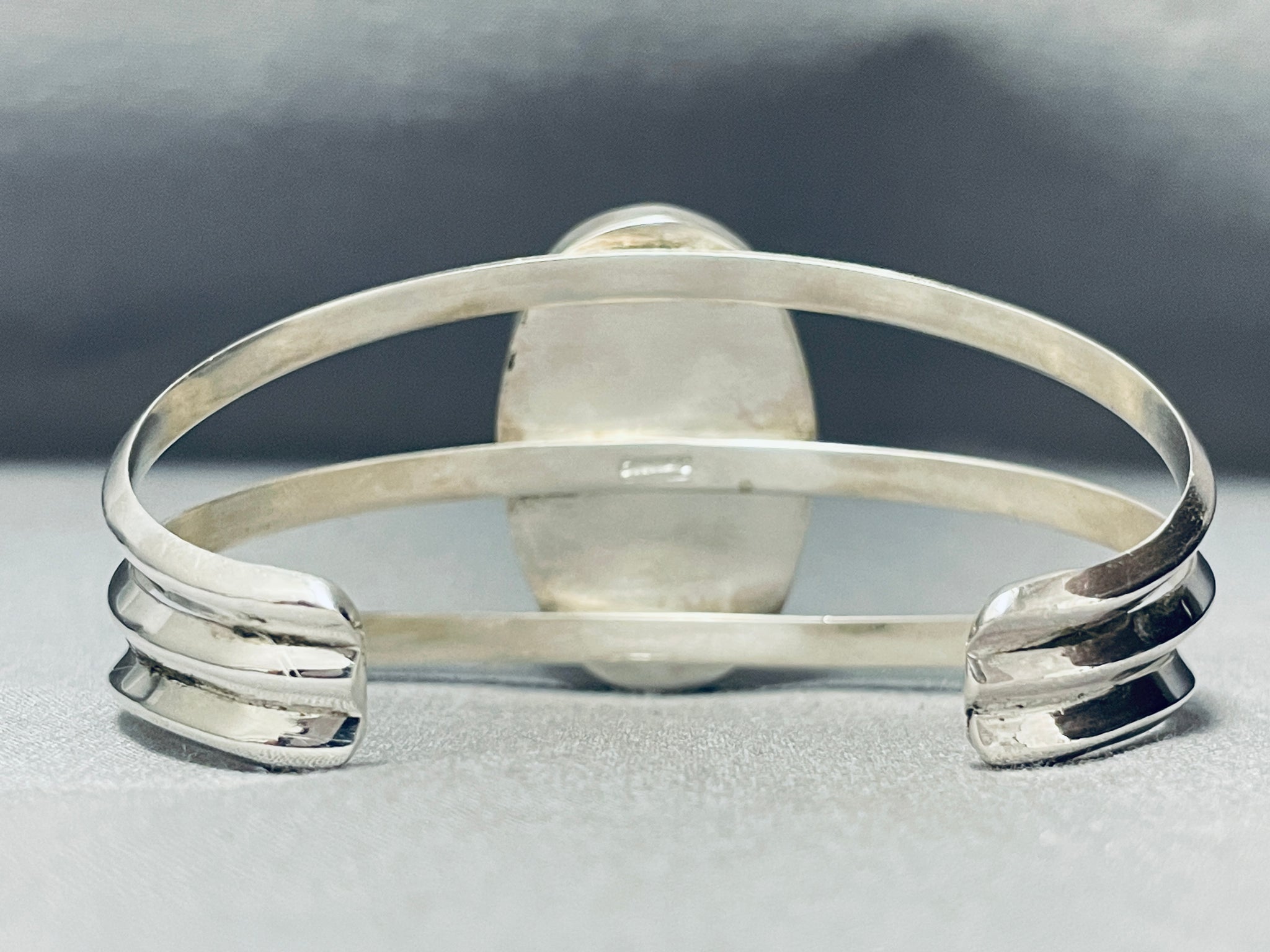 This is a striking vintage Navajo large single stone silver bracelet. This bracelet contains a gigantic center dome shaped Royston turquoise stone. The bracelet consists of a phenomenal large sturdy triple silver shank cuff that graduates in width towards the center. The center stone measures around 1-1/2" x 1". The width of the bracelet measures around 1-1/2". Sterling silver, marked. Cir. Mid century . The inside end to end measures around 5-3/4" with an additional 1-1/4" gap. Sturdy 37 grams.