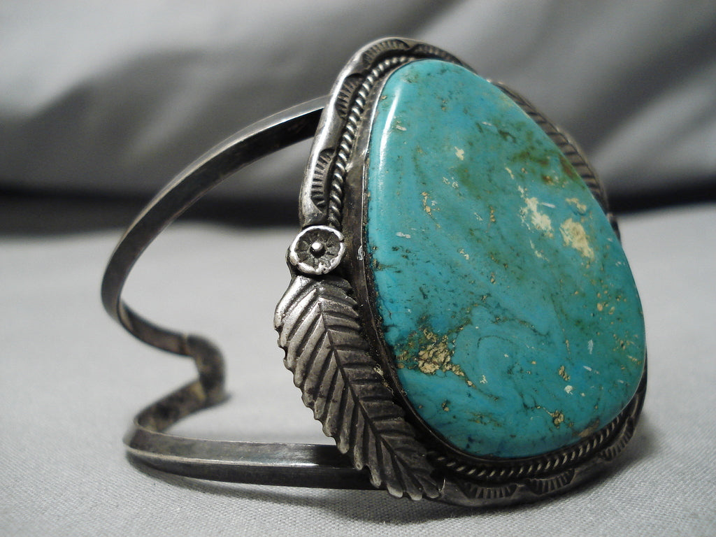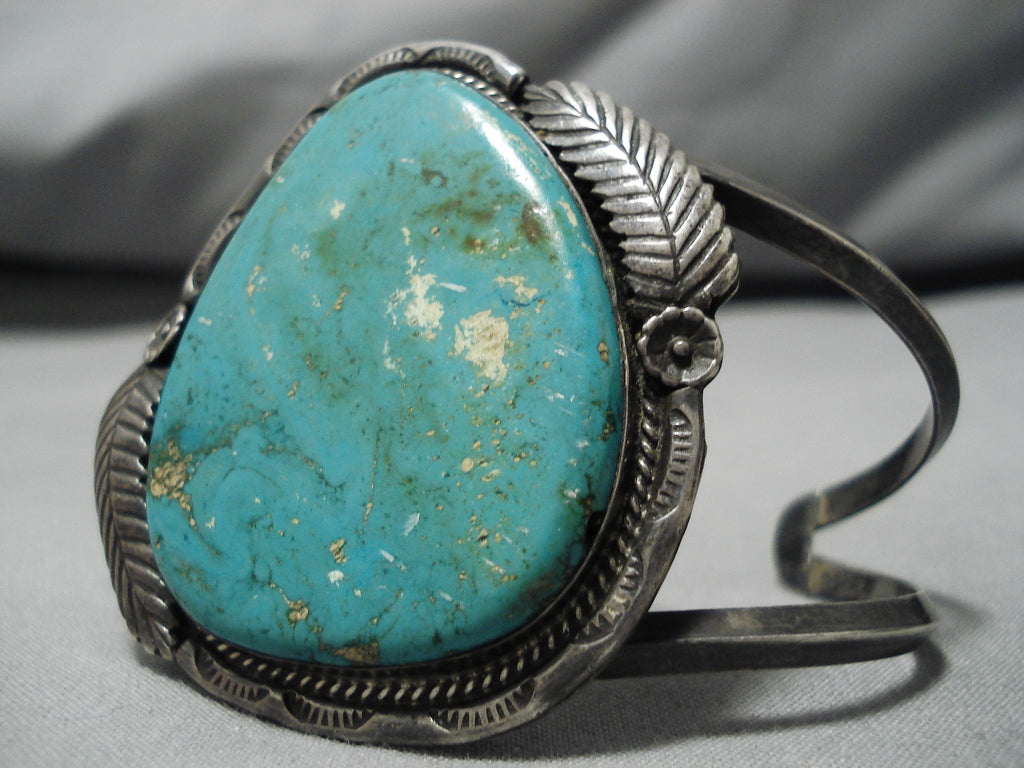 This is a remarkable vintage Navajo huge single stone silver bracelet. This piece contains a large center turquoise stone appearing to be from the stunning old Royston turquoise mine. Surrounding the stone are marvelous silver works that consist of stamped sun patterns, ropes, flowers and hand carved silver leaves. This bracelet contains a double silver shank cuff. The center stone measures around 1-3/4" x 1-3/8". The width of the bracelet measures around 1-3/4". Sterling silver. Cir. Mid century . The inside end to end measures around 6" with an additional 1-1/4" gap. Sturdy 49 grams.