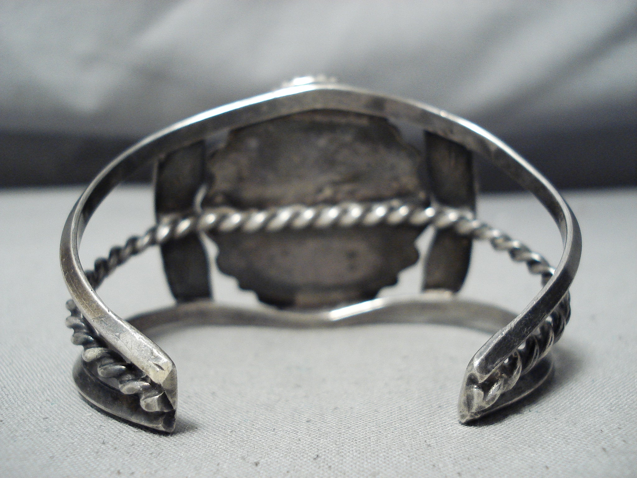 This is an incredible vintage Navajo single stone silver bracelet. This remarkable piece contains a beautiful center old Royston turquoise stone. Surrounding the stone are impeccable silver works that consist of raindrops, ropes, wave works and stem patterns. I love the thick and sturdy triple silver shank cuff with the center shank being coiled. Resting at the sides of the bracelet are amazing sun stamped silver flanks. The center stone measures around 1-3/8" x 7/8". The width of the bracelet measures around 1-3/4". Sterling silver. Cir. Mid century . The inside end to end measures around 5-1/4" with an additional 1-1/4" gap. Sturdy 47 grams.