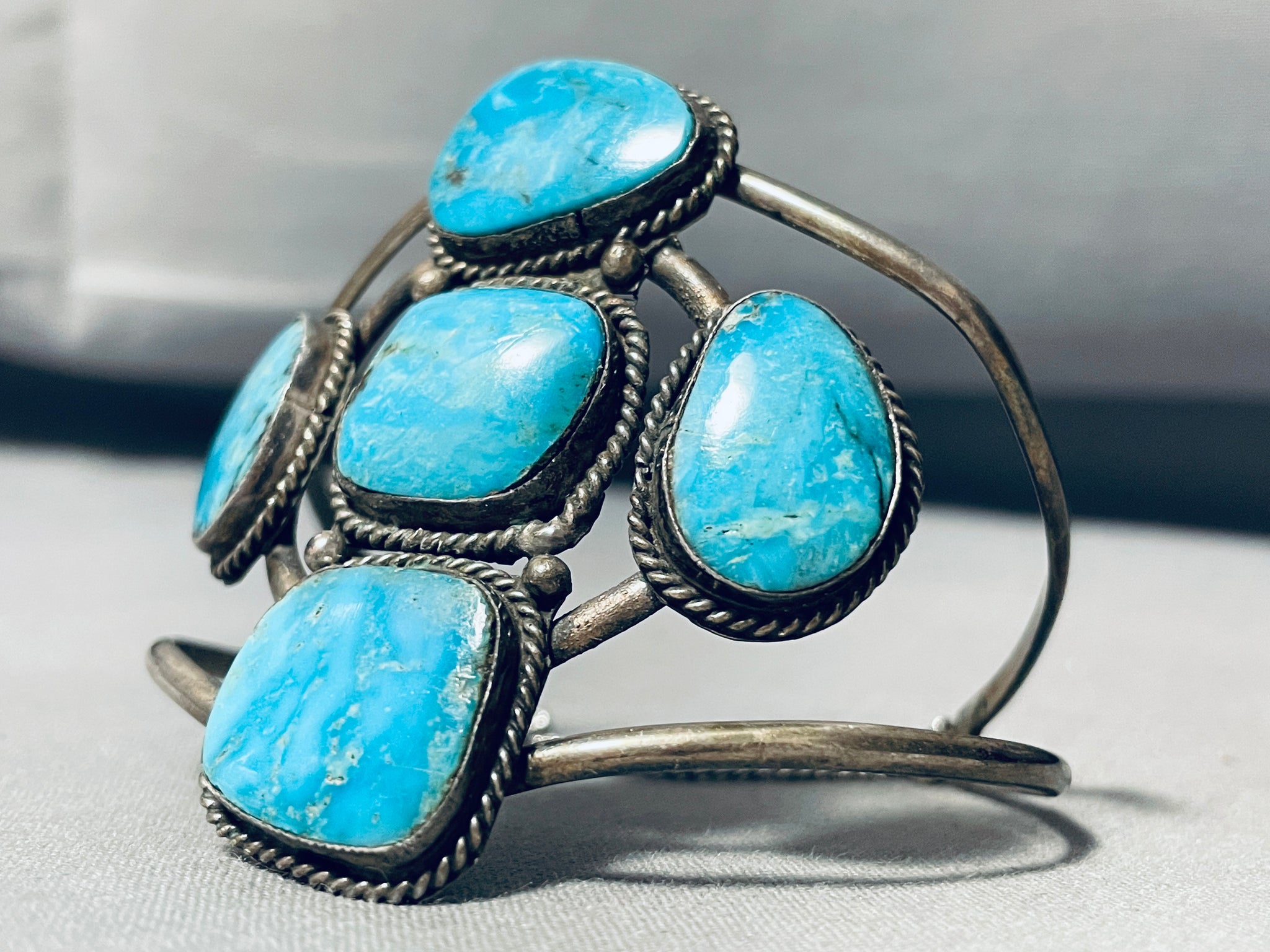 This is a superlative vintage Navajo turquoise silver bracelet. This outstanding bracelet contains five marvelous large chunky Morenci turquoise stones. Surrounding each stone are fascinating silver ropes with accenting raindrops. I absolutely love the detailing on this bracelet. The bracelet contains a stunning double silver shank cuff that graduates in width towards the center. The height at the center of the bracelet measures around 2-1/4" while the double silver shank cuff measures around 1-7/8". The stones measure around 5/8" x 5/8". Sterling silver. Cir. Mid century . The inside end to end measures around 5-1/2" with an additional 1-1/4" gap. Sturdy 29 grams.