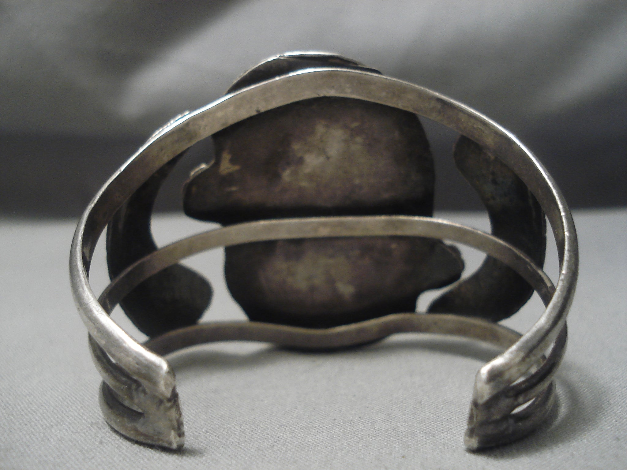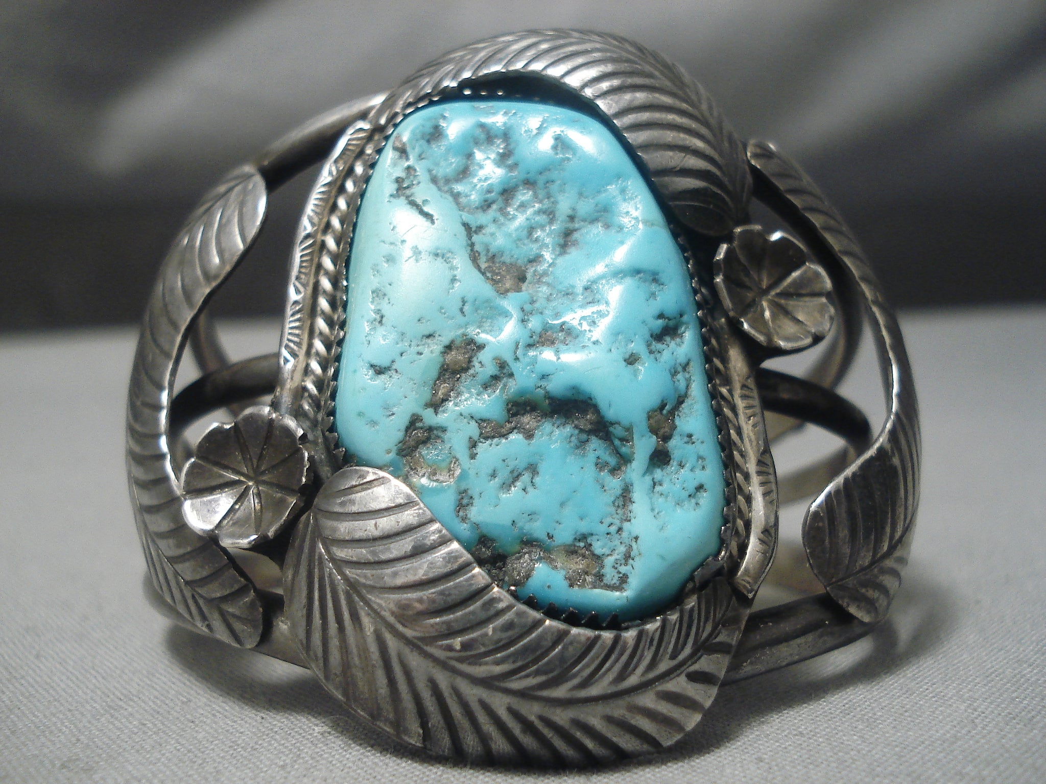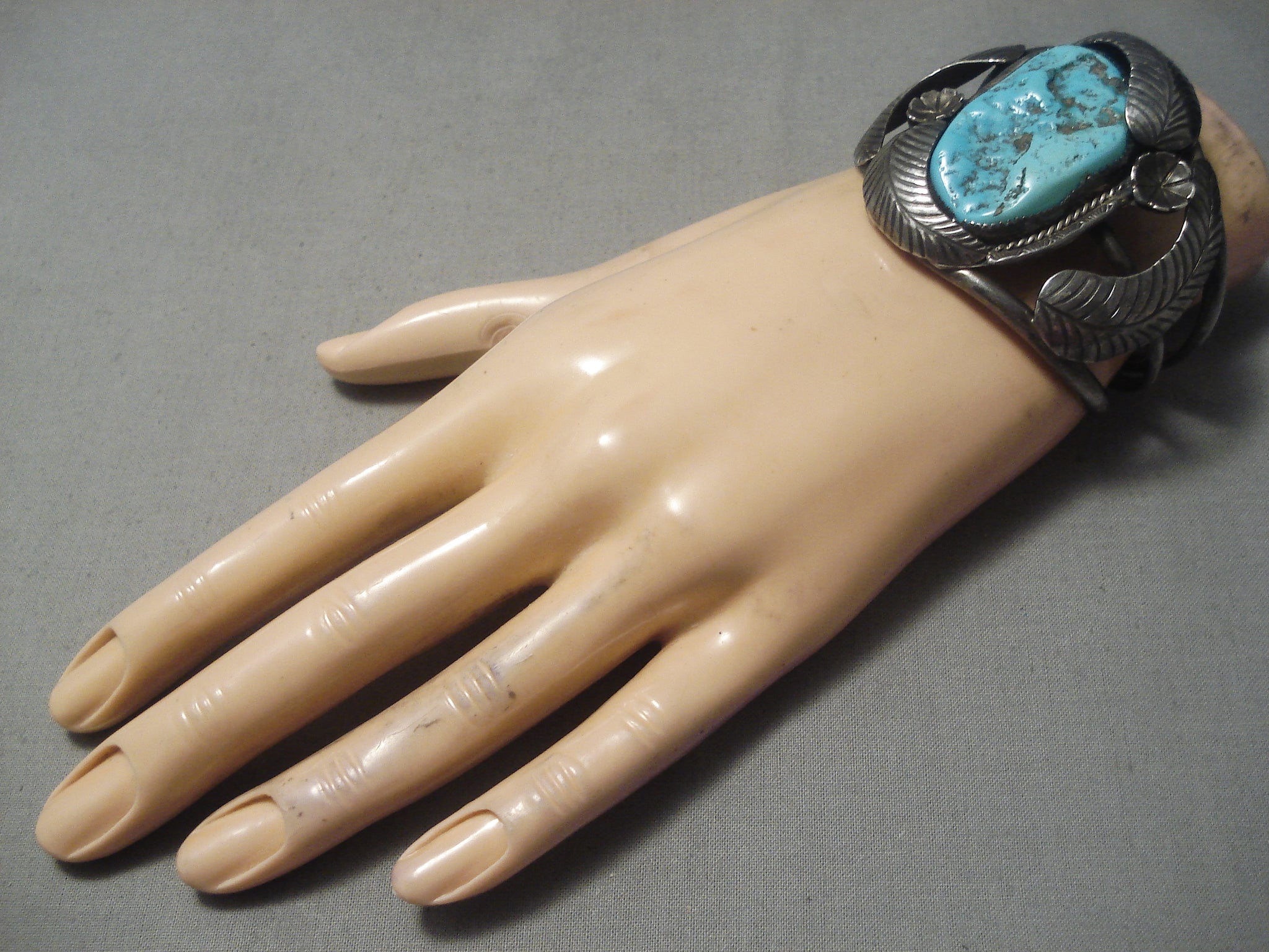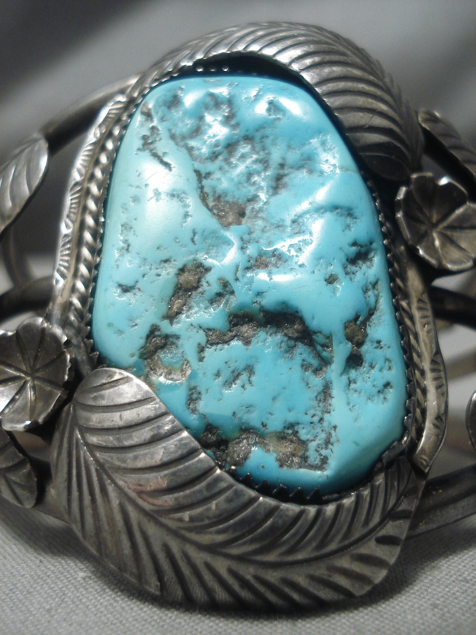 Huge Vintage Native American Navajo Turquoise Nugget Sterling Silver Leaf Bracelet Old