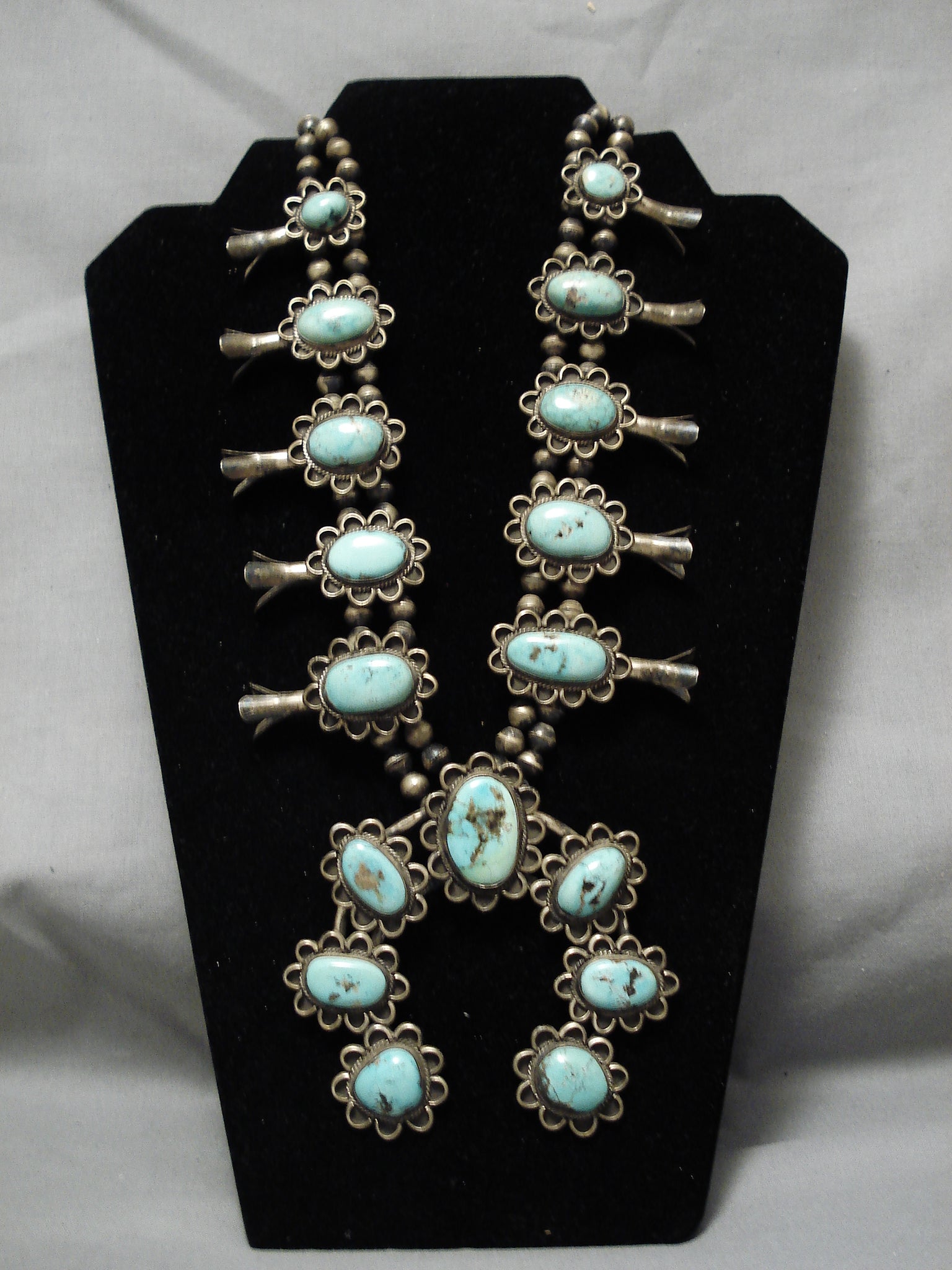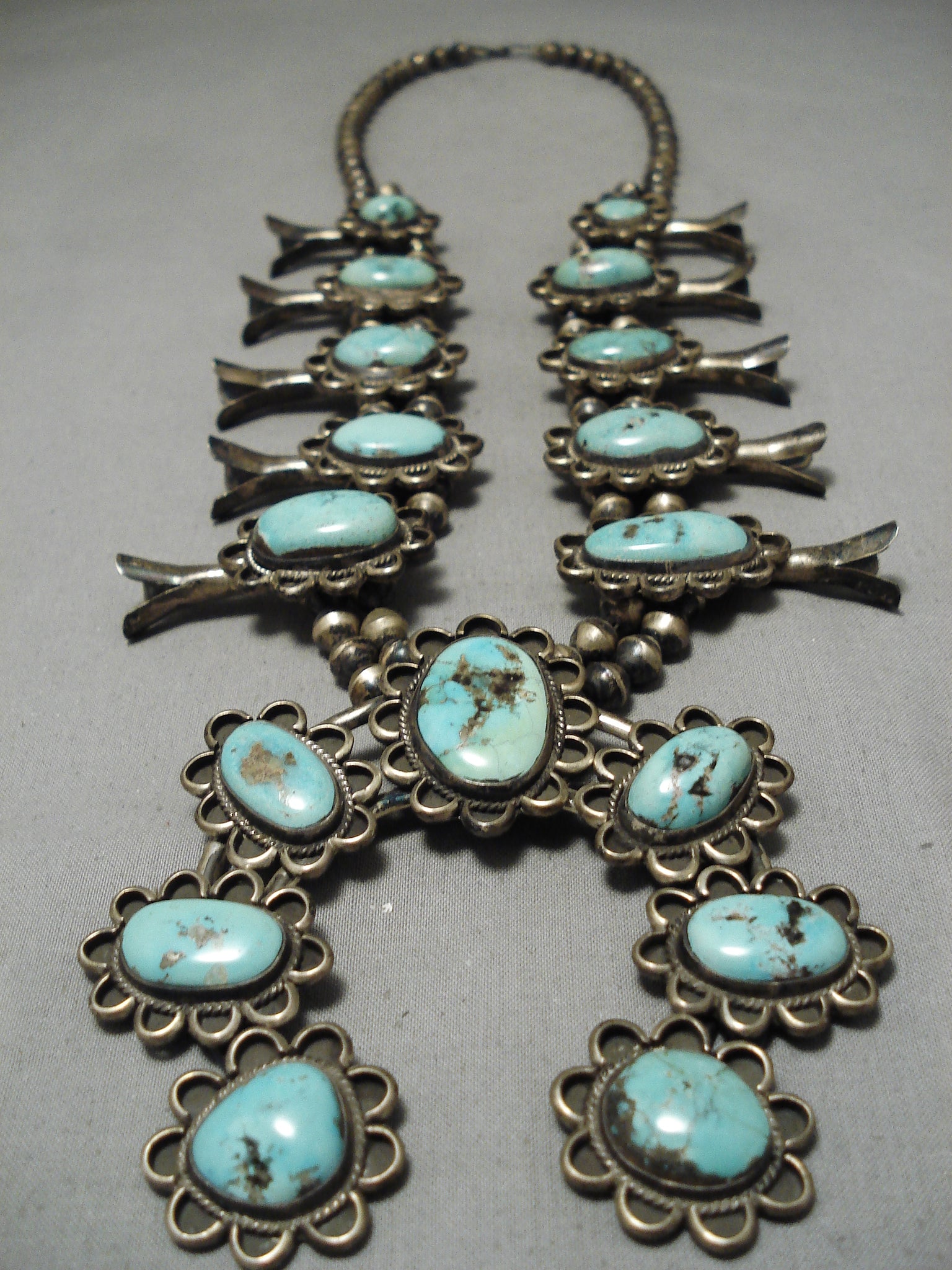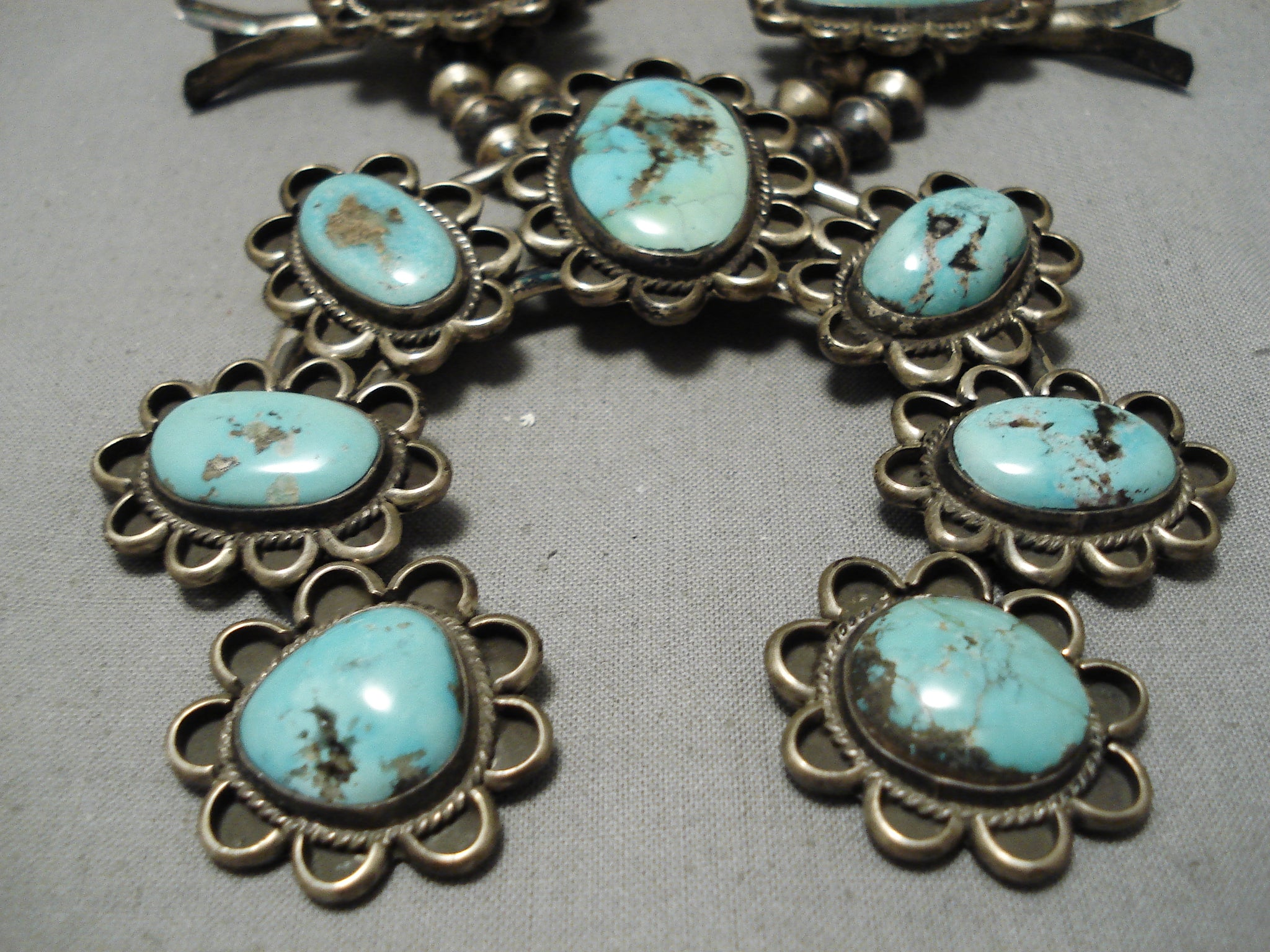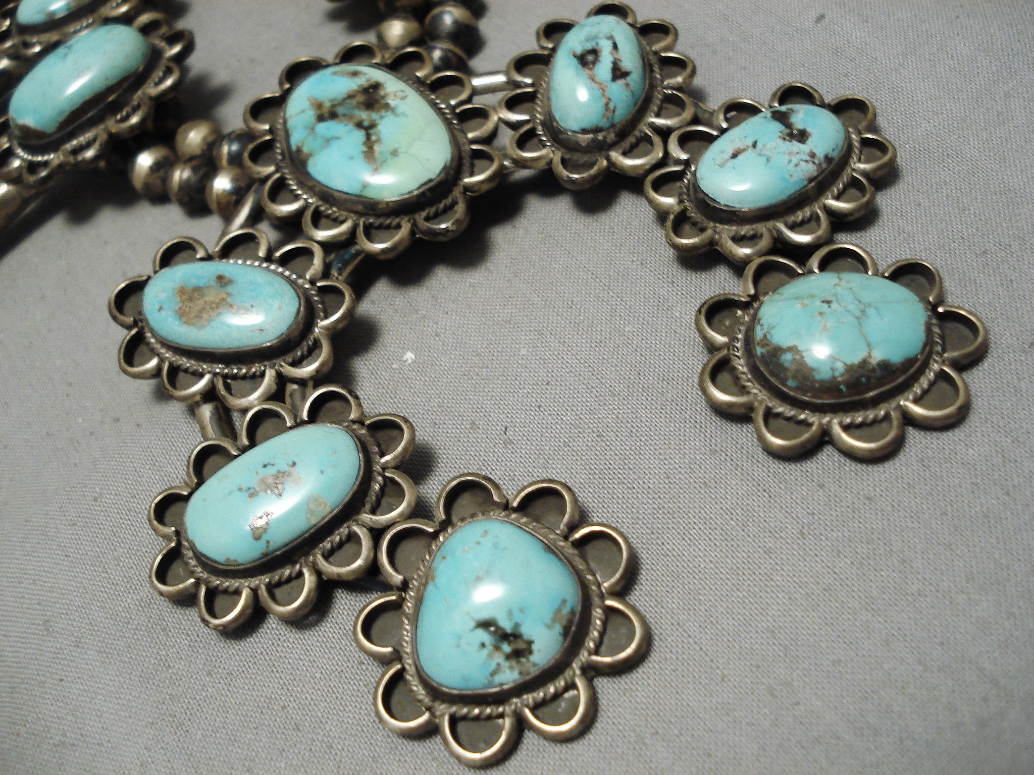 Huge Vintage Native American Navajo Turquoise Sterling Silver Squash Blossom Necklace Old