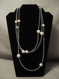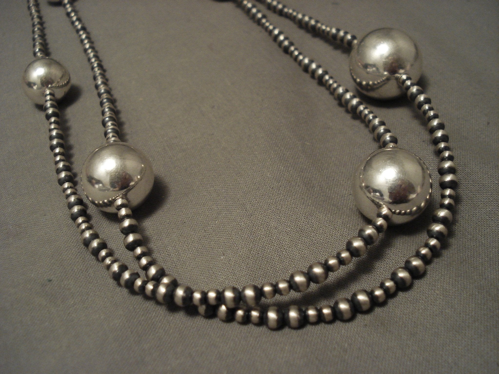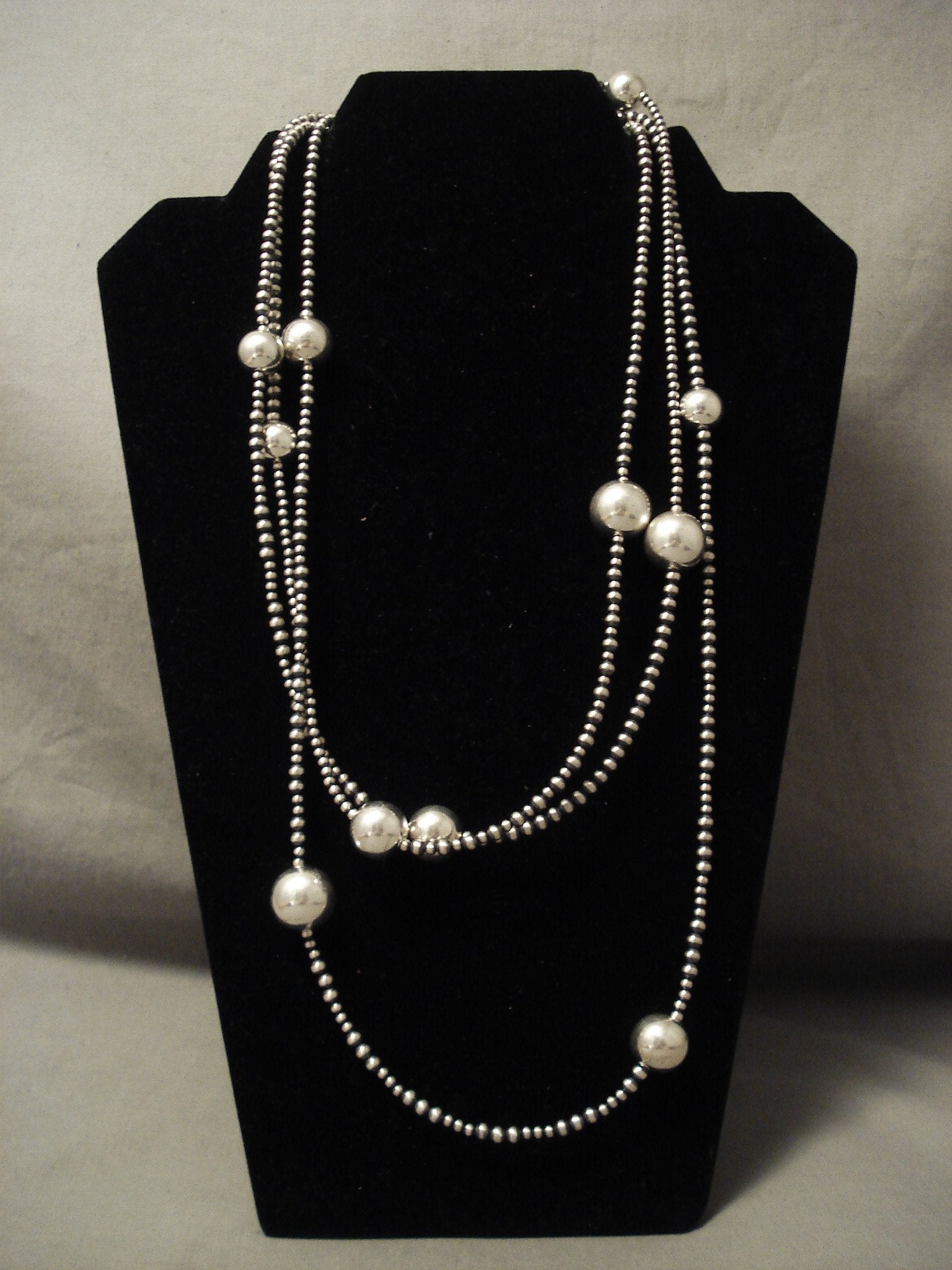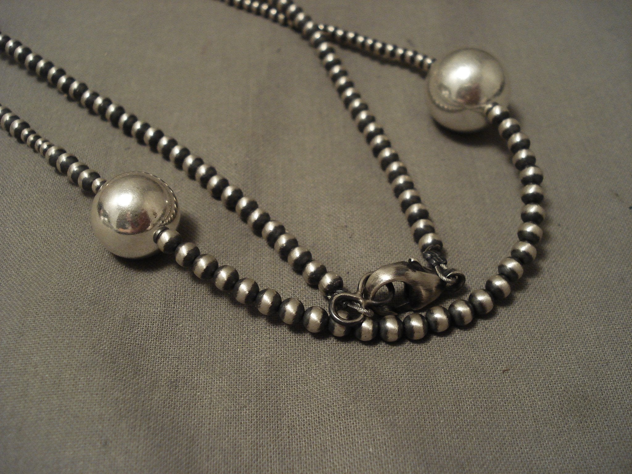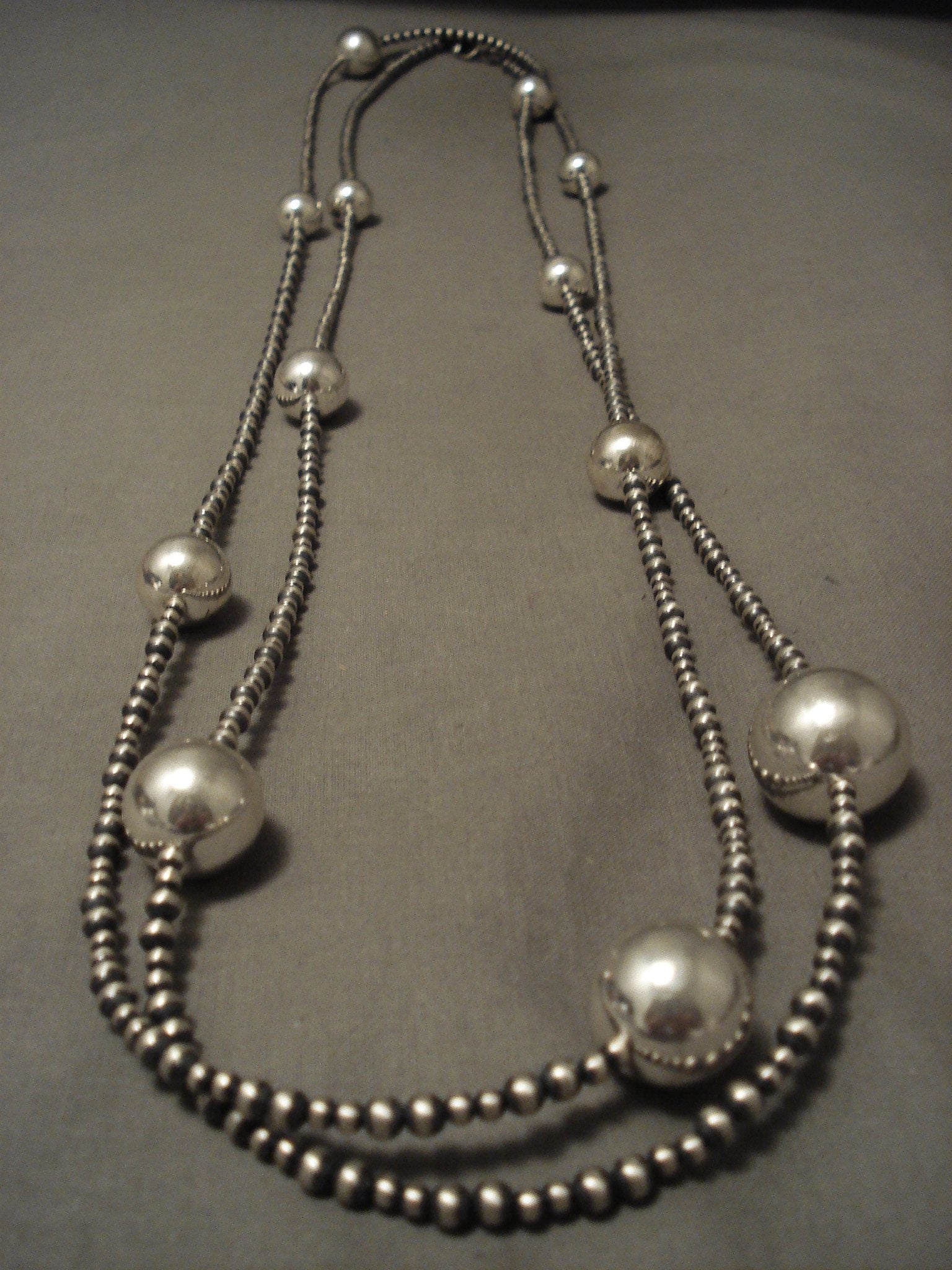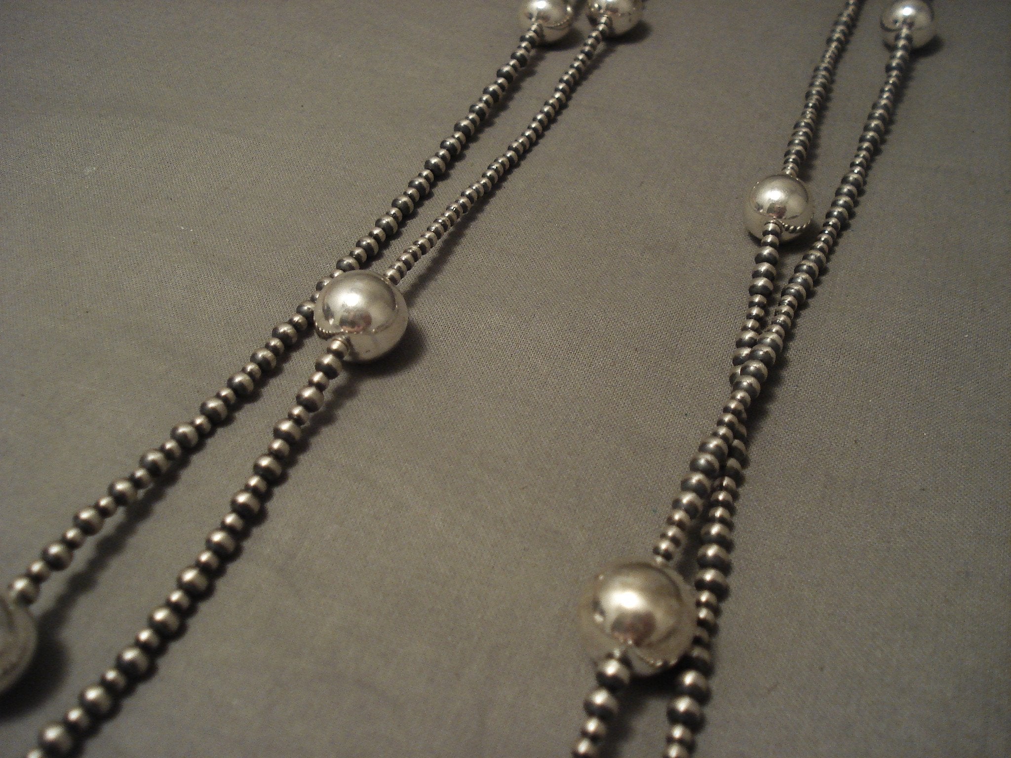 This is an impressive vintage Navajo Native American jewelry Native American jewelry all silver wrap around necklace. This mind boggling necklace measures around 71" long and is absolutely phenomenal. This piece contains hundreds of silver beads of multiple sizes. Look at those wonderful large, rounded silver beads that each measure around 3/4" in diameter. This necklace reminds us of a solar system although there may not be the correct amount of large beads, it's just very unique and reminds us of that. Sterling silver. Cir. Late 20th century . Sturdy 60 grams. LAYAWAYS- We are happy to work with you and are more flexible than anyone on the net. Simply send us an email for more information.