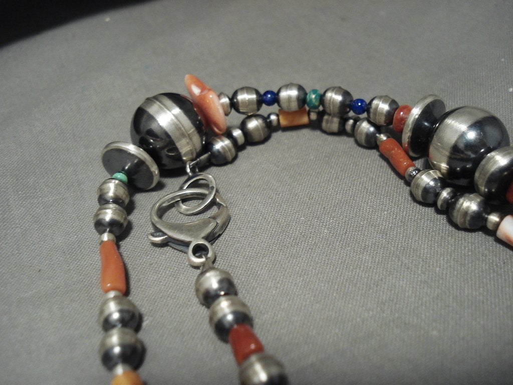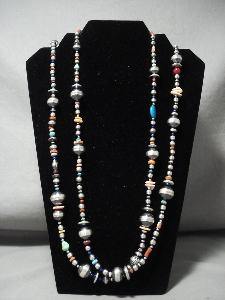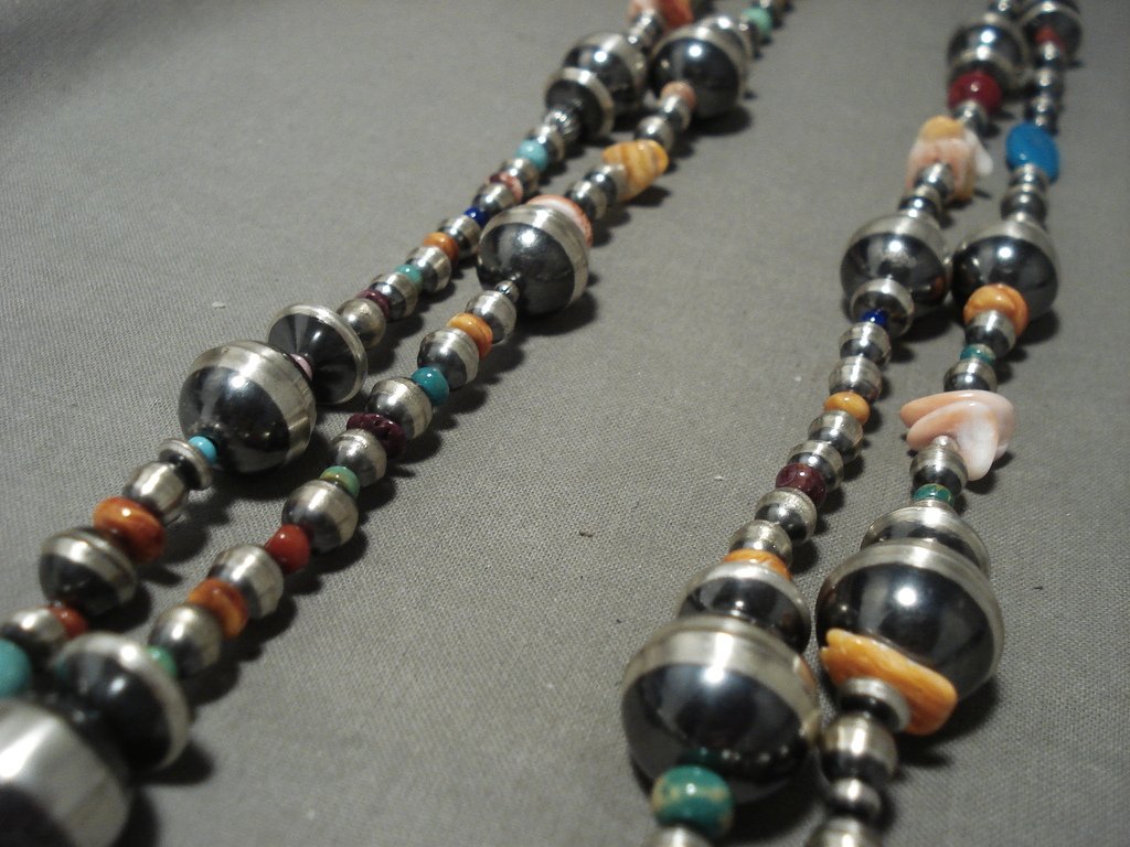 This is a museum quality Navajo Native American jewelry Native American jewelry silver, shells and stones wrap around necklace. This piece contains a beautiful plethora of graduating silver beads with the largest measuring around 5/8" in diameter. Situated throughout the entire necklace are a wide variety of different stones and shells including gaspeite, corals, spiny oyster, lapis and turquoise. This necklace wraps around allowing the piece to give a beautiful layering feature. Imagine how long it must have taken the artist to hand wrought all of these silver beads, just amazing! Sterling silver. Cir. 21st century . The length of the necklace measures around 60". Sturdy 87 grams.