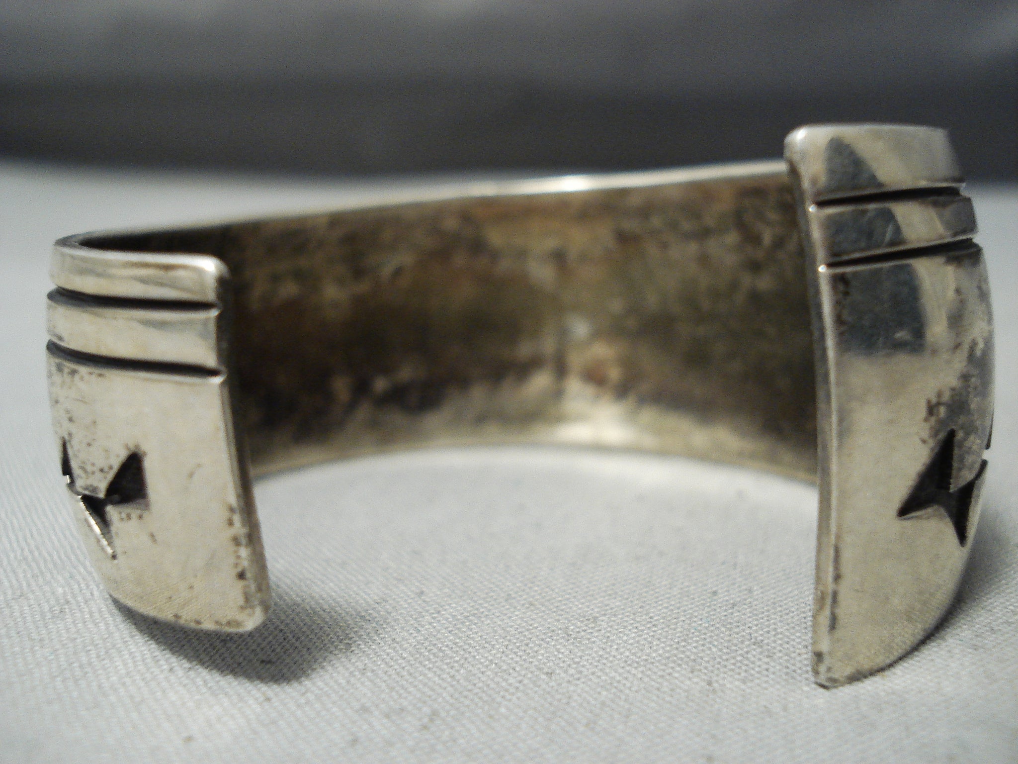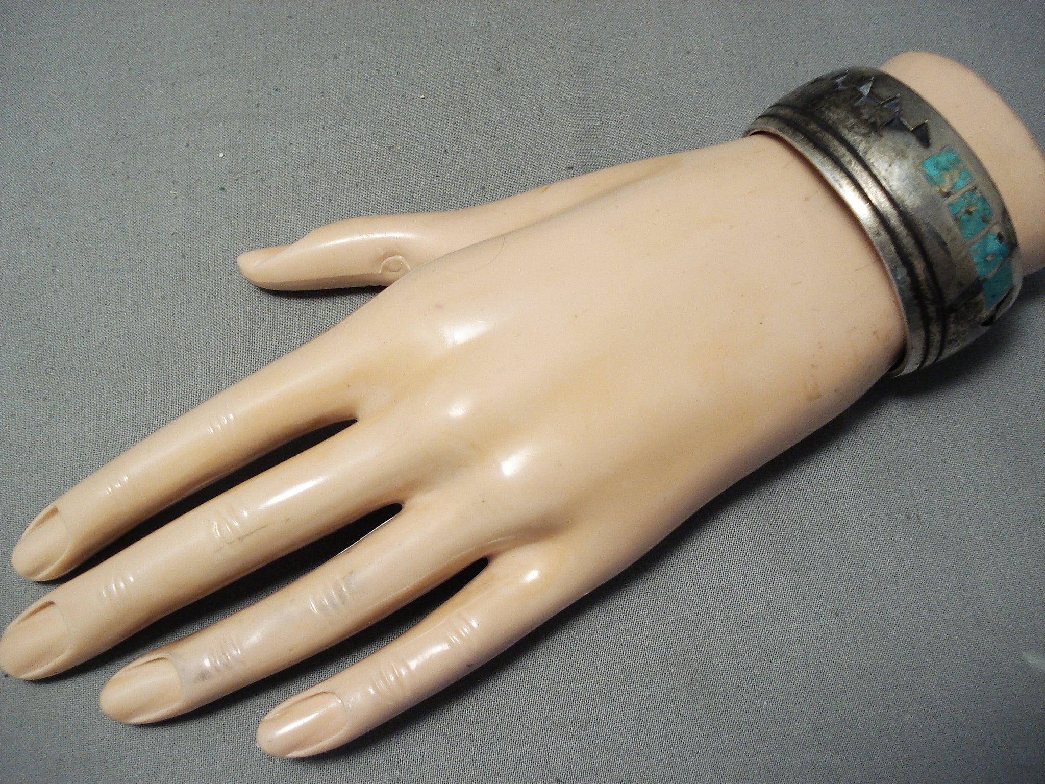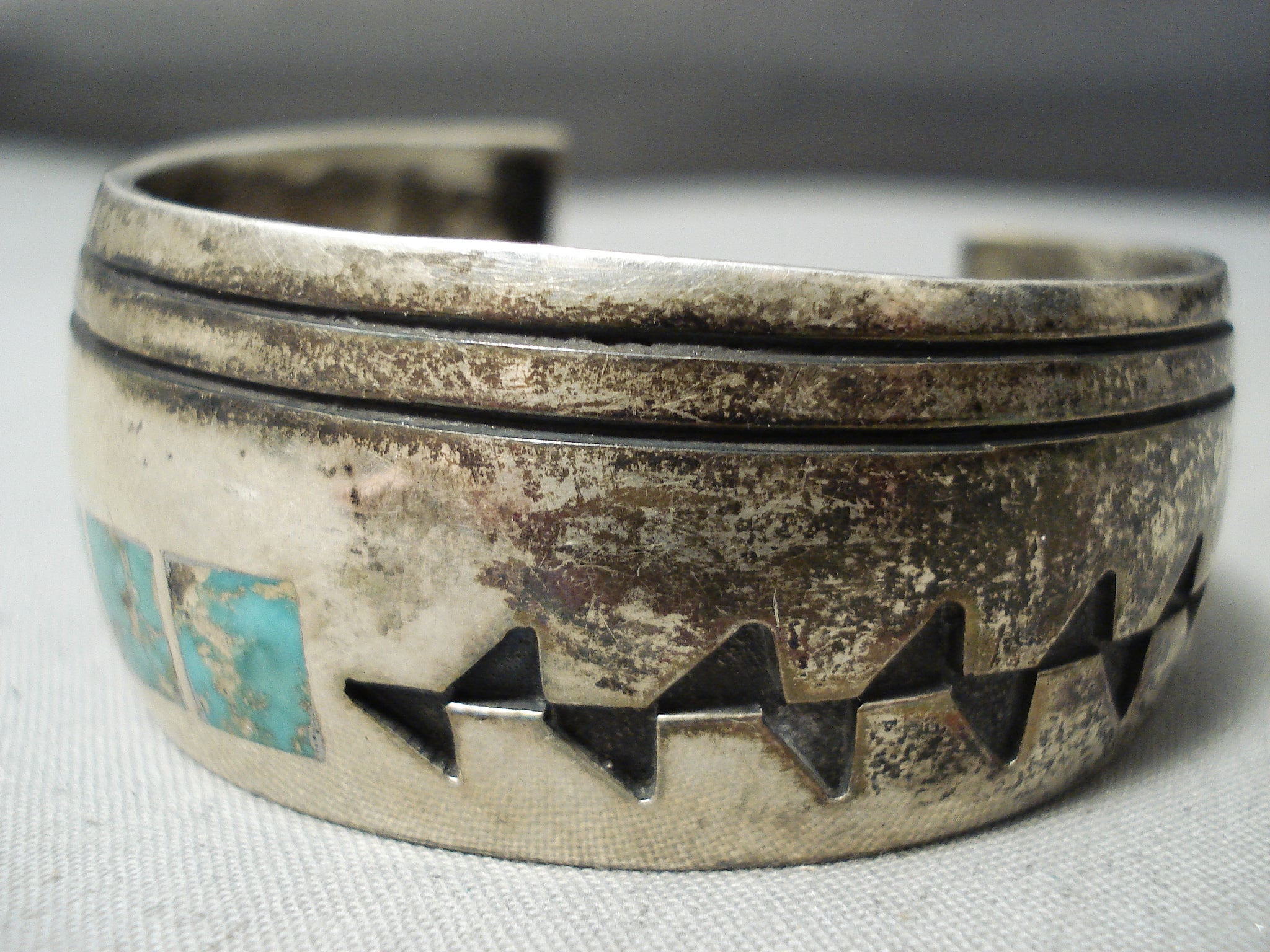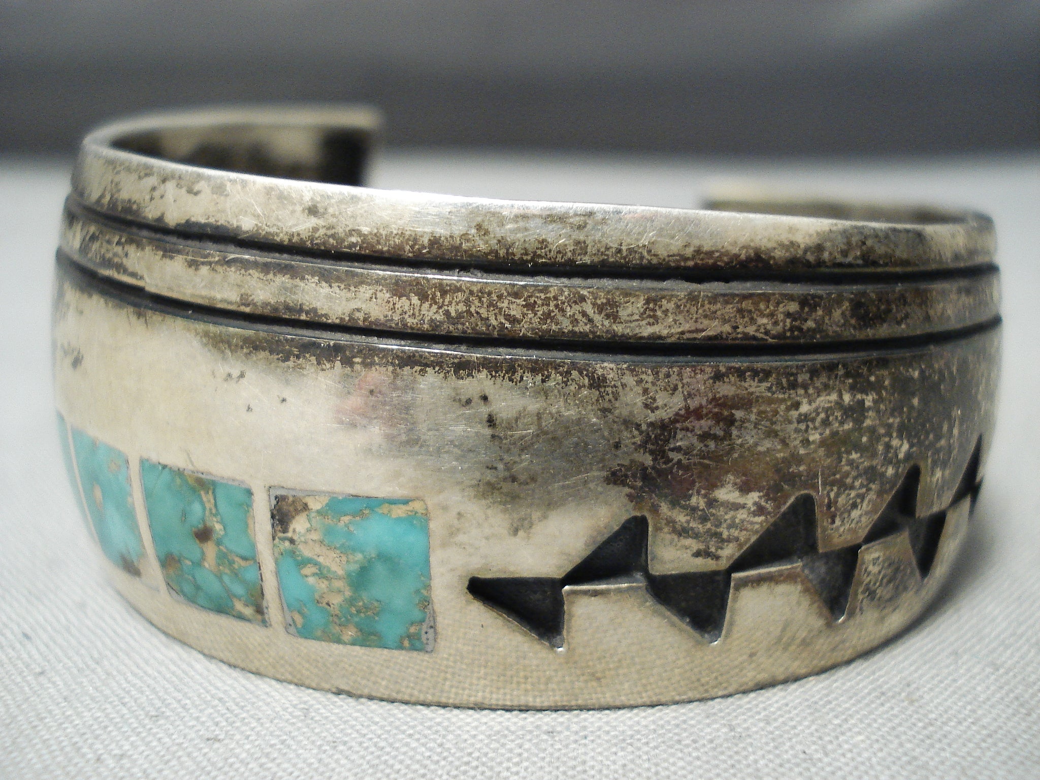 This is an astonishing vintage Navajo inlaid silver bracelet. This amazing bracelet contains superior inlaid square Royston turquoise stones that run down one end of the cuff while the other end consists of remarkable geometric triganular patterns. The cuff graduates in width from one end to the other with the center of the cuff measuring around 1". Bordering one edge of the thick and sturdy silver cuff are two deep line segments. Sterling silver. Cir. Mid century . The inside end to end measures around 5-1/2" with an additional 1" gap. Sturdy 46 grams.