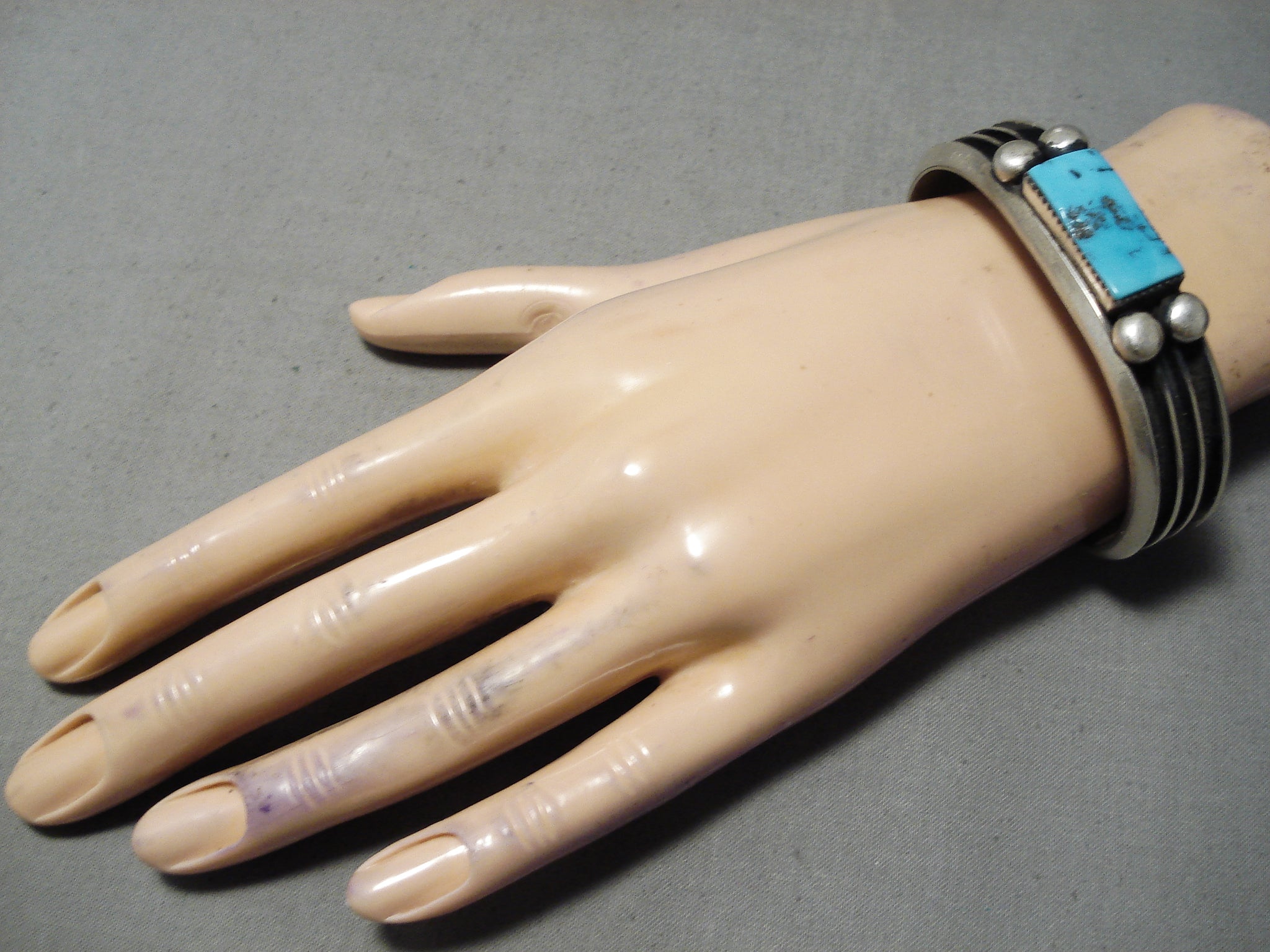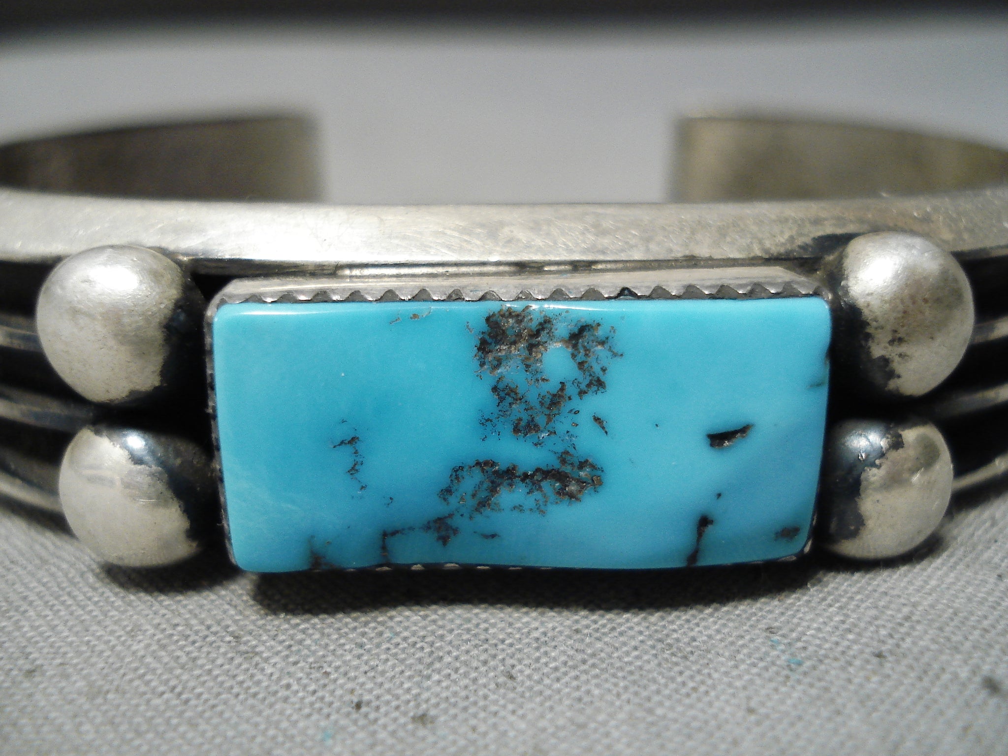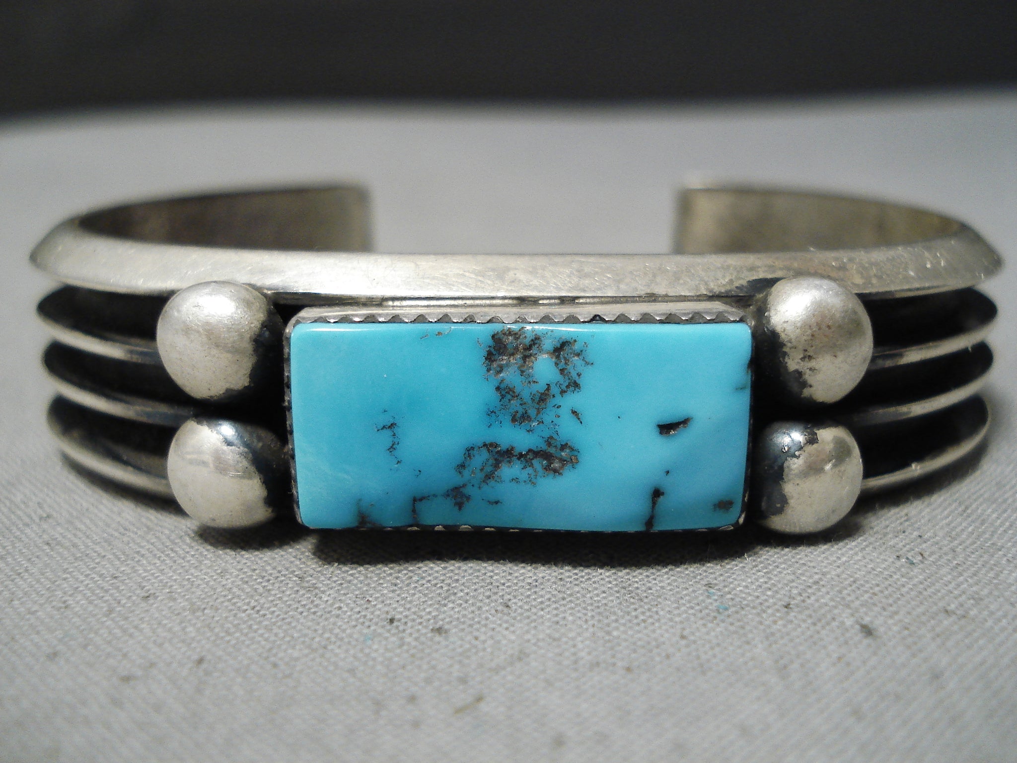 Hvy Vintage Native American Navajo Squared Turquoise Sterling Silver Bracelet Old