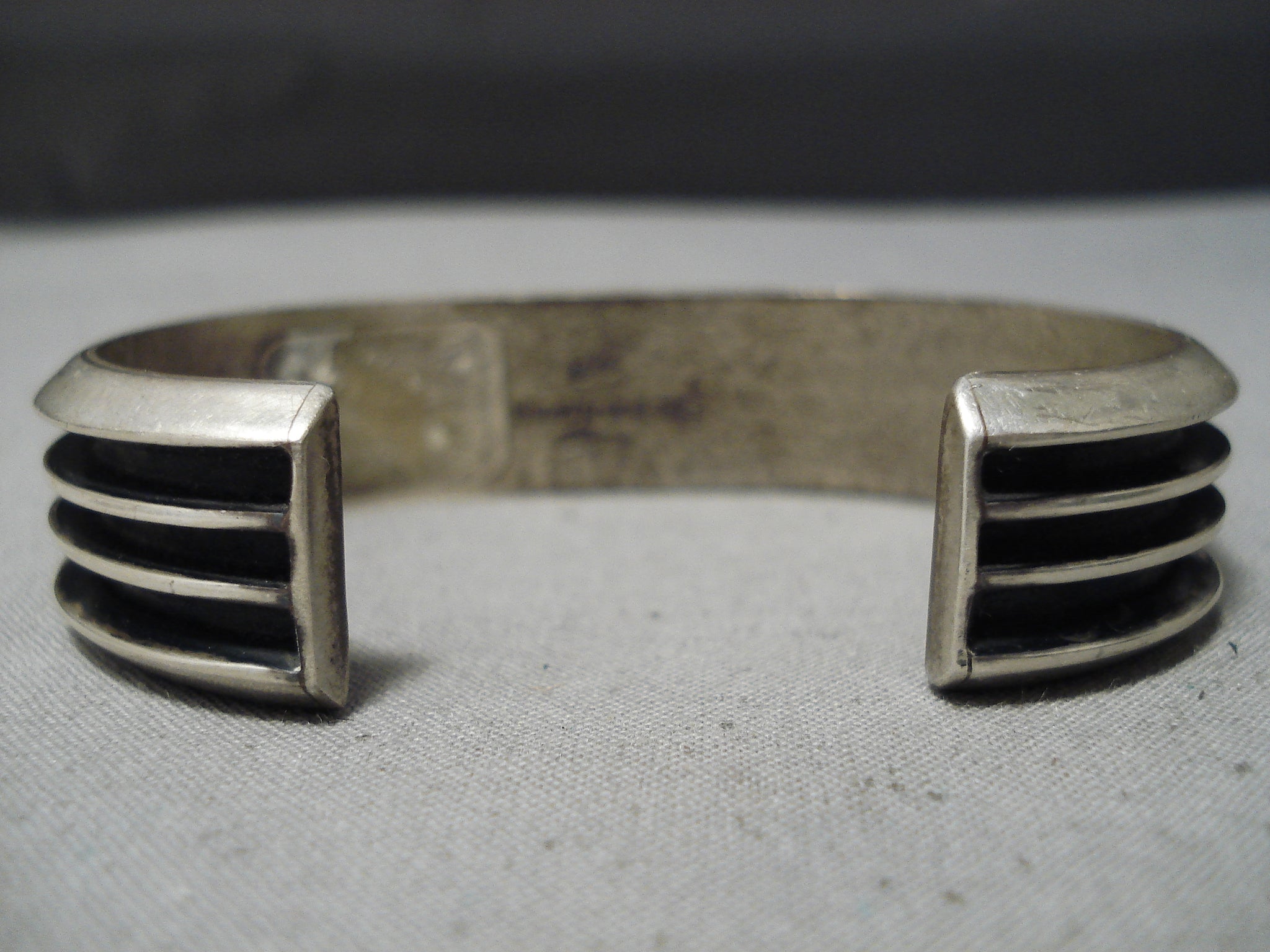 This is a fascinating vintage Navajo single stone silver bracelet. This piece contains a large rectangular shaped turquoise stone that appears to be from the amazing natural old Sleeping Beauty turquoise mine. We just love this piece as the entire cuff consists of deep line segments with large accenting silver raindrops. This bracelet is very thick and heavy. The center stone measures around 7/8" x 3/8". The width of the bracelet measures around 5/8". Signed by Navajo artist, CC. Sterling silver, marked. Cir. 1970's+. The inside end to end measures around 5-3/4" with an additional 1" gap. Sturdy 58 grams.