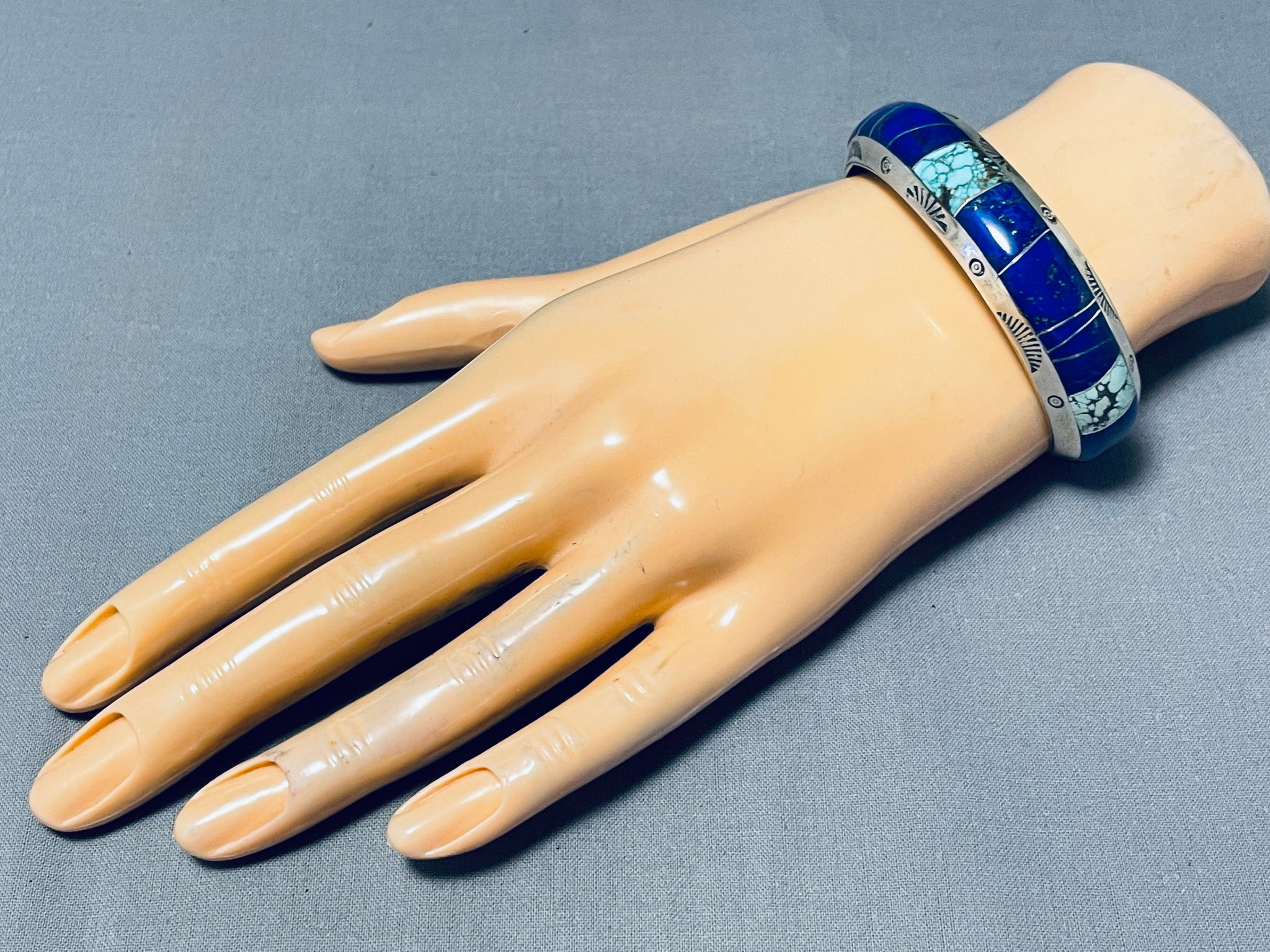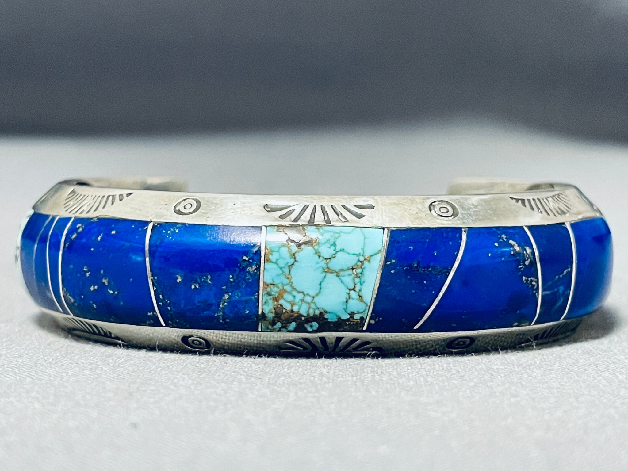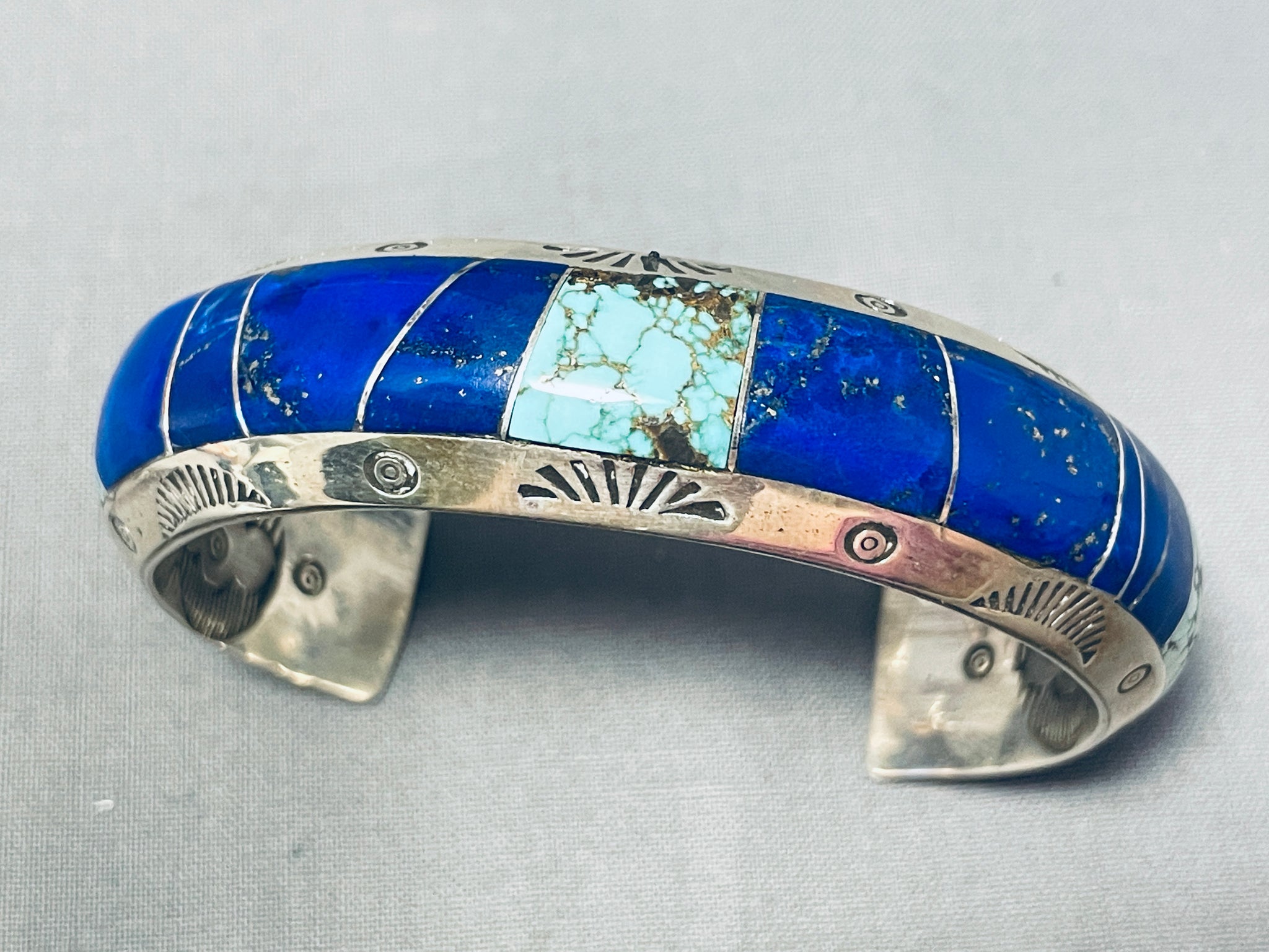 We are proud to offer this striking Navajo silver bracelet having inlay spiderweb turquoise and lapis with handcarved silver borders accented with silver handstampings all across the handcarved graduated solid silver cuff and on the inside! Absolutely Beautiful! The center stone measures around 1/2" x 3/8". The width of the bracelet measures around 5/8". Signed by Navajo artist, Ed Chiscilla. Sterling silver, marked. The inside end to end measures around 5-3/8" with an additional 1-1/4" gap. Sturdy 46 grams.