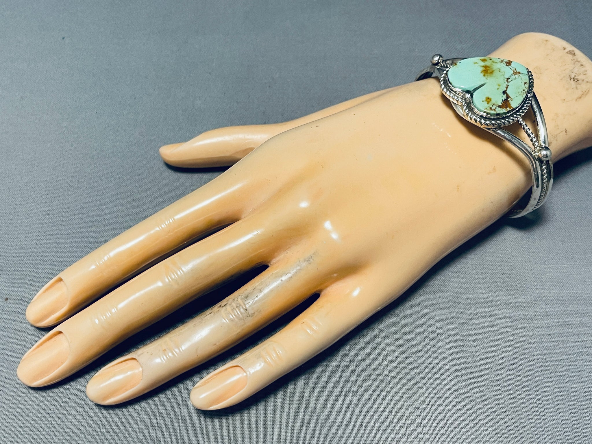 This is a fabulous Navajo large single stone silver bracelet. This amazing bracelet contains a center hand carved turquoise stone that is hand carved into a wonderful heart shape and measures a stunning 1" X 1". The stone appears to be from the fascinating Royston turquoise mine. Surrounding the beautiful turquoise stone is a thick silver rope. This fabulous triple silver shank cuff consists of a sturdy triple silver shank cuff with the center shank being coiled. Resting at the sides are amazing silver raindrops. The width of the bracelet measures around 1-1/8". Signed by Navajo artist, Marc James. Sterling silver, marked. Cir. 1970's+. The inside end to end measures around 5-1/4" with an additional 1" gap. Sturdy 26 grams.