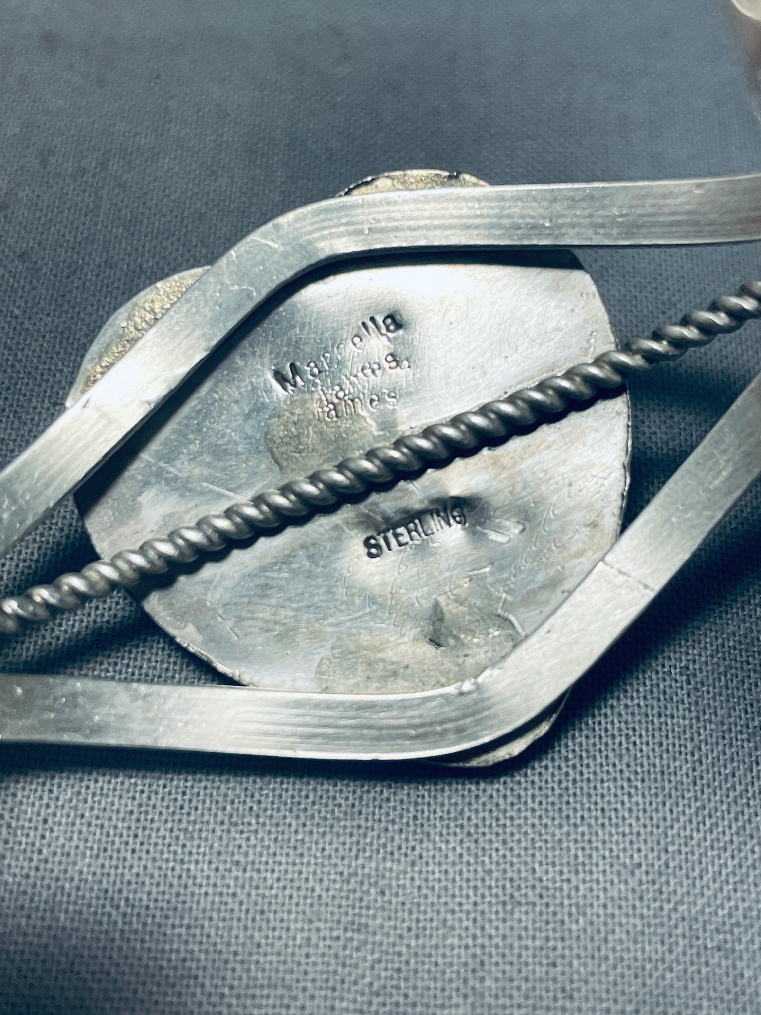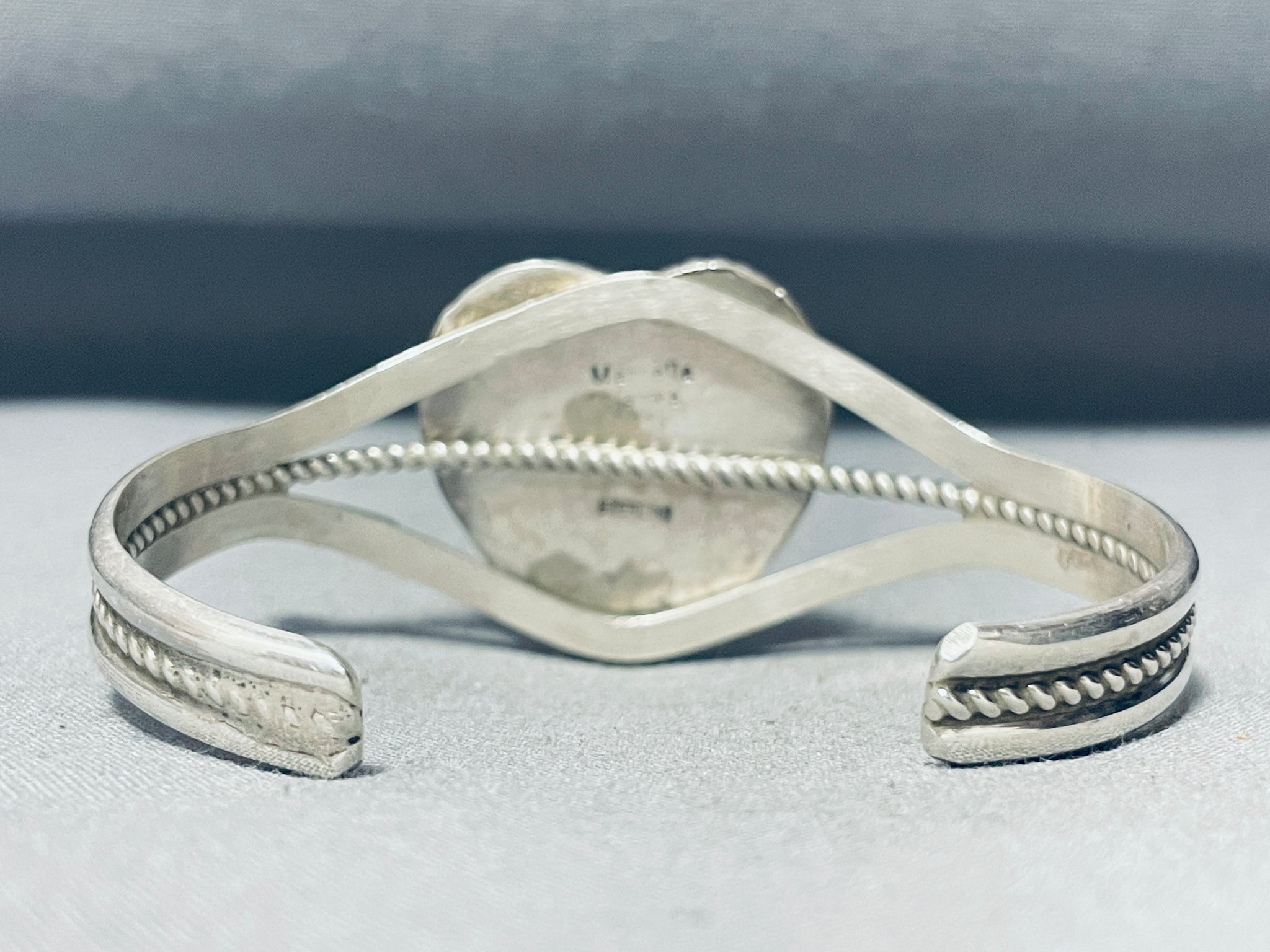 This is a fabulous Navajo large single stone silver bracelet. This amazing bracelet contains a center hand carved turquoise stone that is hand carved into a wonderful heart shape and measures a stunning 1" X 1". The stone appears to be from the fascinating Royston turquoise mine. Surrounding the beautiful turquoise stone is a thick silver rope. This fabulous triple silver shank cuff consists of a sturdy triple silver shank cuff with the center shank being coiled. Resting at the sides are amazing silver raindrops. The width of the bracelet measures around 1-1/8". Signed by Navajo artist, Marc James. Sterling silver, marked. Cir. 1970's+. The inside end to end measures around 5-1/4" with an additional 1" gap. Sturdy 26 grams.