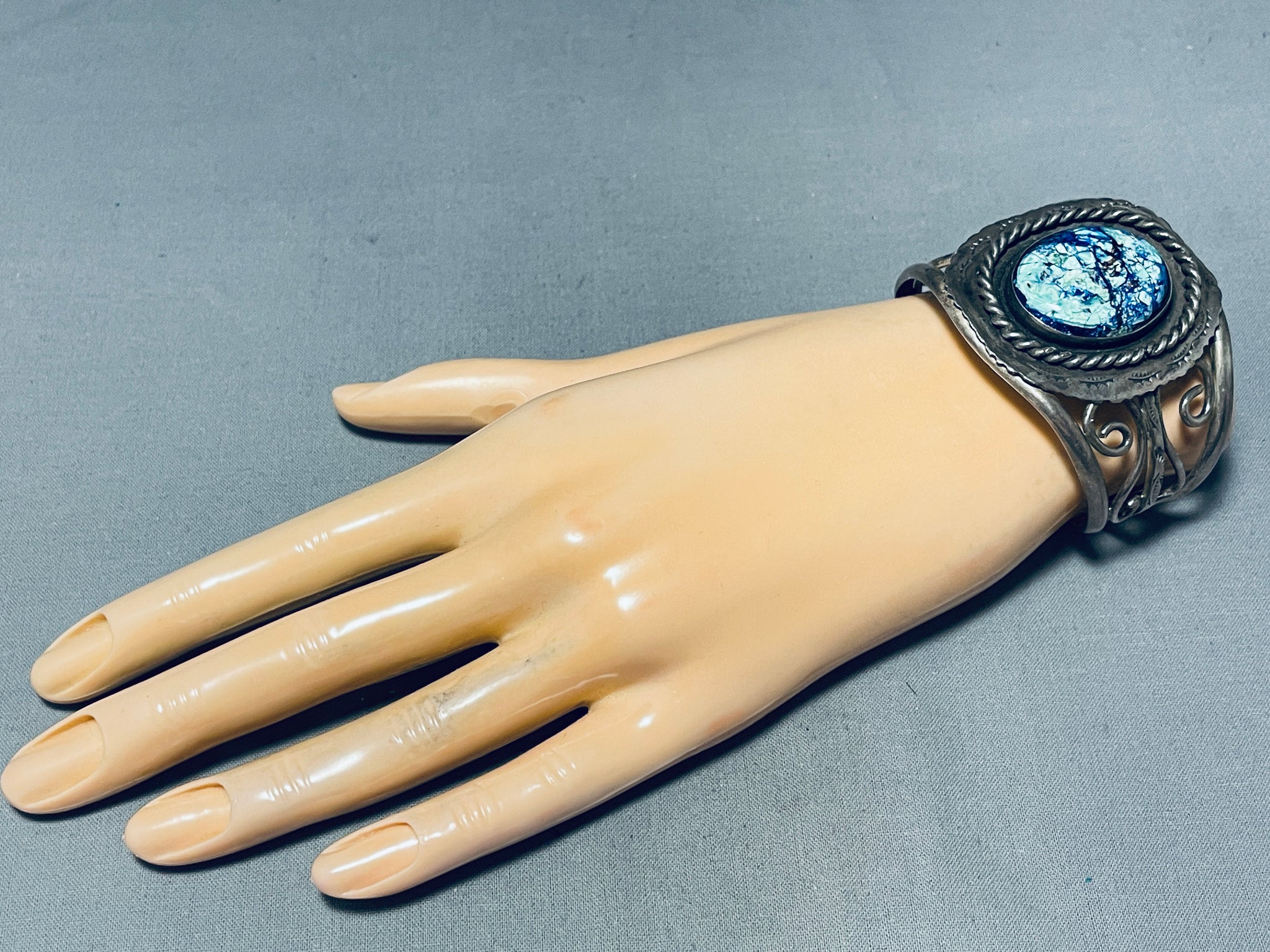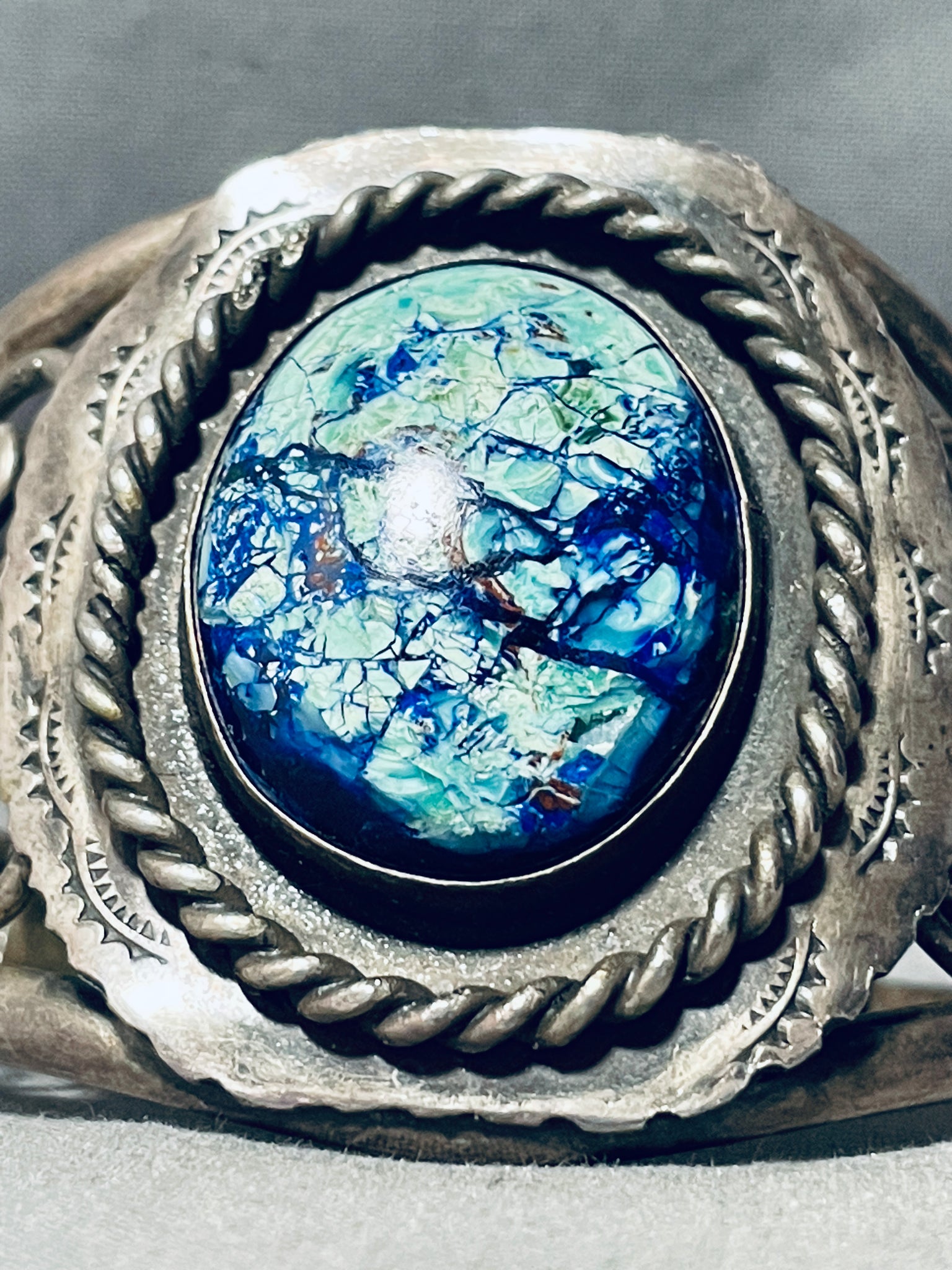 This is a breathtaking vintage Navajo single stone silver bracelet. This remarkable bracelet contains a large center oval shaped Ice Blue agate stone. Surrounding the stone is a very thick silver rope with accenting sun stampings. Running down both ends of the sturdy thick triple silver shank cuff are wonderful silver swirling stem patterns. I absolutely love the stunning old natural patina on this bracelet. The center stone measures around 1-1/8" x 7/8". The width of the bracelet measures around 1-7/8". Signed by Navajo artist, Ben S. Sterling silver. Cir. 1970's+ . The inside end to end measures around 5" with an additional 1" gap. Sturdy 56 grams.