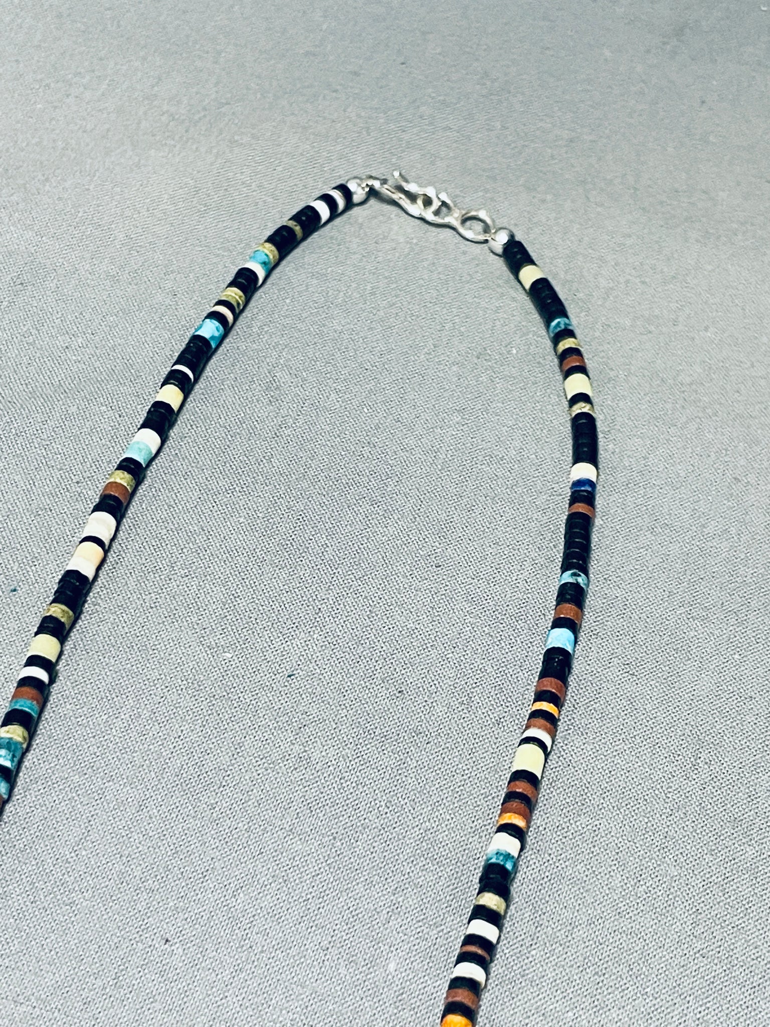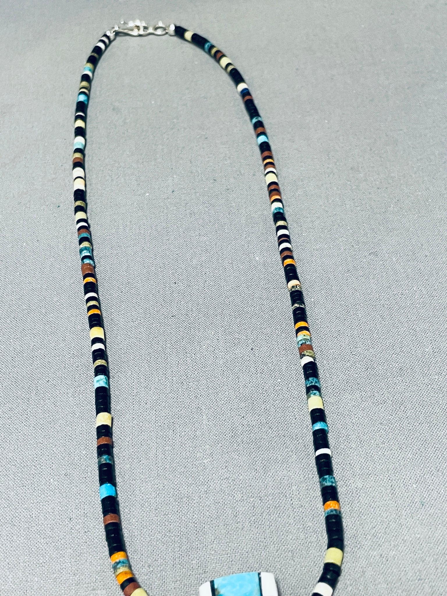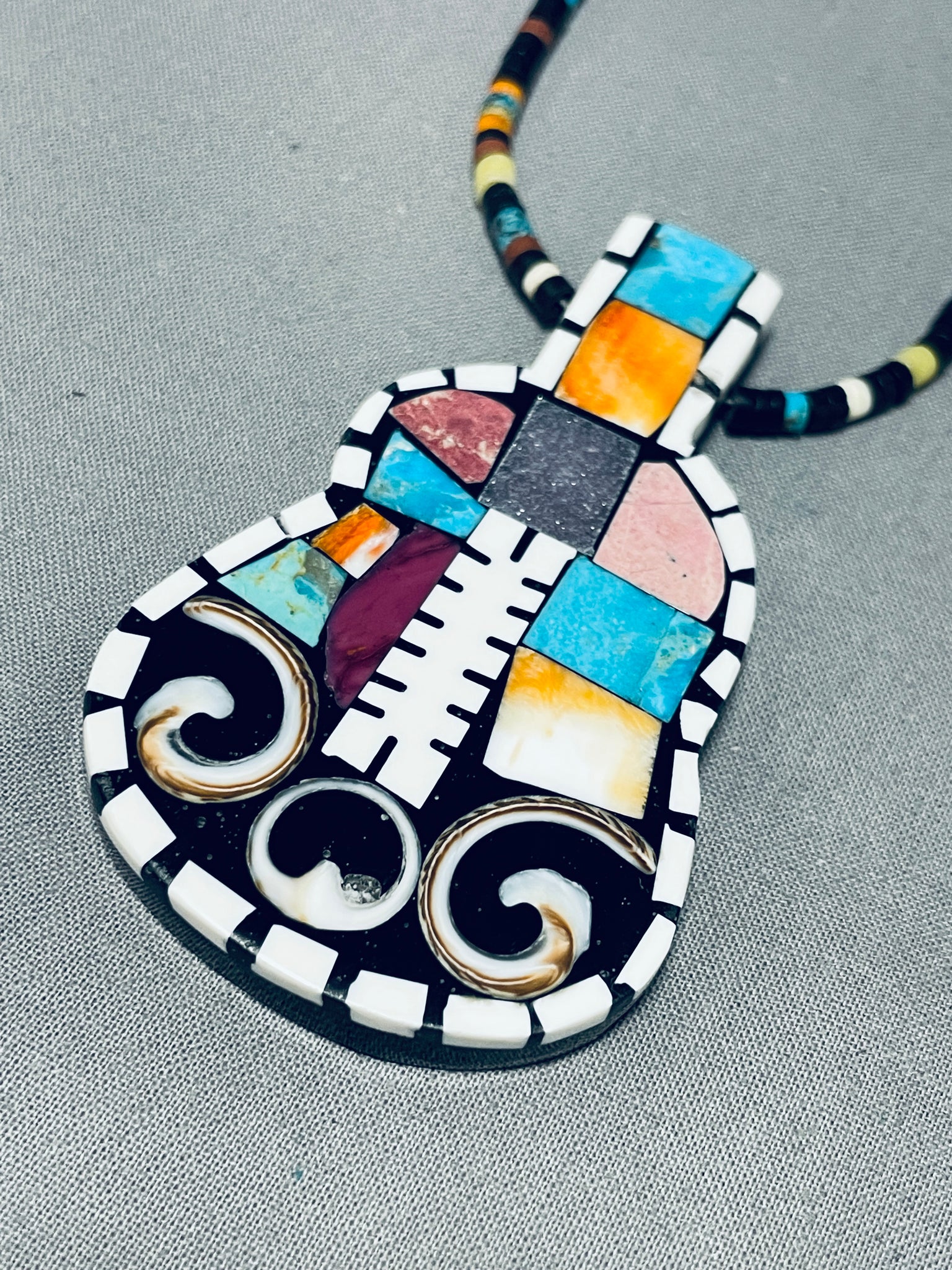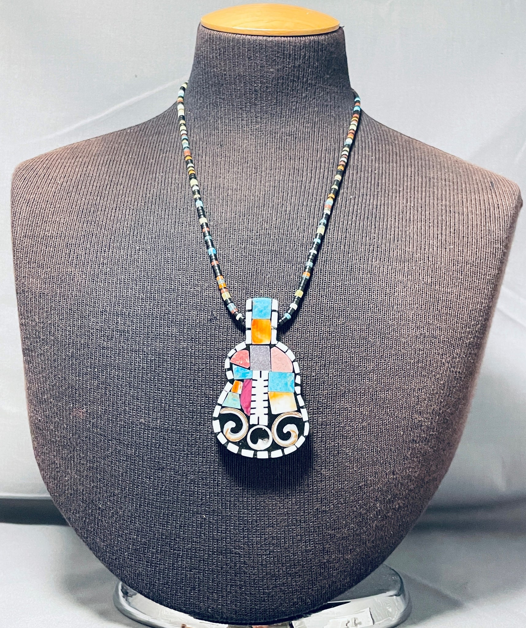 This is a superlative Kewa inlaid necklace. This remarkable necklace contains a phenomenal inlaid guitar shape pendant that measures around 3" X 1-3/4" The inlay formations on the pendant consist of turquoise, sugulite, white stone, jet, spiny oyster and shells. I absolutely love the unique shape of that beautiful pendant. Running up the necklace on both sides are stunning jet stones, turquoise stones, white stones and spiny oyster shells with a traditional silver clasp. Sterling silver. Signed by Kewa artist, Mary Louise Tafoya. The length of the necklace measures around 24". Sturdy 36 grams.