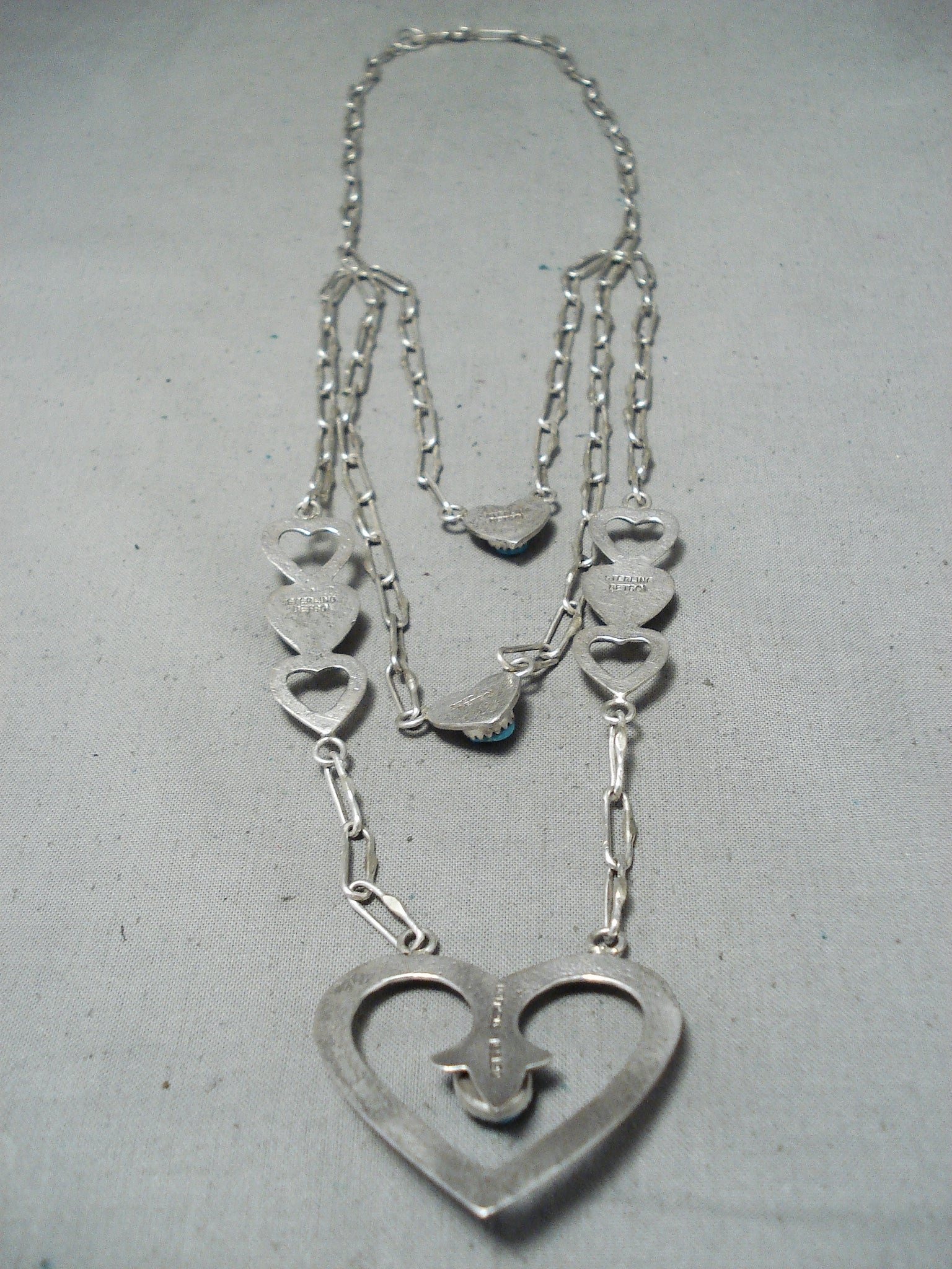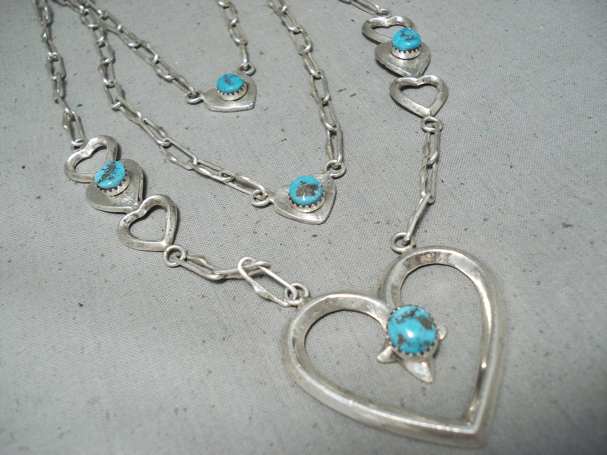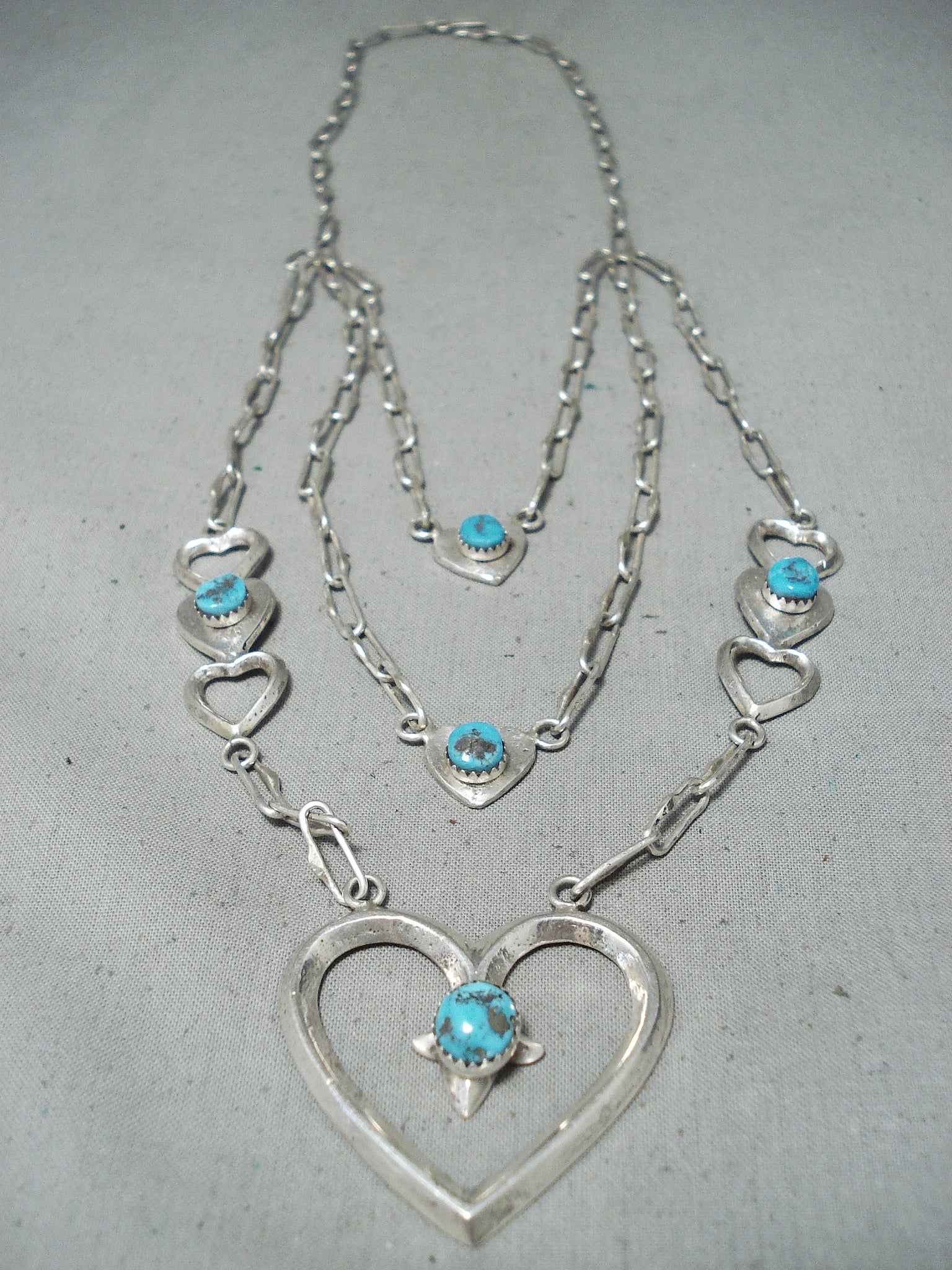 An exquisite Navajo silver necklace. Here we have a really unique 3-layer design heart necklace - hosting 5 impressive turquoise stones! The large open heart at the center measures about 1-5/8" x 1-1/2" and has a 3/8" x 5/16" turquoise stone. Sweet! Sterling silver, marked. Signed by Navajo artist, Betsoi. The length of the necklace measures around 28". Sturdy 48 grams.