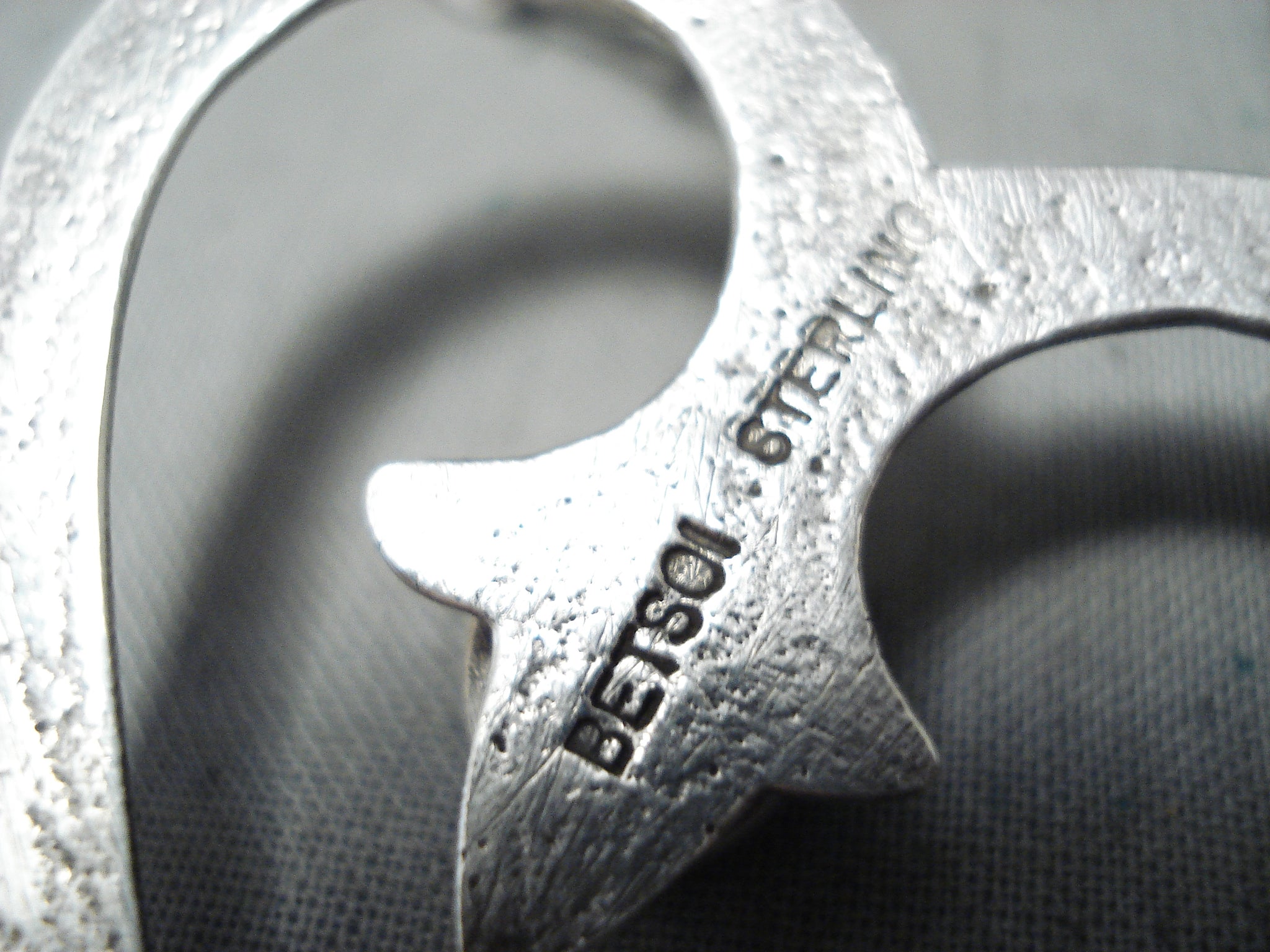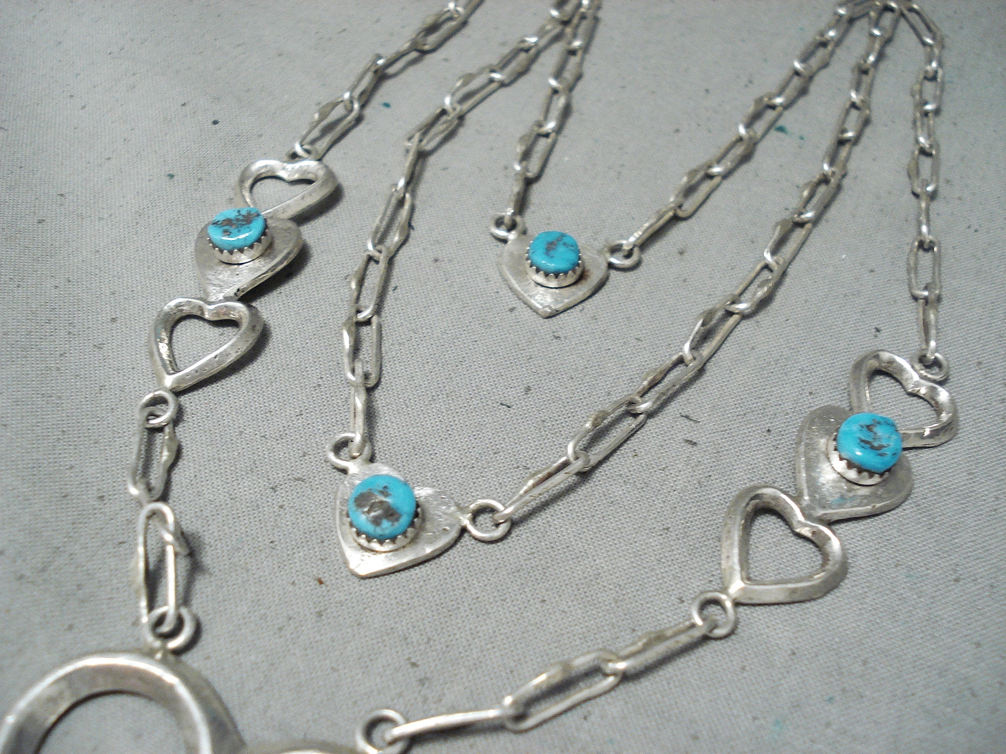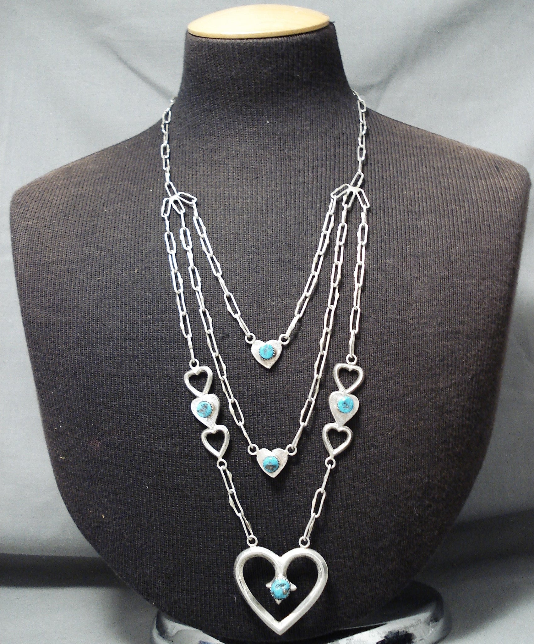 An exquisite Navajo silver necklace. Here we have a really unique 3-layer design heart necklace - hosting 5 impressive turquoise stones! The large open heart at the center measures about 1-5/8" x 1-1/2" and has a 3/8" x 5/16" turquoise stone. Sweet! Sterling silver, marked. Signed by Navajo artist, Betsoi. The length of the necklace measures around 28". Sturdy 48 grams.