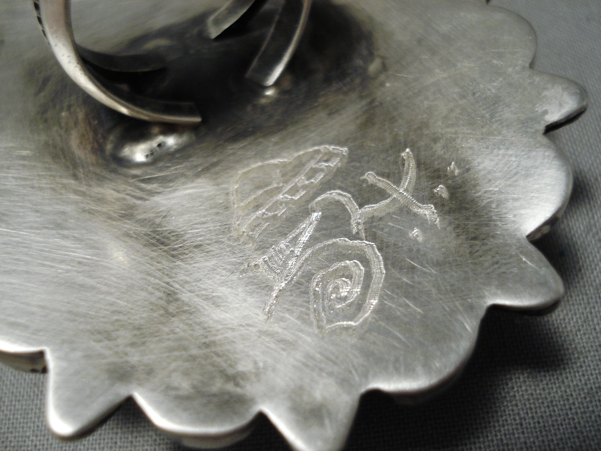 This is a tremendous vintage Zuni important huge turquoise silver ring being absolutely remarkable. Check out the huge dome shaped agate stone in the center with 12 impeccable surrounding rounded turquoise stones that are large. Situated around the stones are phenomenal silver works that consist of teepee patterns, wave works, dotted raindrops and smaller raindrops. The very unique thick and sturdy silver ring contains a marvelous double silver shank with accenting channeled patterns. The center stone measures around 1-5/8" x 1-1/4". The ring face measures around 2-3/4" x 2". Signed by Zuni artist, Brian Tom . The ring size is around 9.5. Cir. 1970's+. Sterling silver. Sturdy 57 grams.