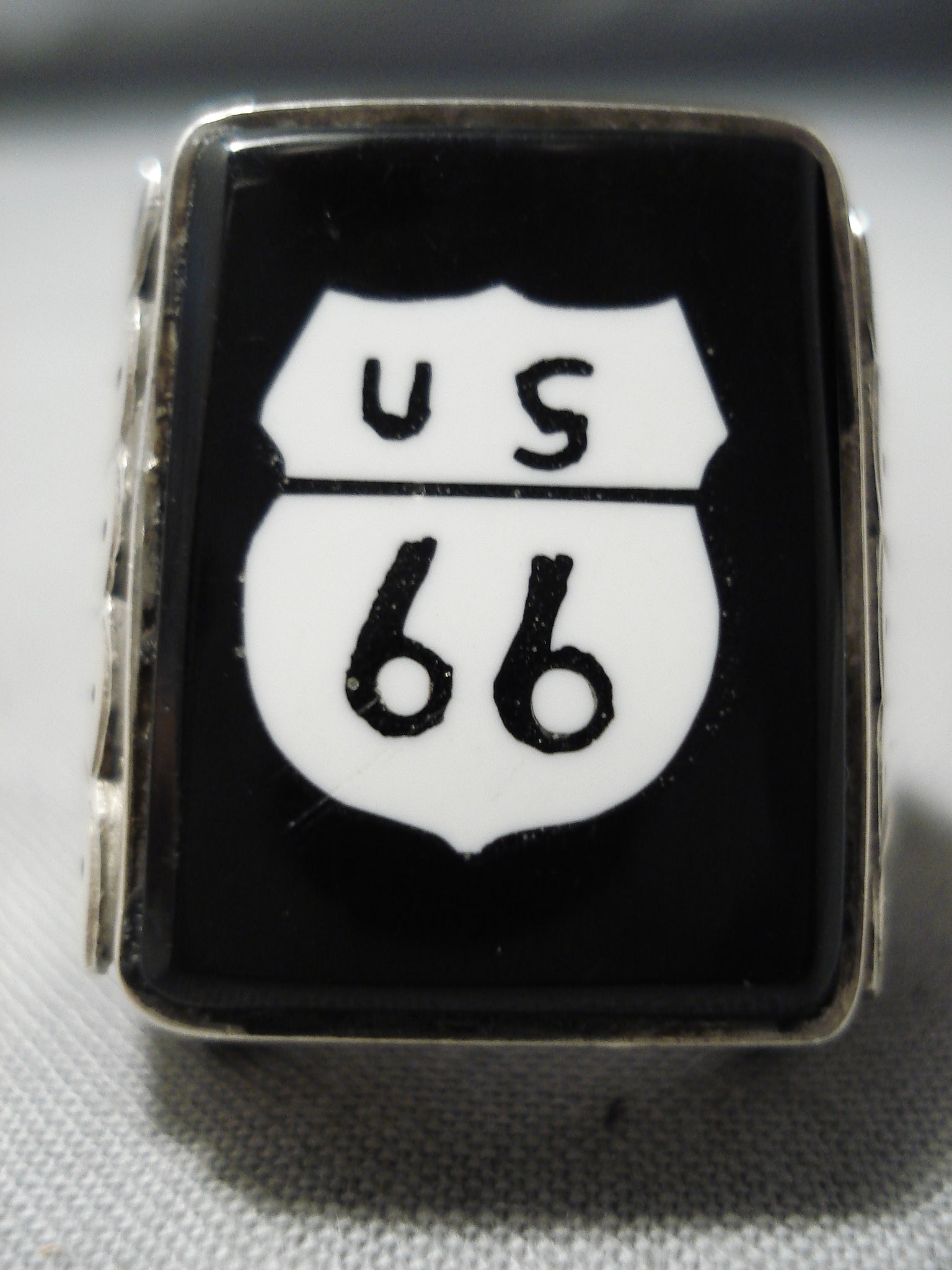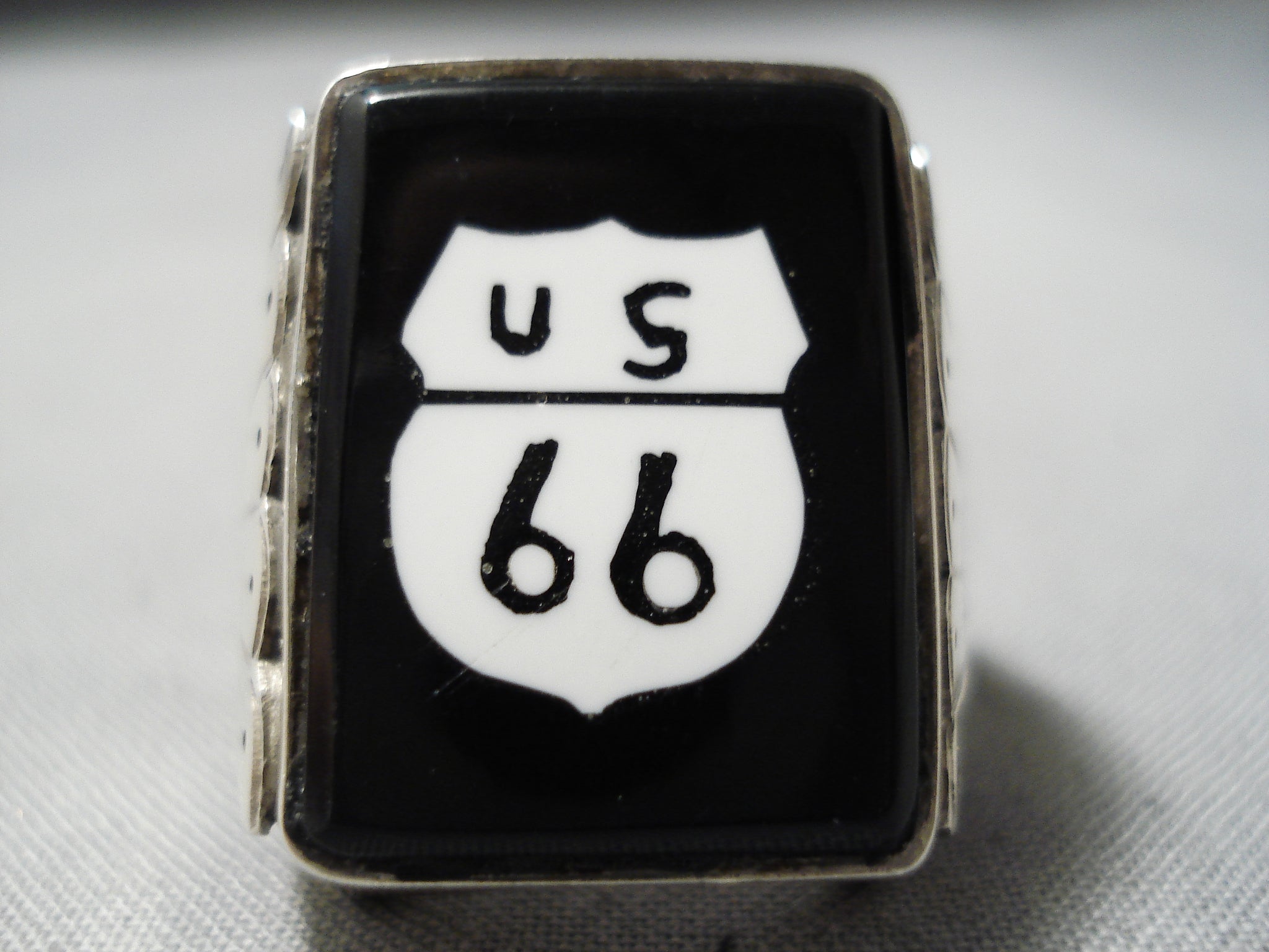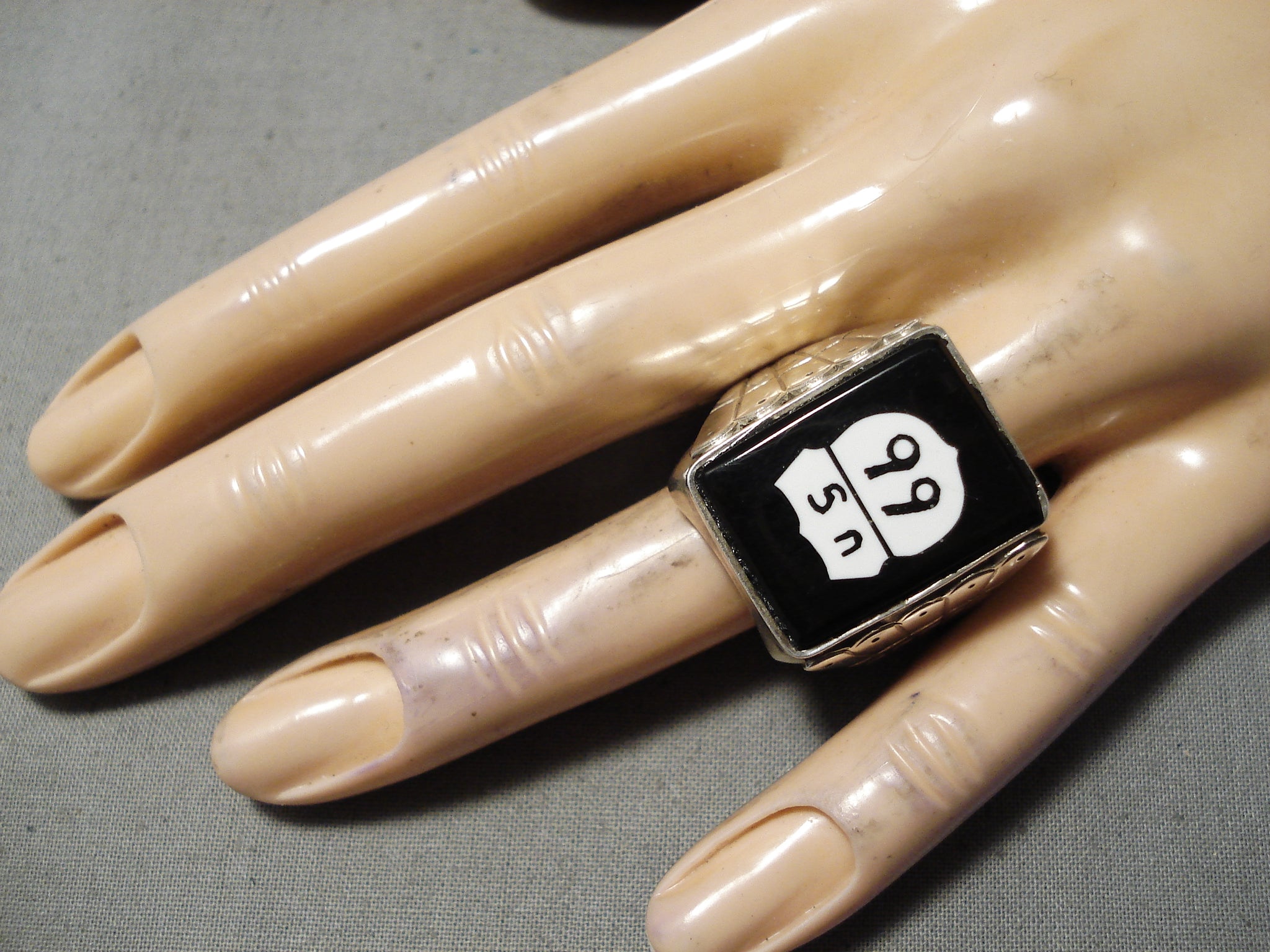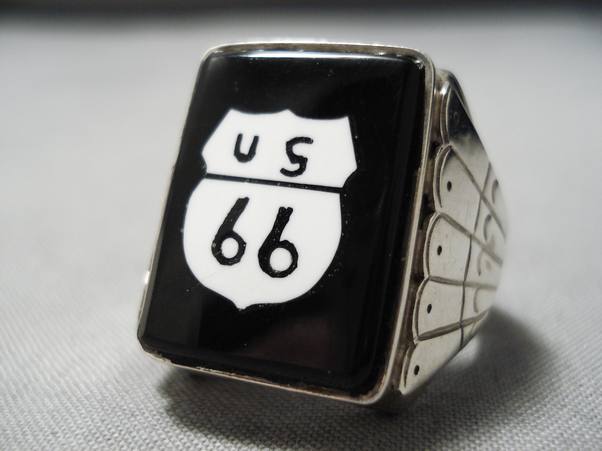 This is an incredible vintage Navajo silver ring. The face of this wide ring is a wonderful replica of the Route 66 highway sign – created of black jet and white shell! The ring face measures around 7/8" x 1". Signed by Navajo artist, Calvin Desson. The ring size is around 11. Sterling silver, marked. Sturdy 26 grams.