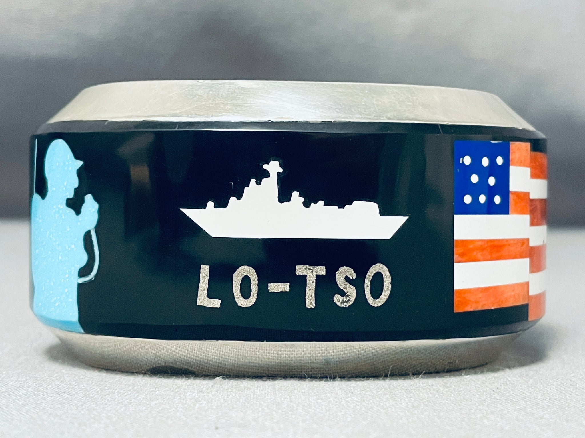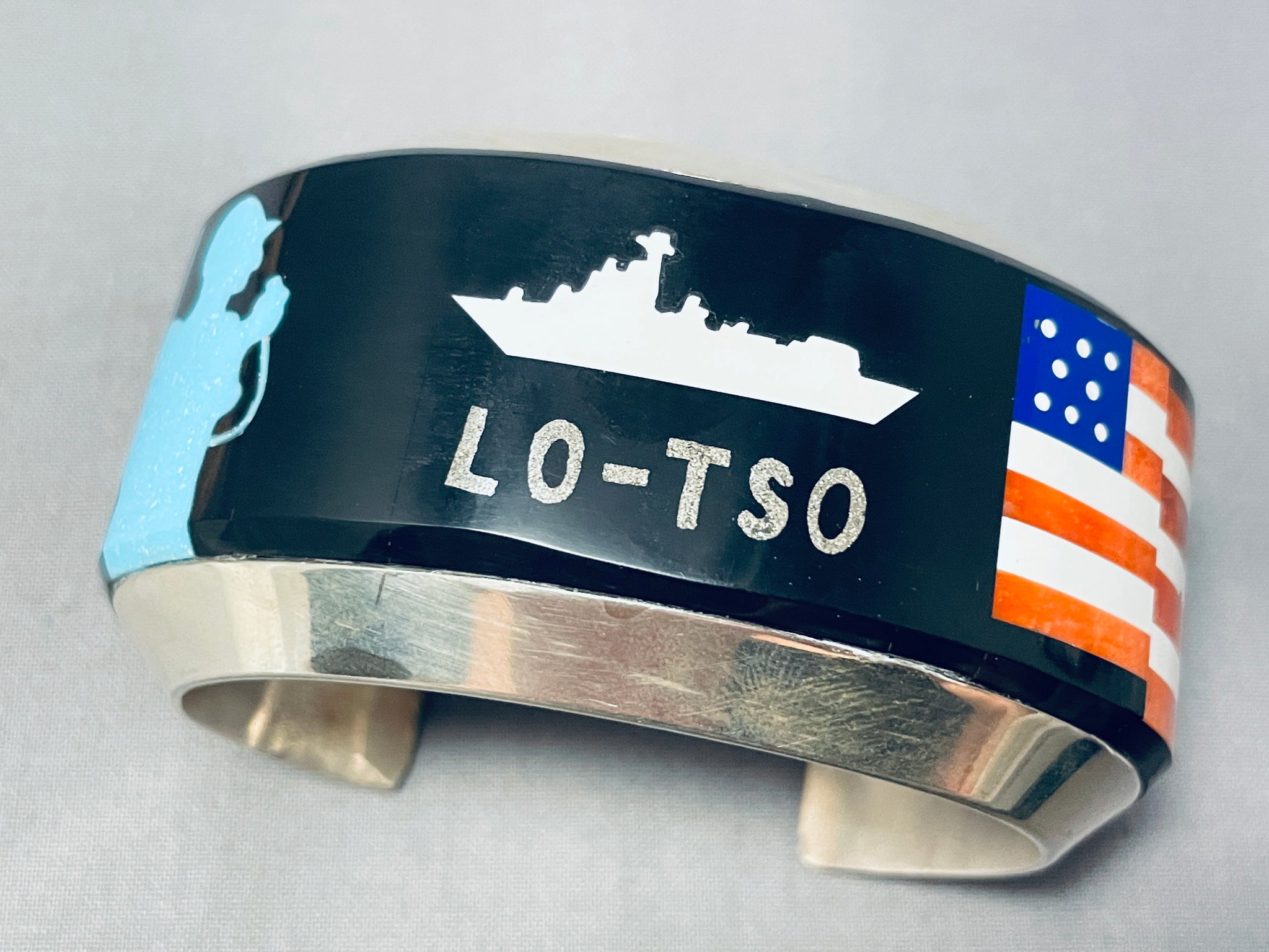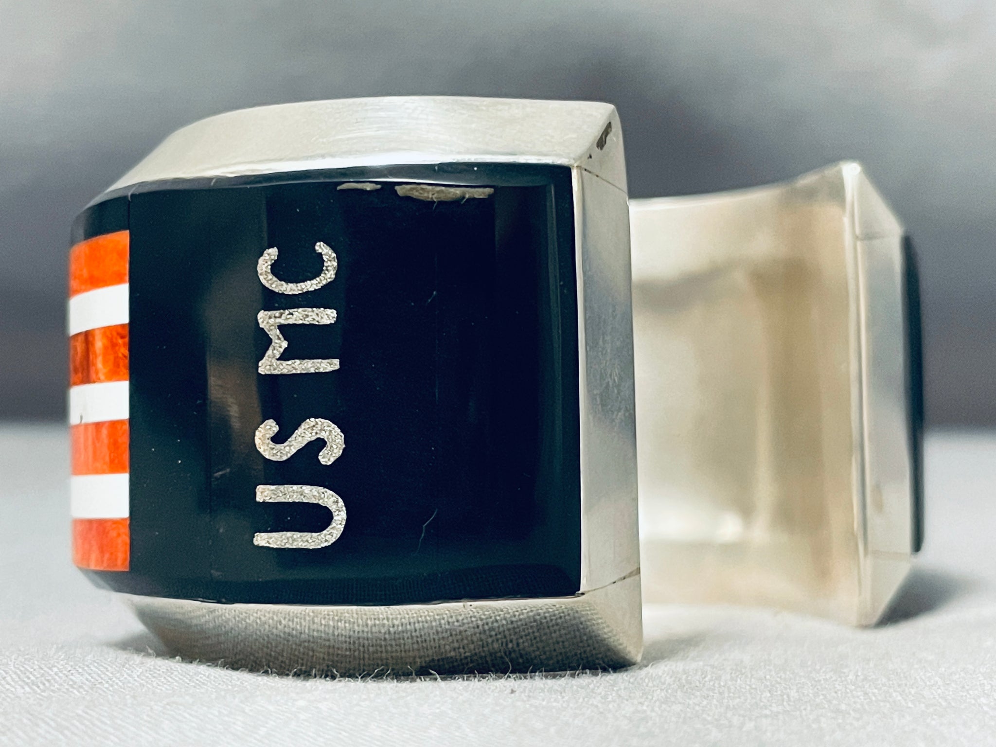This is a tremendous Navajo very impressive detailed inlaid silver cuff bracelet. This impeccable wide cuff silver bracelet contains outstanding workmanship of inlay work that includes WWII letters, turquoise inlaid soldier, battleship, waving American flag, USMC letters and LO-TSO letters. During the war the codetalkers would use the code word Lo Tso which means whale in Navajo and refers to battleship. Again, the intricacy on this bracelet is absolutely mind blowing. The inlay includes onyx, Sleeping beauty turquoise, lapis, white stone, and spiny oyster shells. The cuff is very thick, wide and heavy, JUST WOW! The width of the bracelet measures around 1-5/8". Signed by Navajo artist, Cal Deson. Sterling silver, marked. The inside end to end measures around 5-3/4" with an additional 1-1/4" gap. Sturdy 176 grams.
