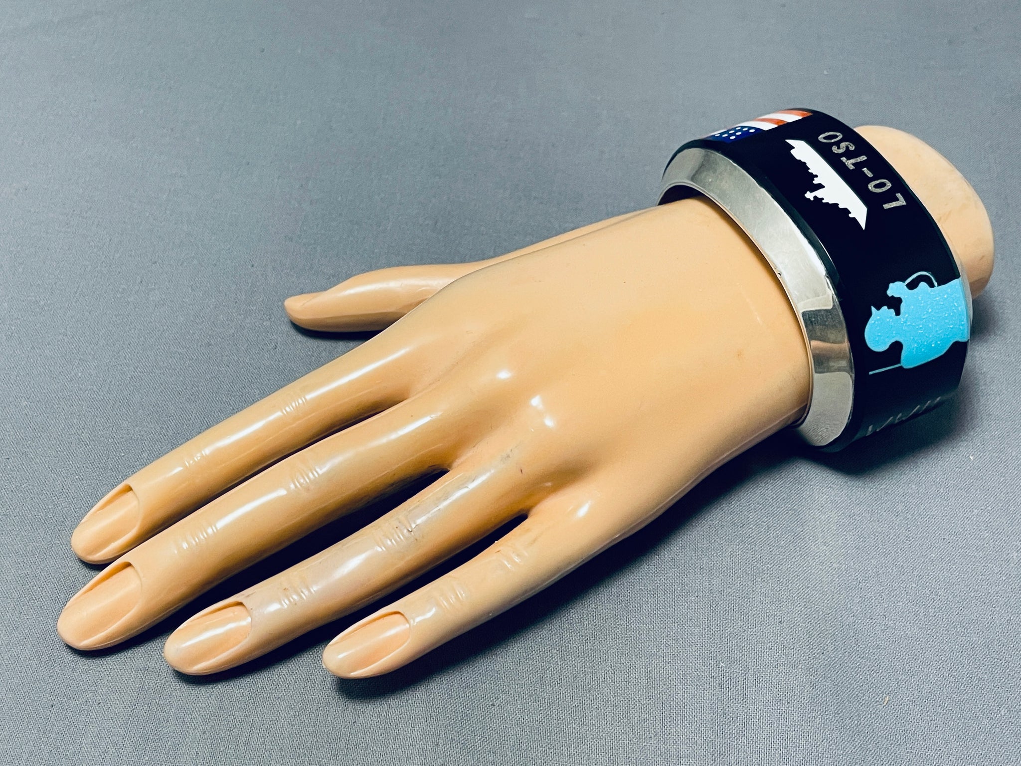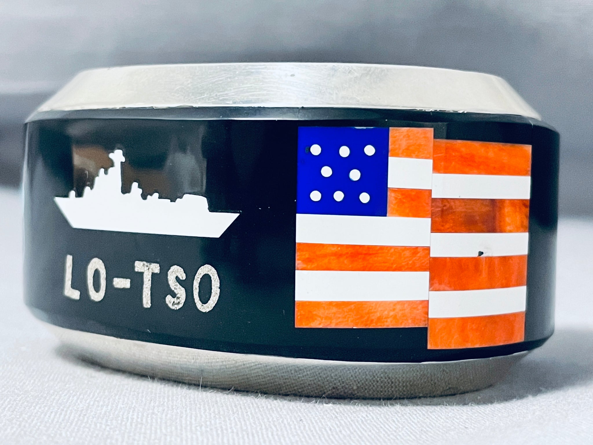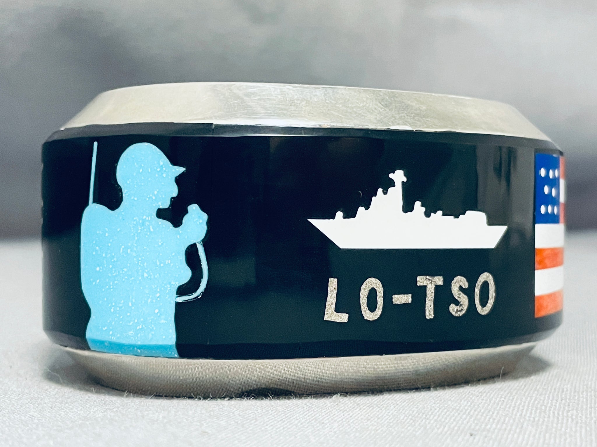 This is a tremendous Navajo very impressive detailed inlaid silver cuff bracelet. This impeccable wide cuff silver bracelet contains outstanding workmanship of inlay work that includes WWII letters, turquoise inlaid soldier, battleship, waving American flag, USMC letters and LO-TSO letters. During the war the codetalkers would use the code word Lo Tso which means whale in Navajo and refers to battleship. Again, the intricacy on this bracelet is absolutely mind blowing. The inlay includes onyx, Sleeping beauty turquoise, lapis, white stone, and spiny oyster shells. The cuff is very thick, wide and heavy, JUST WOW! The width of the bracelet measures around 1-5/8". Signed by Navajo artist, Cal Deson. Sterling silver, marked. The inside end to end measures around 5-3/4" with an additional 1-1/4" gap. Sturdy 176 grams.
