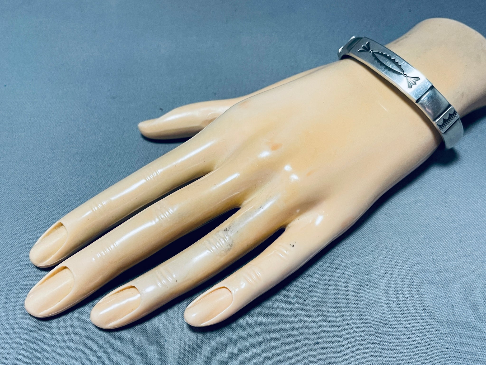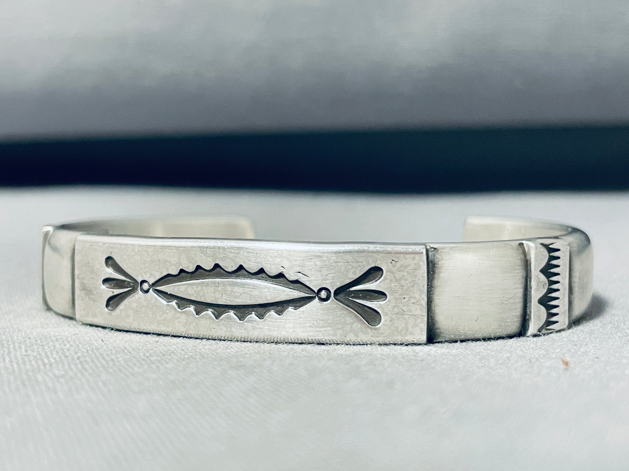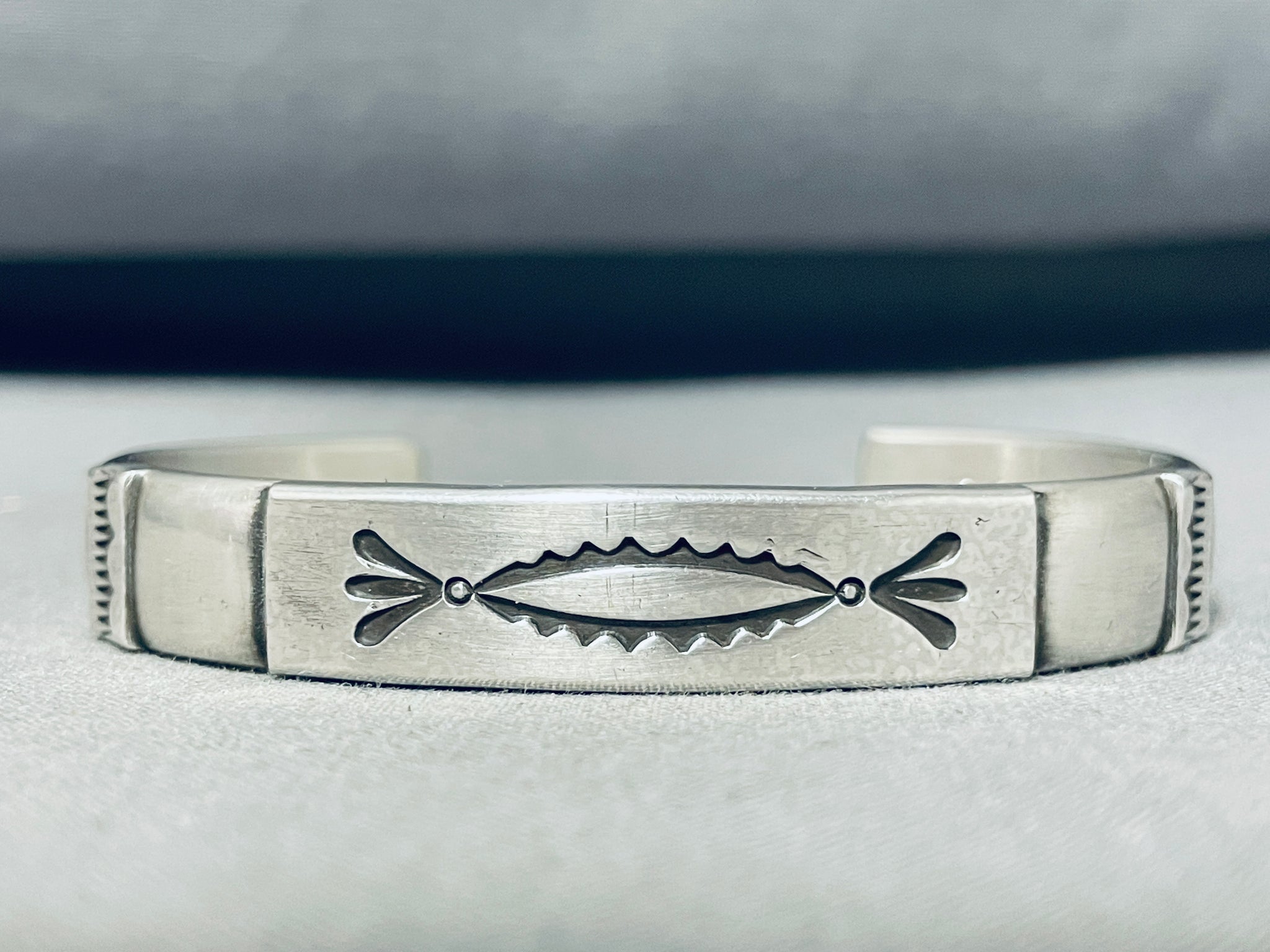 Darryl Dean Begay is a highly acclaimed Navajo jewelry artist celebrated for his innovative approach to traditional silversmithing techniques and his exceptional craftsmanship. Known for his intricate and meticulously crafted jewelry, Begay blends traditional Navajo motifs with contemporary design elements to create stunning, one-of-a-kind pieces. His work often features striking geometric patterns, bold use of color, and the inclusion of high-quality gemstones such as turquoise, coral, and lapis lazuli. Begay's distinctive style reflects his deep respect for Navajo cultural heritage while also pushing the boundaries of modern jewelry design. Over the years, he has earned numerous accolades for his artistry, including prestigious awards at major Native American art markets and exhibitions. Darryl Dean Begay's jewelry is celebrated not only for its aesthetic beauty but also for its ability to bridge the gap between historical tradition and contemporary creativity, making him a prominent figure in the world of Native American art. The width of the bracelet measures around 3/8". Signed by Navajo artist, Darryl Dean Begay. Sterling silver, marked. The inside end to end measures around 5-3/8" with an additional 1-1/4" gap. Sturdy 41 grams.