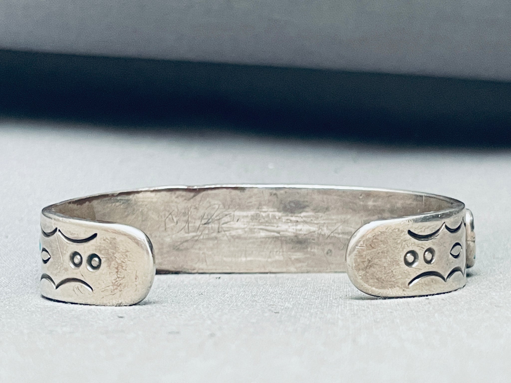 This is an exquisite vintage Navajo multiple stone silver bracelet. This incredible bracelet contains 9 impeccable large and chunky graduating Royston and Blue Gem turquoise stones. Situated throughout the stones are amazing large silver raindrops. This very thick and sturdy silver cuff bracelet graduates in width towards the center. Running down the ends are wave patterns, dotted works and oval patterns. The center stone measures around 5/8" x 3/8". The width of the bracelet measures around 5/8". Sterling silver. Cir. Early Century +. The inside end to end measures around 5-1/2" with an additional 1" gap. Sturdy 62 grams.