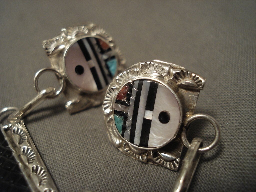 This is an amazing vintage Zuni Native American jewelry silver pair of inlaid earrings handmade by the famous artist Eldred Martinez. What makes Eldreds pieces so unique is the fact that she beautifully hand carves the stones to give the piece more depth and intricacy. These earrings contains outstanding inlay that consists of remarkable coral, onyx, turquoise and multiple colored shells. The earrings contain wonderful sun face inlaid patterns. Surrounding the earrings are incredible silver sun patterns with accenting silver shells. Each earring measures around 3-1/4" X 3/4". The earrings weigh around 13 grams. LAYAWAYS- We are happy to work with you and are more flexible than anyone on the net. Simply send us an email for more information.