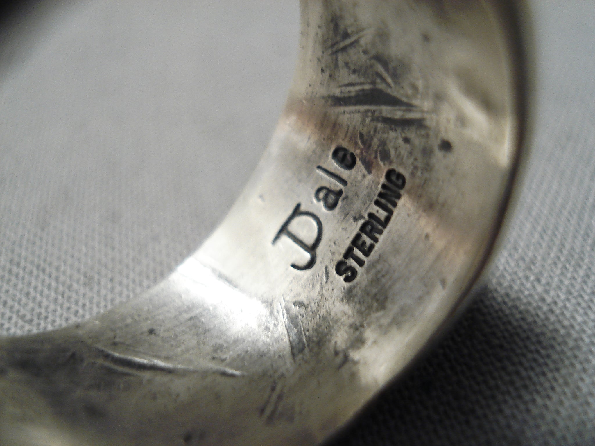 This is a marvelous vintage Navajo silver ring having a round Old Kingman turquoise center on a handcarved graduated solid silver band with silver handstampings and handcarvings all around! Simply Stunning! The center stone measures around 3/8" x 3/8". The ring face measures around 1" x 1/2". Signed by Navajo artist, Jeanette Dale. The ring size is around 8. Sterling silver, marked. Sturdy 8 grams.