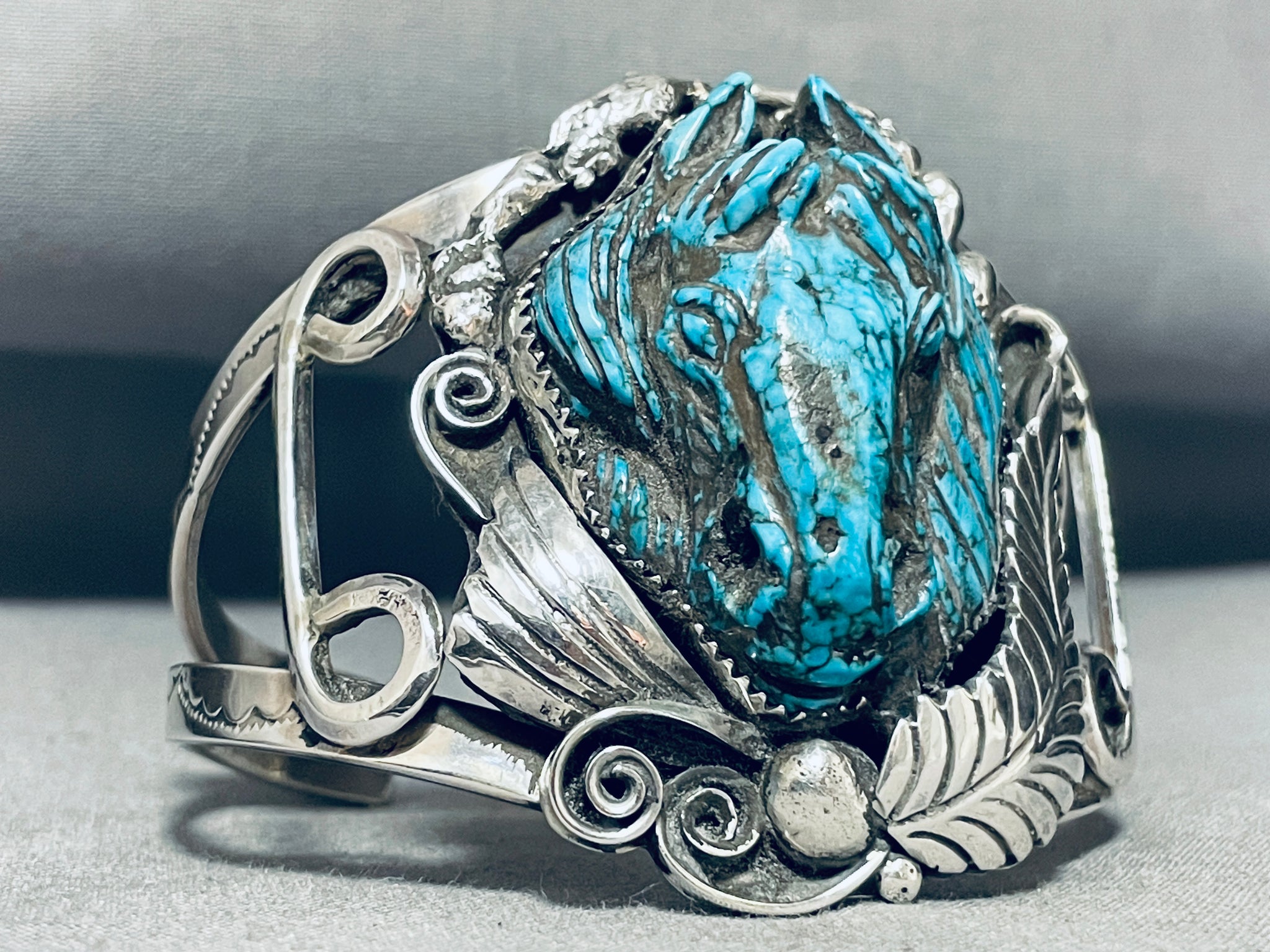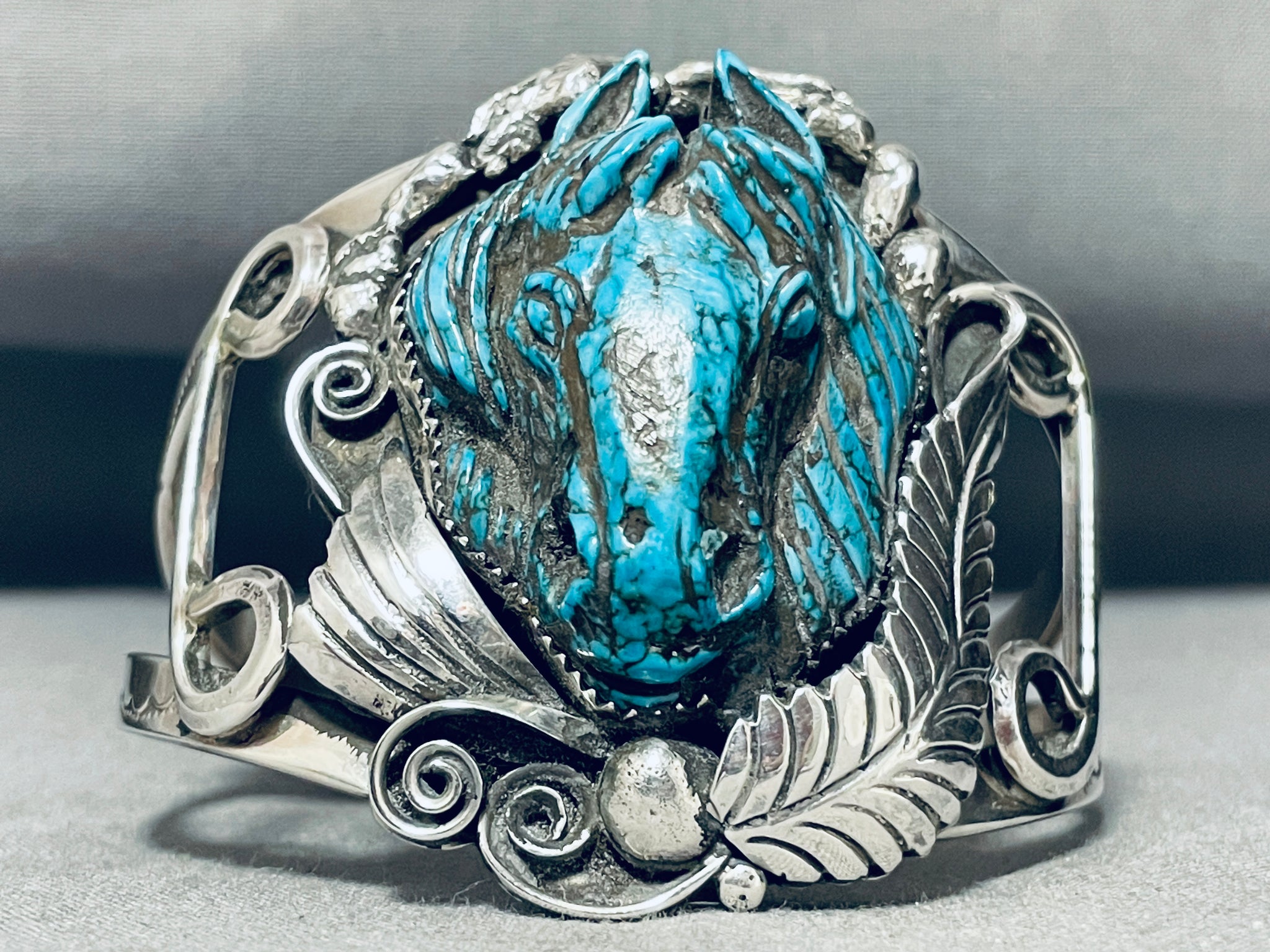 Important Francisco Gomez Hand Carved Horse Turquoise Sterling Silver Bracelet