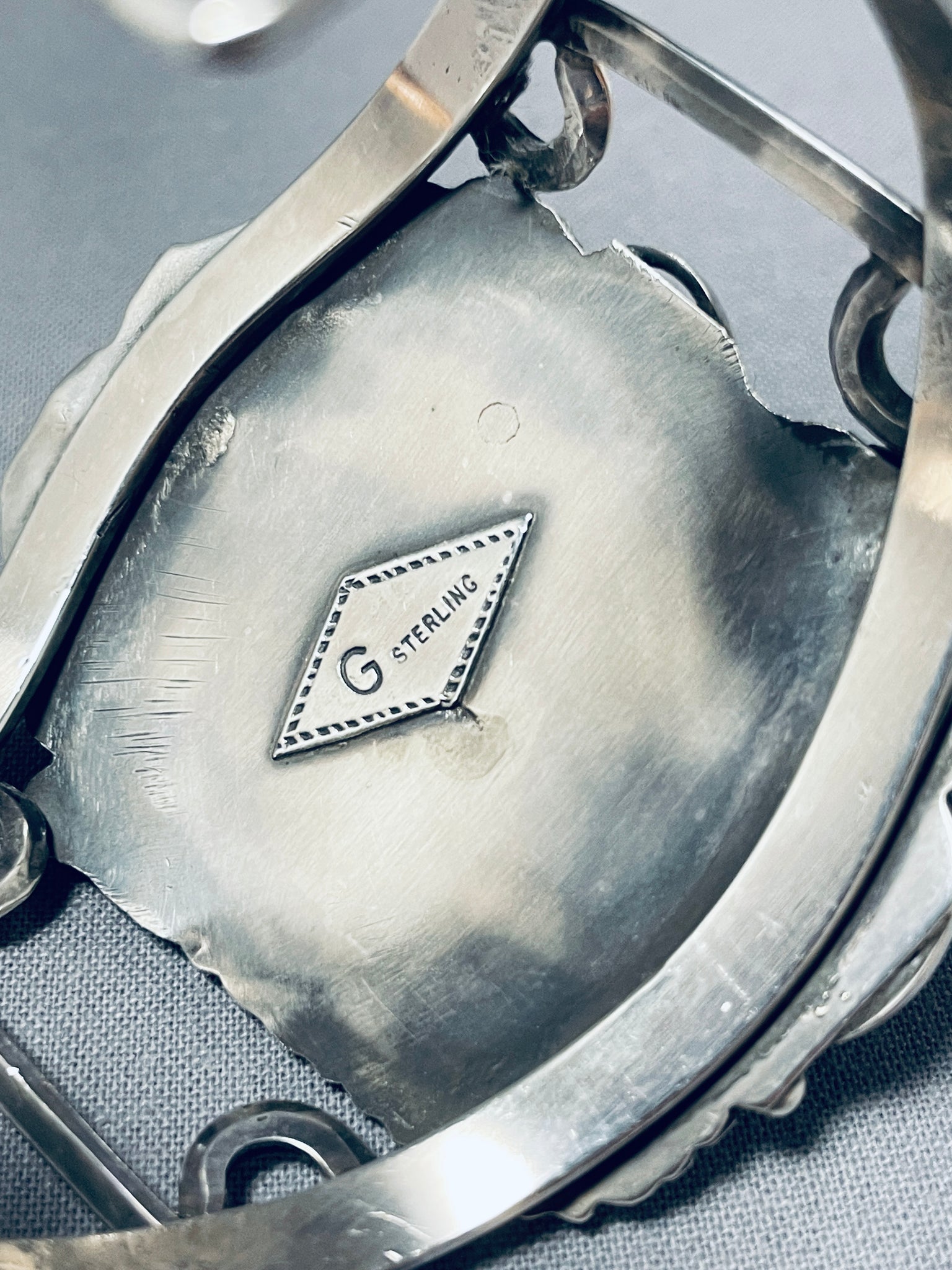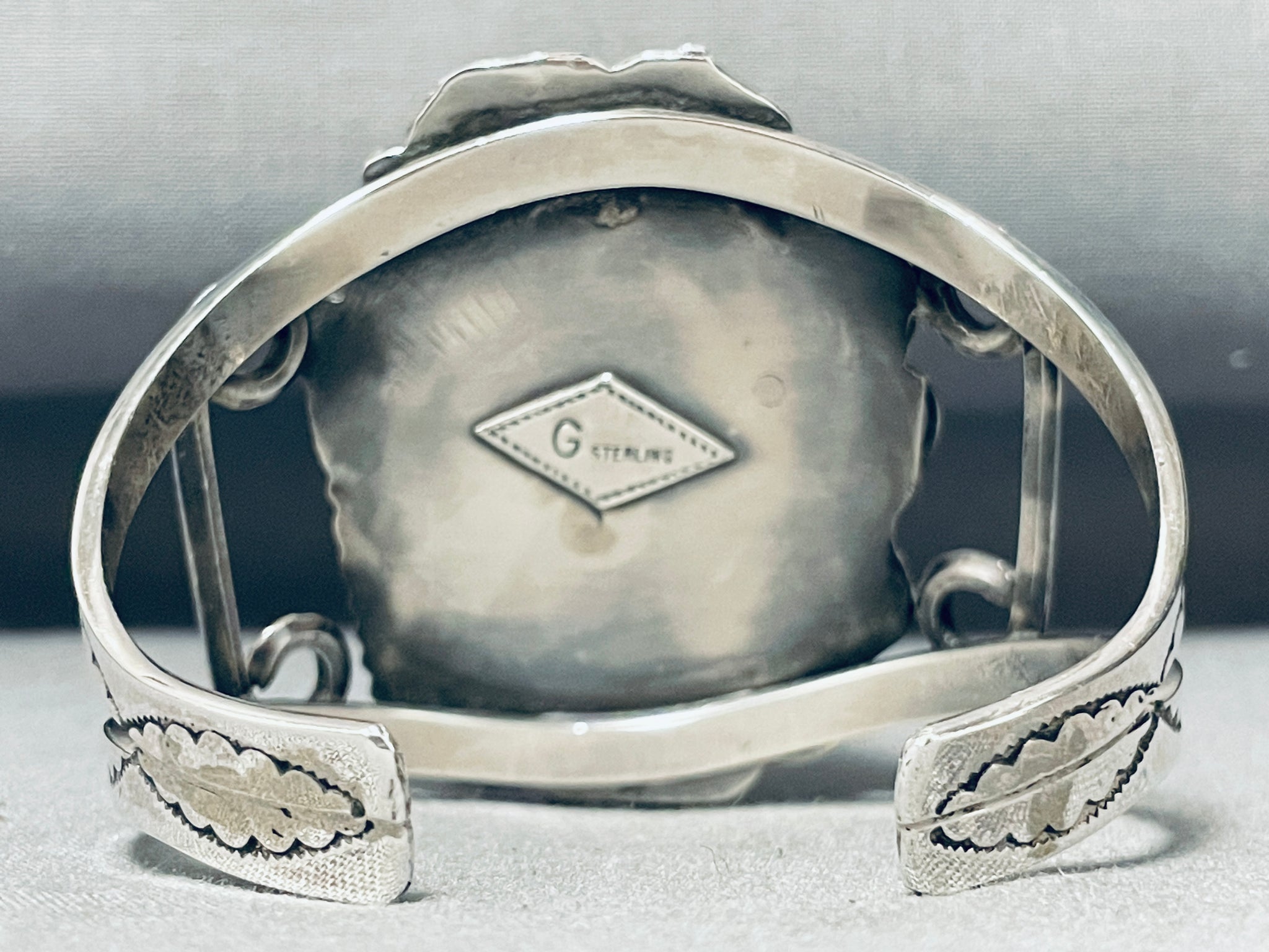 This is a superlative hand carved single stone silver bracelet handmade by the famous artist, Francisco Gomez. This wonderful bracelet contains a marvelous center hand carved turquoise stone that is carved into a beautiful horse. The detailing is just phenomenal. Surrounding the stone are incredible silver works that consist of silver slabs, raindrops, swirling stems, fans and leaves. I absolutely love the wonderful side accenting thick silver stem flanks. This bracelet contains a stunning thick and sturdy double silver shank cuff with long sun stampings that run down the ends. The center stone measures around 1-1/2" x 1-3/8". The width of the bracelet measures around 2-1/8". Signed by artist, Francisco Gomez. Sterling silver, marked. Cir. 1980's+. The inside end to end measures around 5-3/4" with an additional 3/4" gap. Sturdy 59 grams.