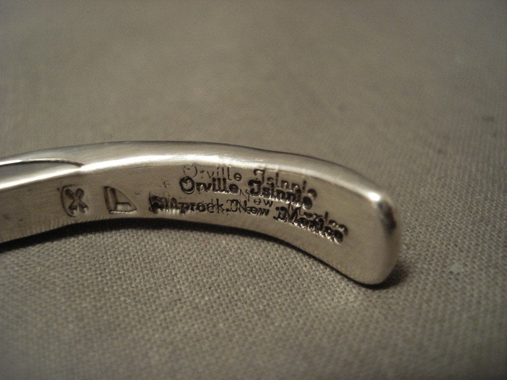This is an astounding Navajo Native American jewelry Native American jewelry all silver bracelet handmade by the very famous artist, Orville Tsinnie. This piece is absolutely remarkable as the very thick and heavy silver cuff is wonderfully squared and then hand pounded on the ends. Look at how the stamp works appear on the sides of the shank which is just amazing. The thickness of this bracelet measures around 1/4". The width of the bracelet measures around 1/4". Signed by Navajo Native American jewelry Native American jewelry artist, Orville Tsinnie . Sterling silver, marked. The inside end to end measures around 6" with an additional 1-1/2" gap. Sturdy 47 grams. LAYAWAYS- We are happy to work with you and are more flexible than anyone on the net. Simply send us an email for more information.