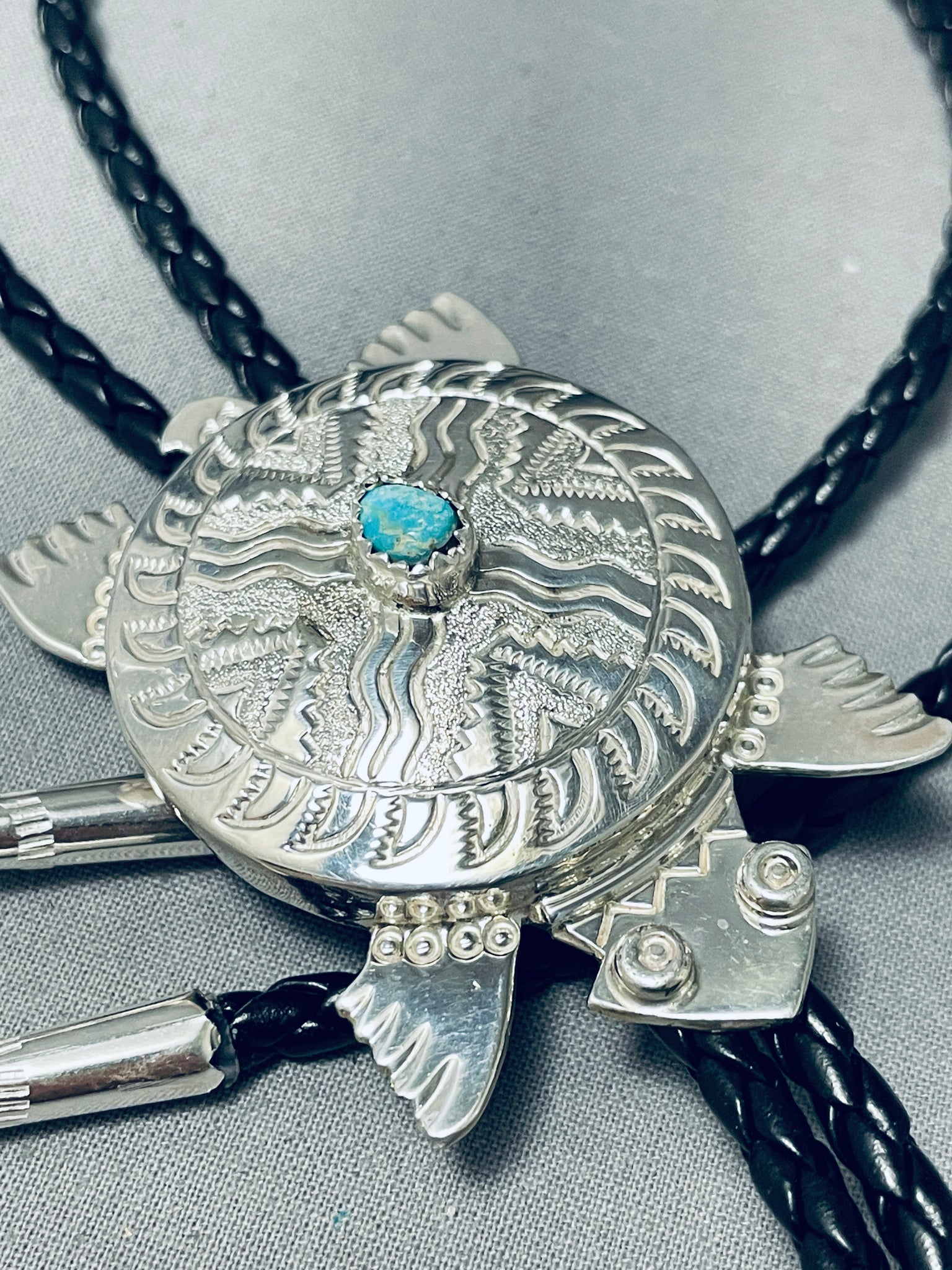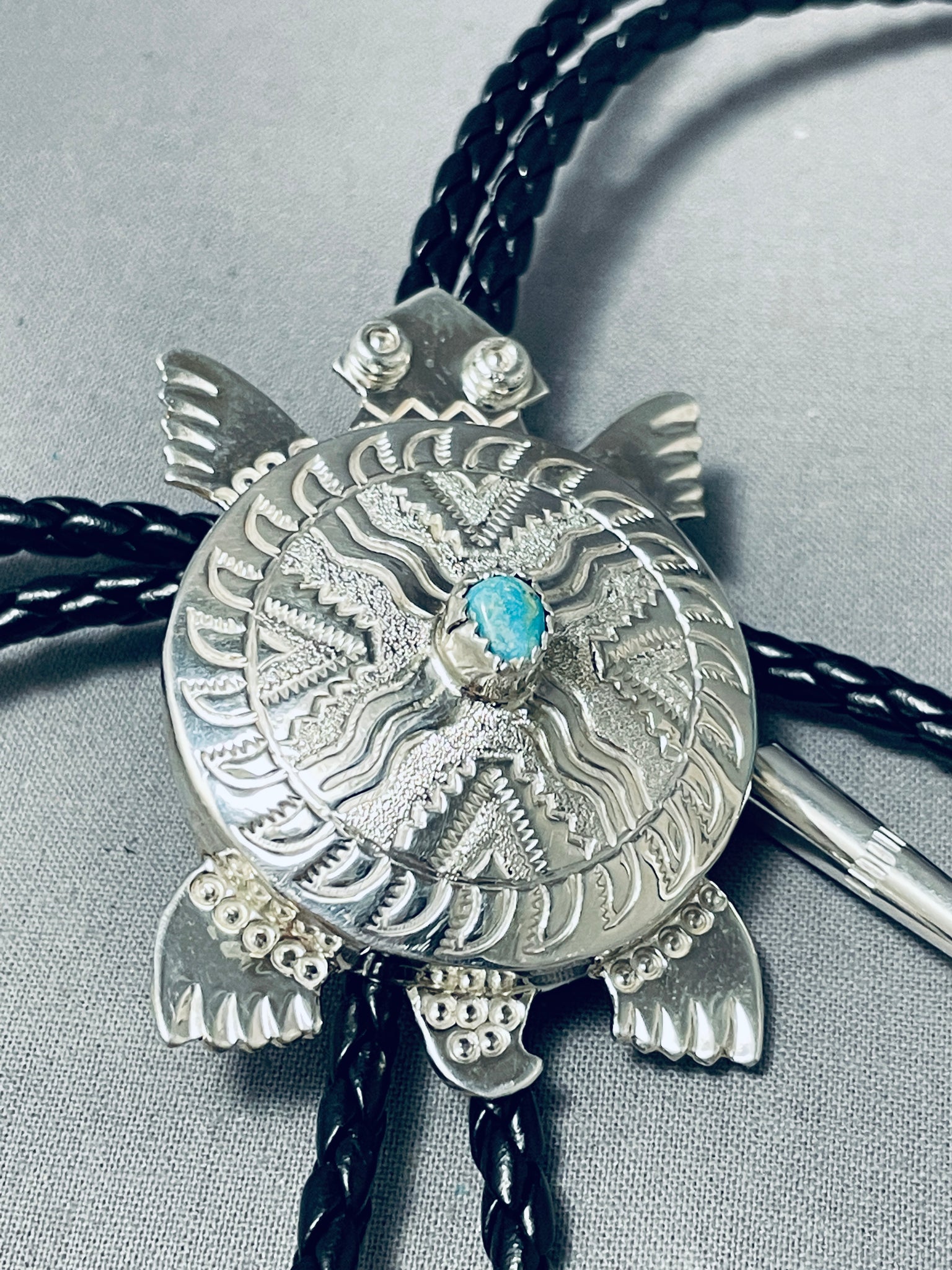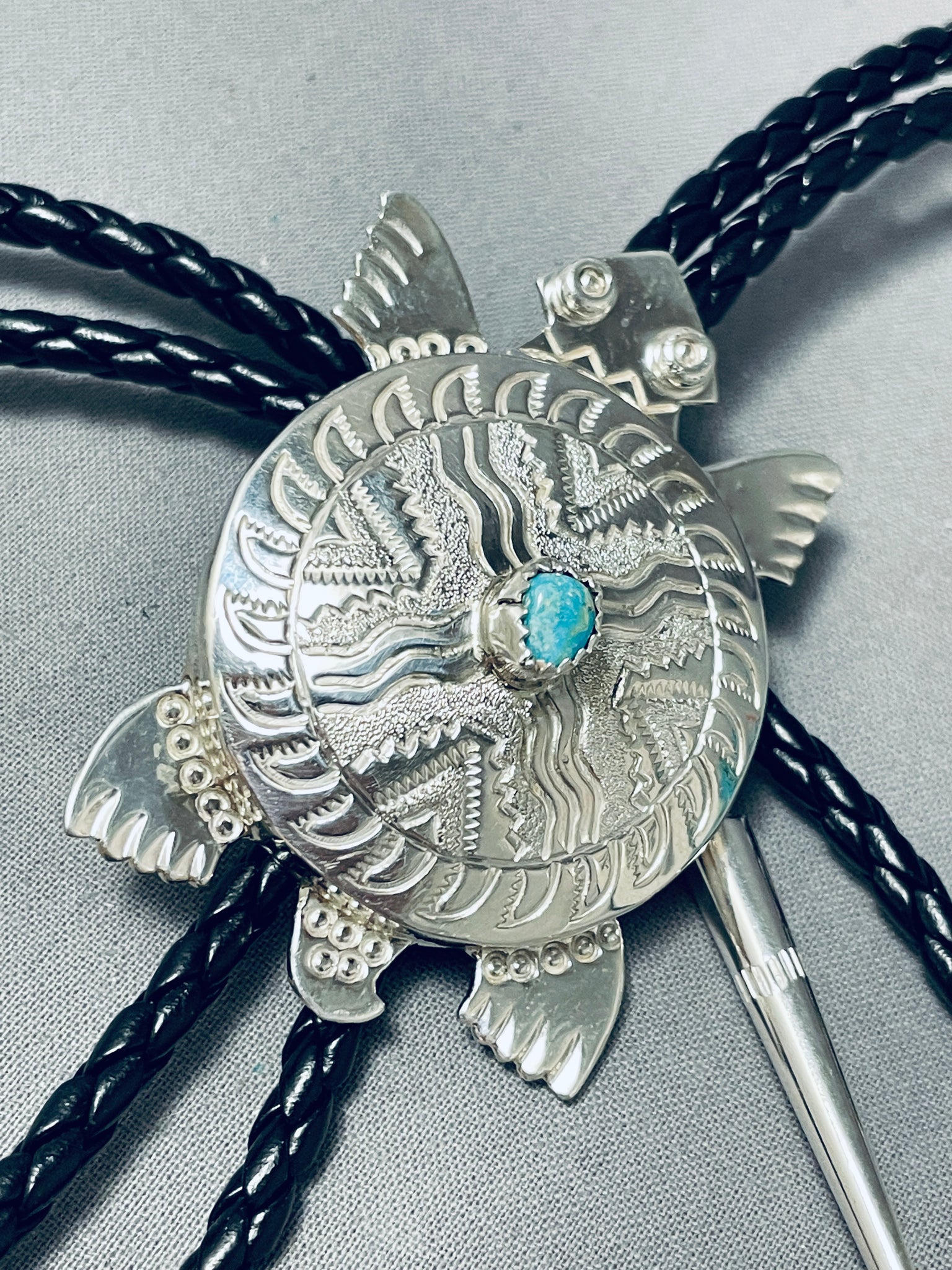 Important Native American Navajo Signed Turquoise Sterling Silver Turtle Huge Bolo
