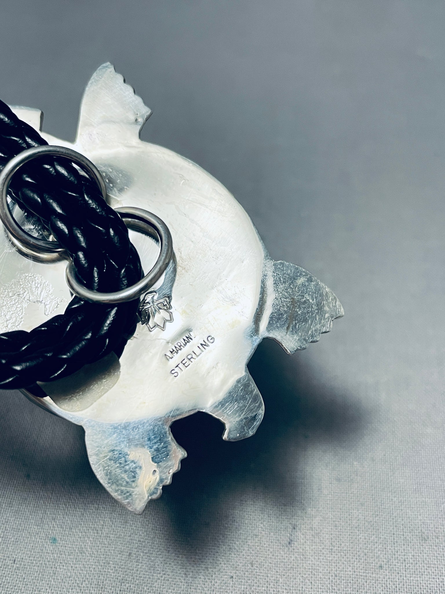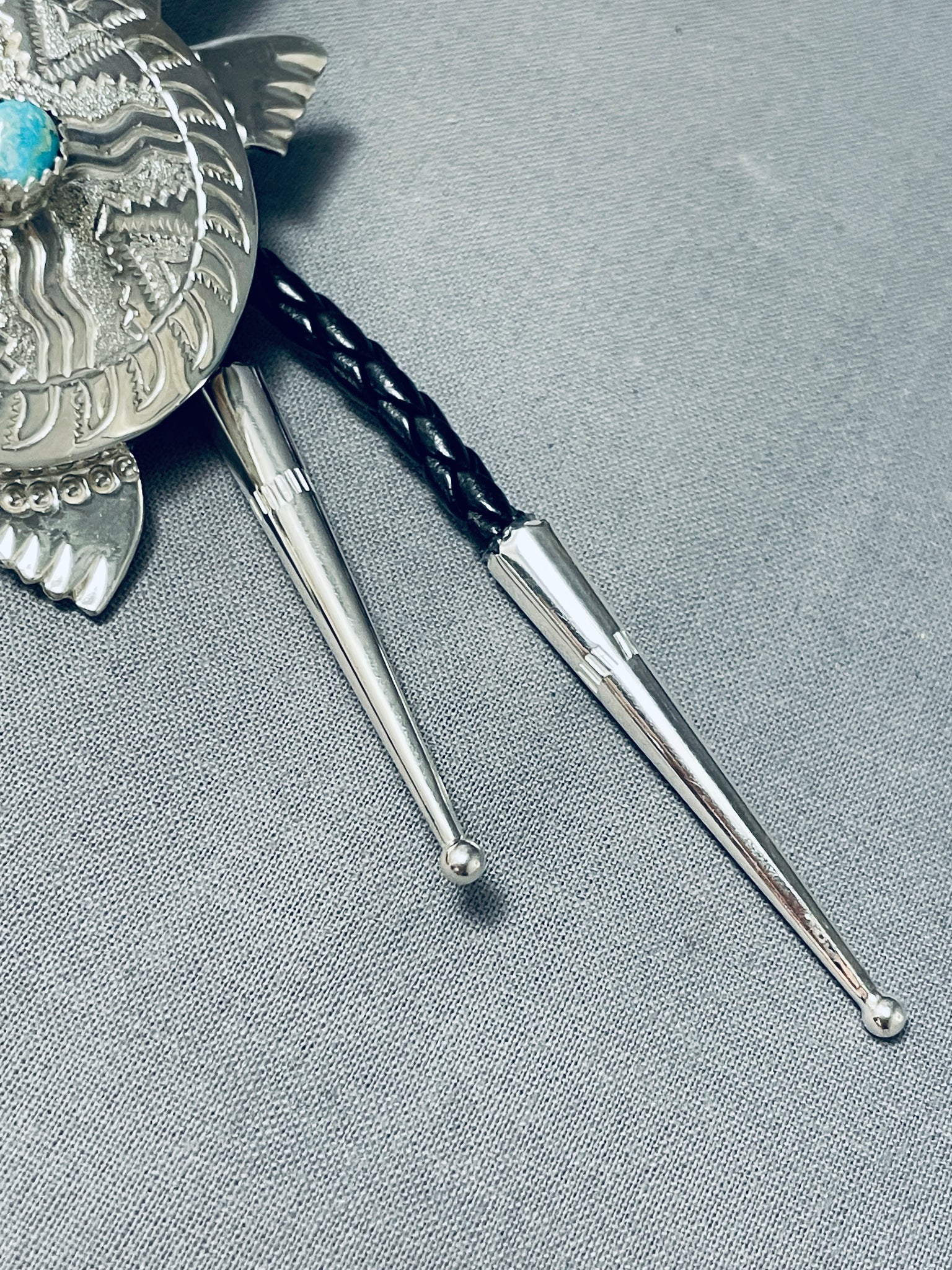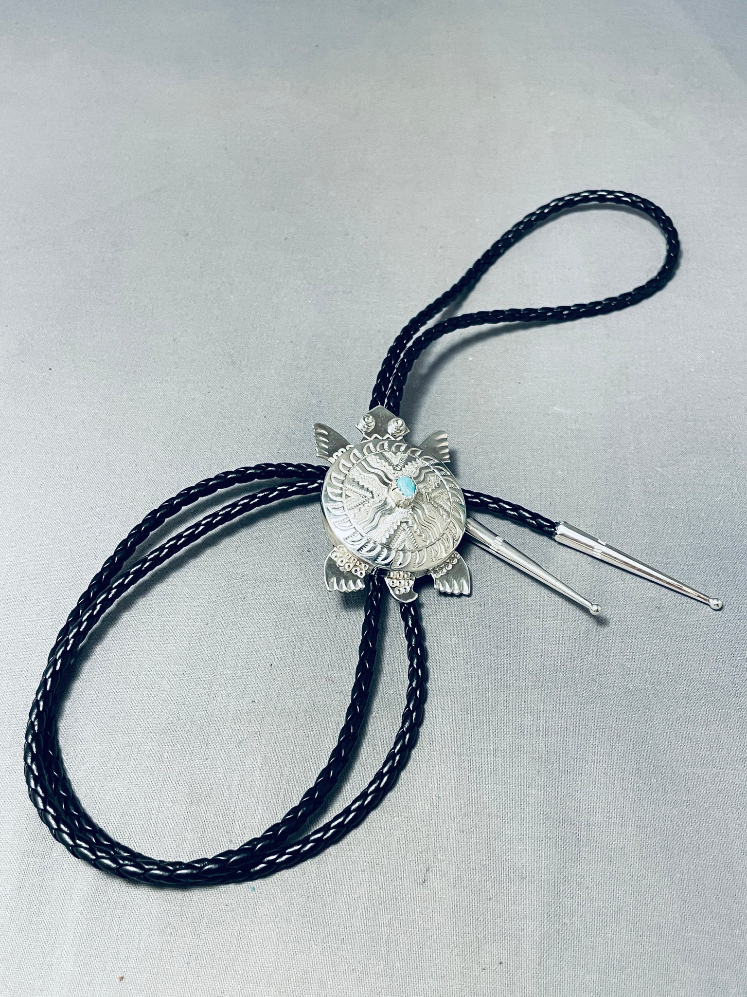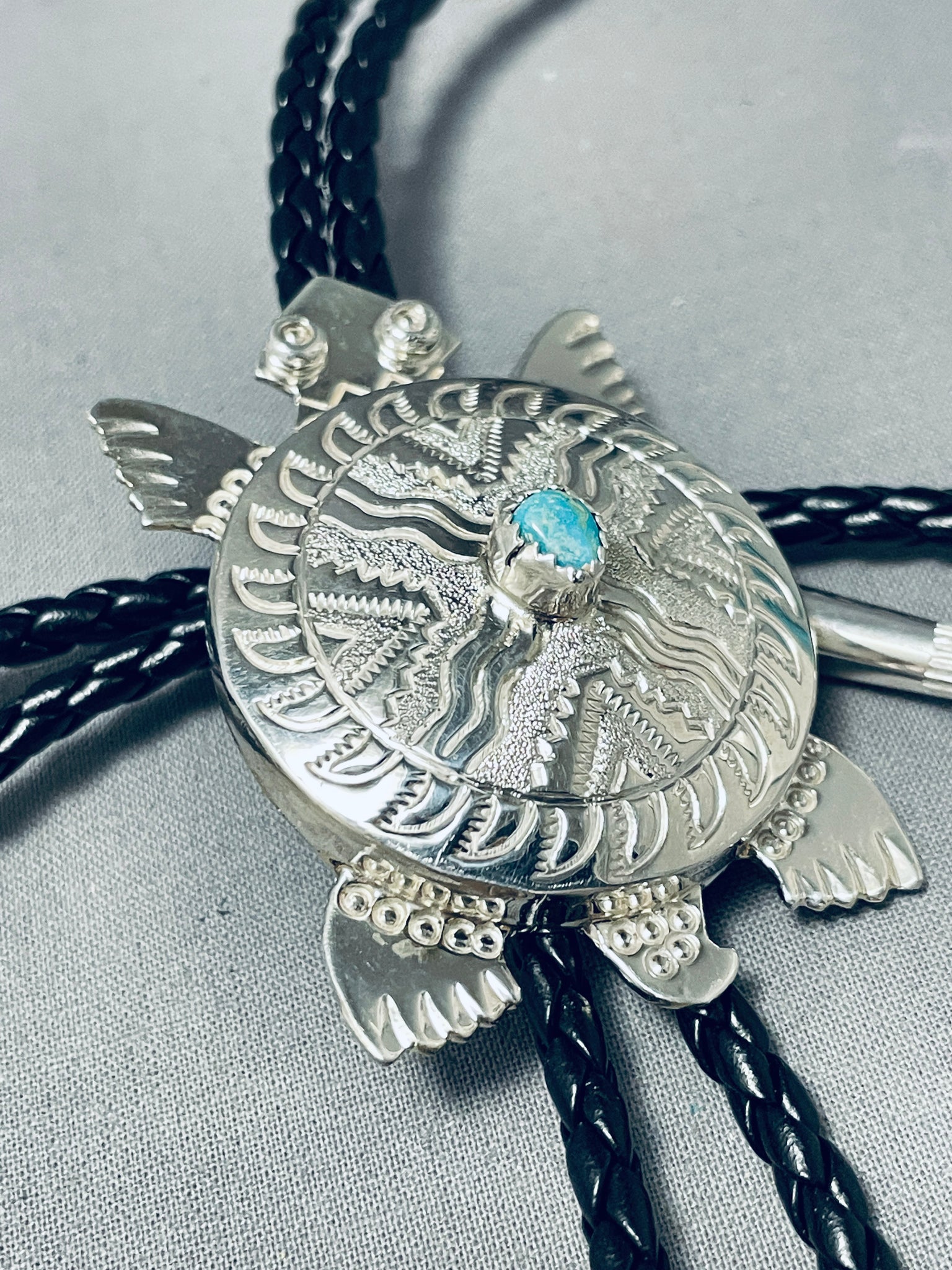 Important Native American Navajo Signed Turquoise Sterling Silver Turtle Huge Bolo