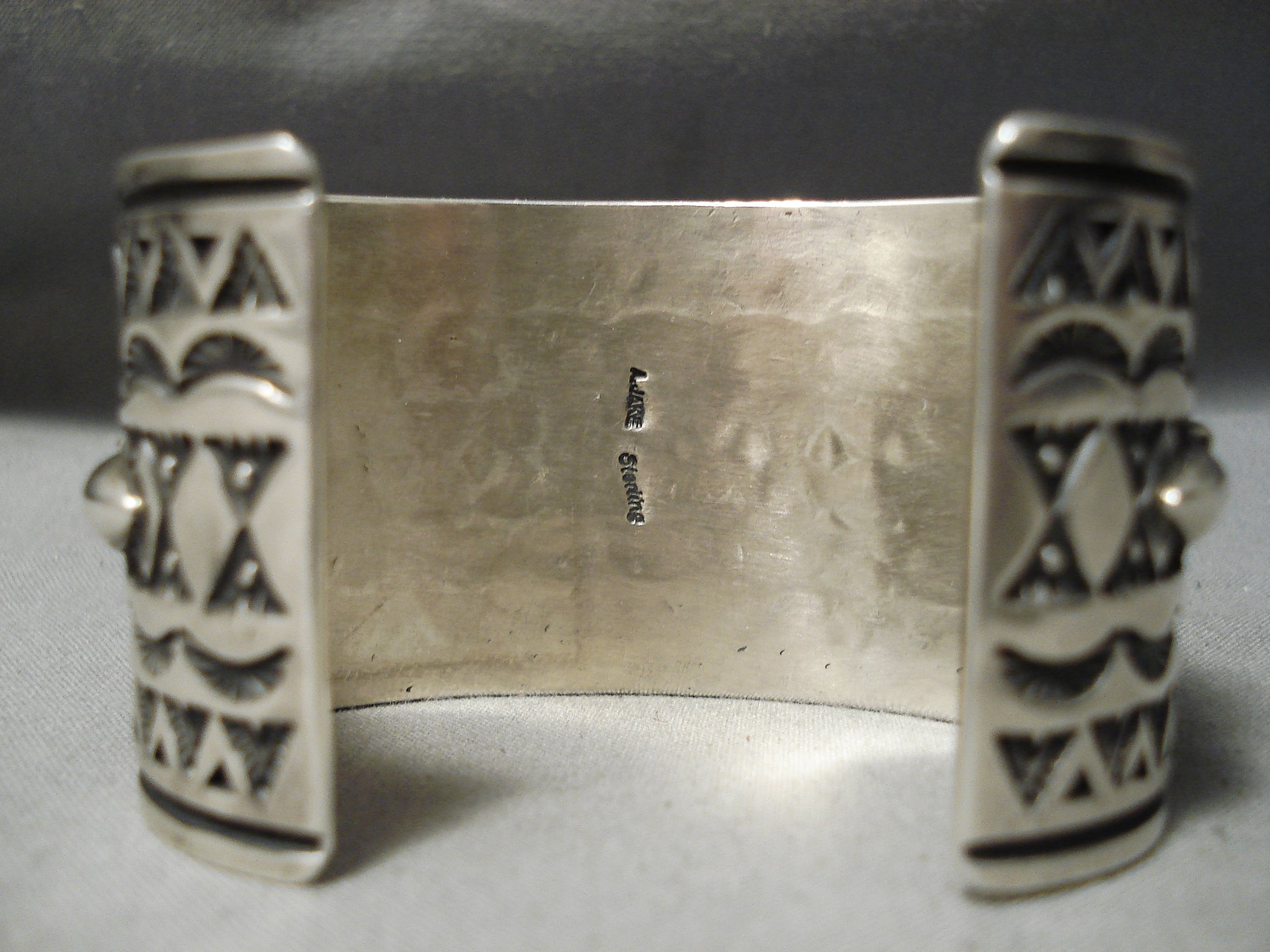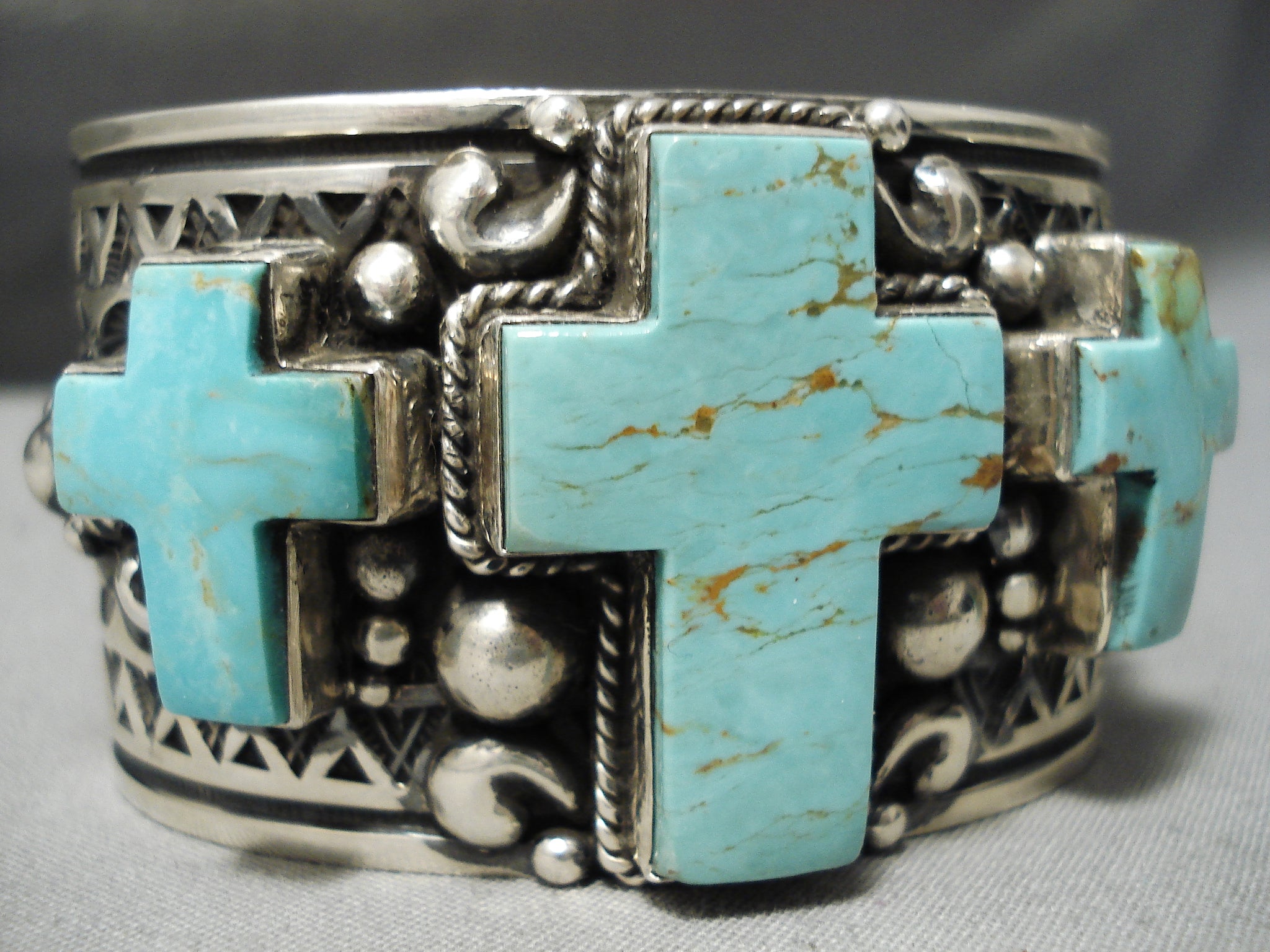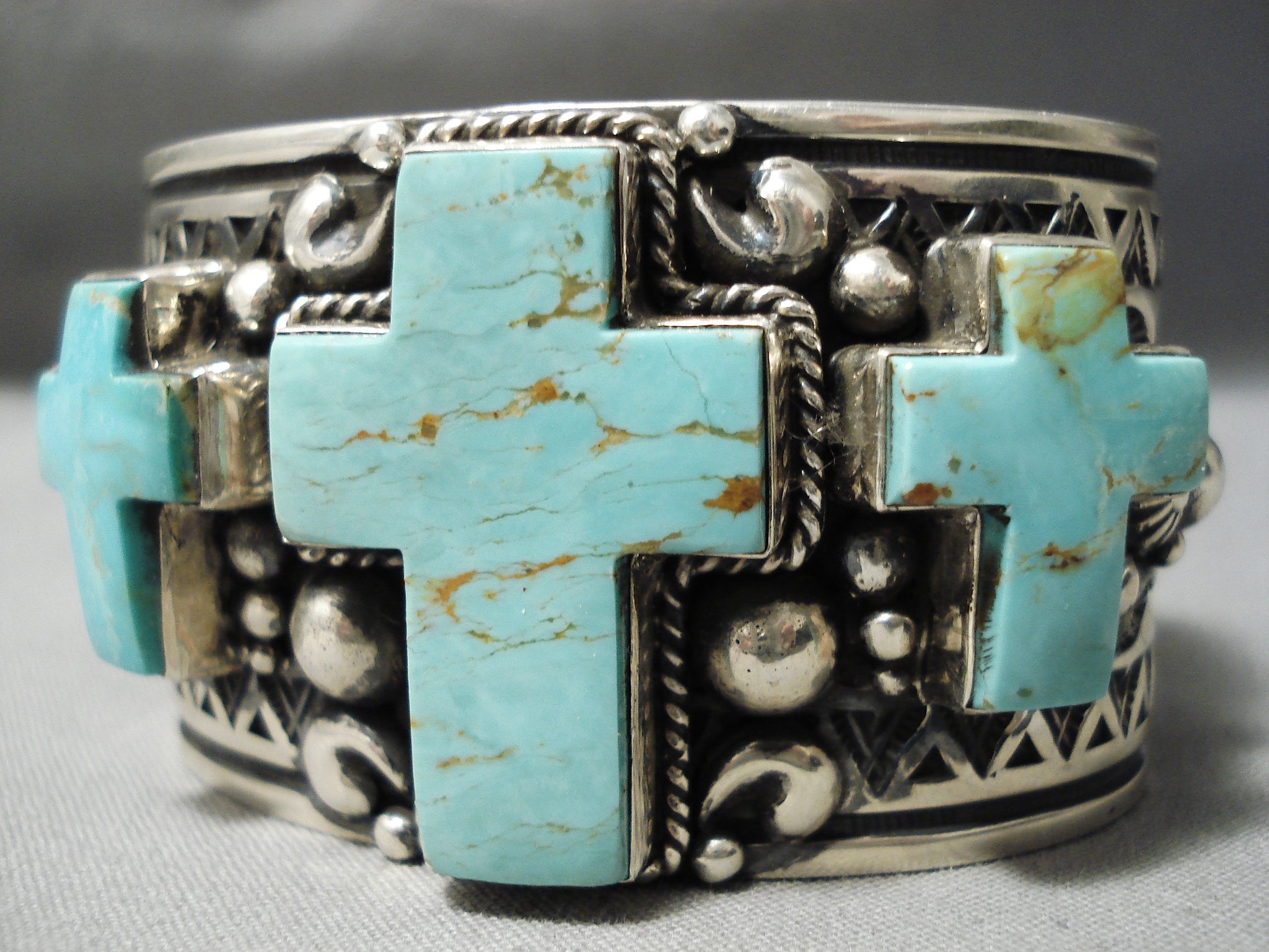 Important Native American Navajo Turquoise Christian Cross Sterling Silver Bracelet Heavy