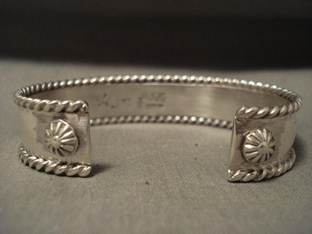 This is an incredible vintage Navajo Native American jewelry Native American jewelry museum quality silver bracelet handmade by the famous artist Ben Begaye. This is one of the more unique pieces we have seen as it contains 7 stones total, 4 light blue Carico Lake turquoise stones and 3 lapis stones. Nestled between the stones are wonderful handmade silver raindrops and bordering the entire cuff on both top and bottom are superior hand twisted silver ropes. Resting on each end of the cuff are striking silver shells. This bracelet is very thick and sturdy. The center stone measures around 1/2" x 3/8". The width of the bracelet measures around 5/8". Signed by Navajo Native American jewelry Native American jewelry artist, Ben Begaye . Sterling silver, marked. The inside end to end measures around 5-3/4" with an additional 1" gap. Sturdy 40 grams. LAYAWAYS- We are happy to work with you and are more flexible than anyone on the net. Simply send us an email for more information.