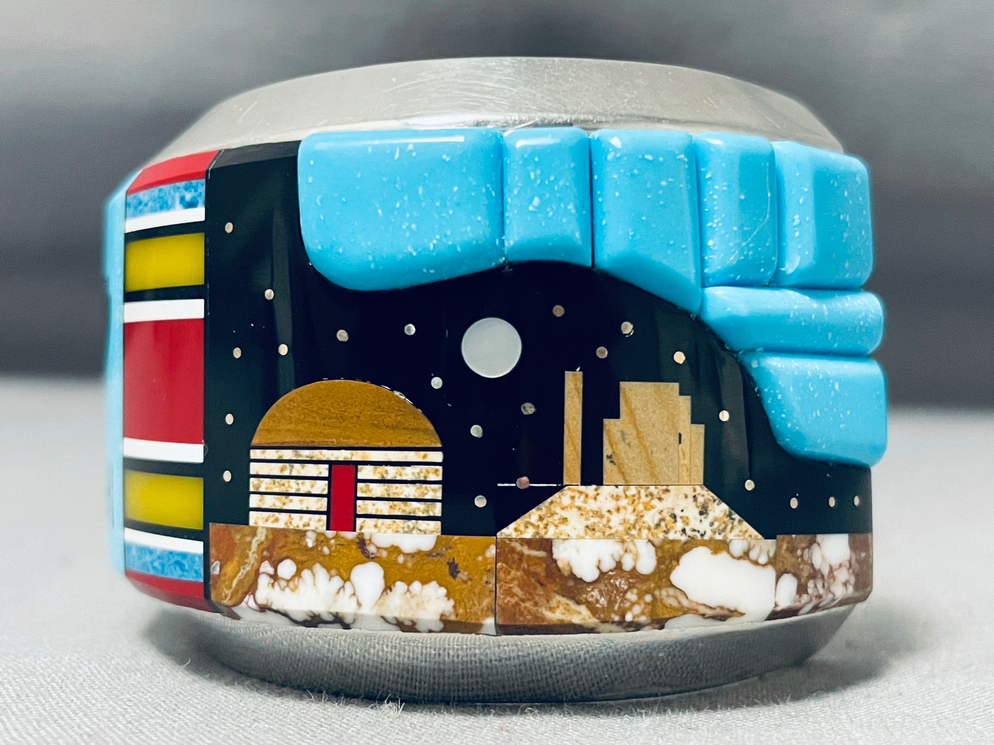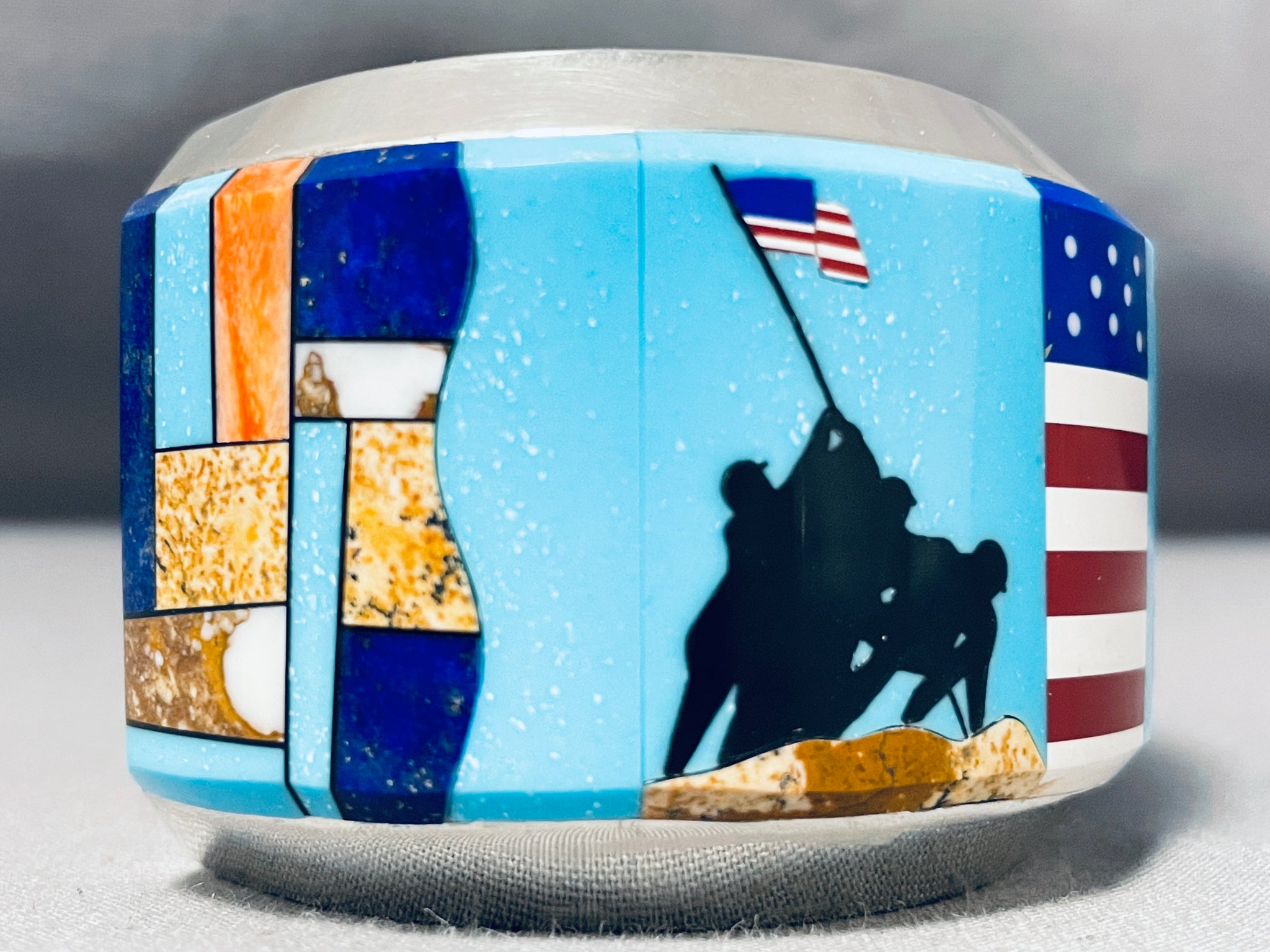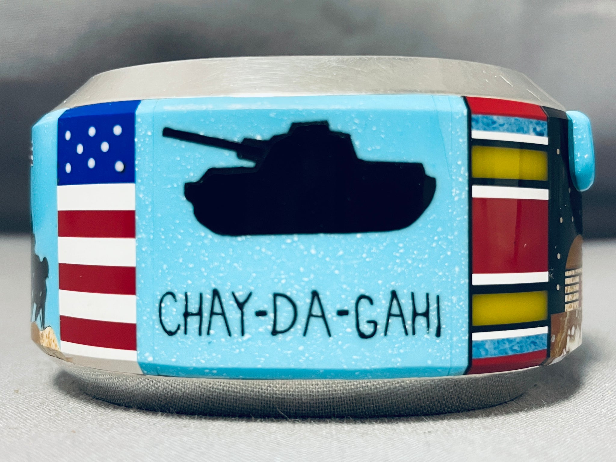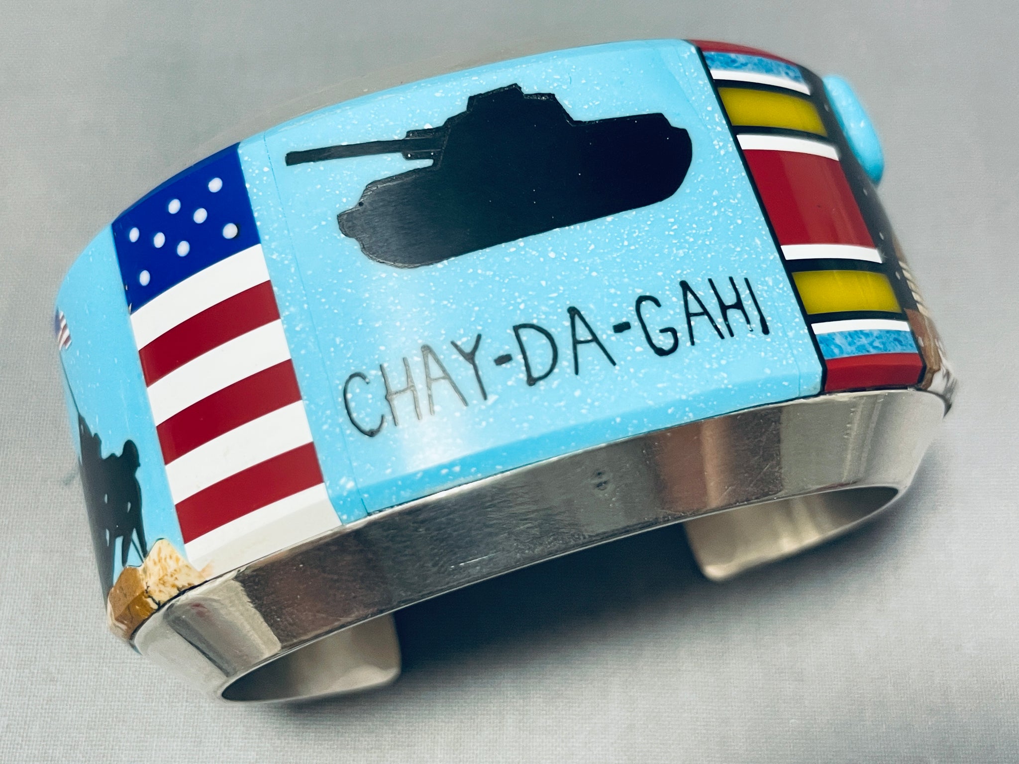 This is a museum quality Navajo inlaid silver cuff bracelet being one of the finest inlaid bracelets we have ever collected. This piece was made by the artist to honor all veterans. Chay-da-gahi means tank and is symbolic. Just check out the intricacy and detailing of all of that superior inlay workmanship. The inlay consists of an American flag, Navajo rug pattern, Navajo scenery of a hogan with a monument being in the background of a desert, Raising the Flag on Iwo Jima, and a center tank. The intricacy of this inlaid bracelet is just spectacular as it was all done by hand, that is absolutely incredible! The inlay on the bracelet includes lapis, white stone, Sleeping Beauty turquoise, coral, onyx, green stones, tan stones, and spiny oyster shells. The width of the bracelet measures around 1-5/8". Signed by Navajo artist, D. Sterling silver, marked. Cir. 1980's+. The inside end to end measures around 5-3/4" with an additional 1-1/4" gap. Sturdy 161 grams.