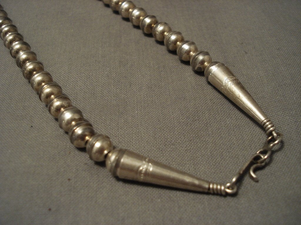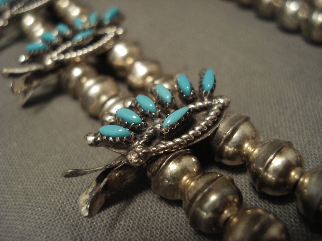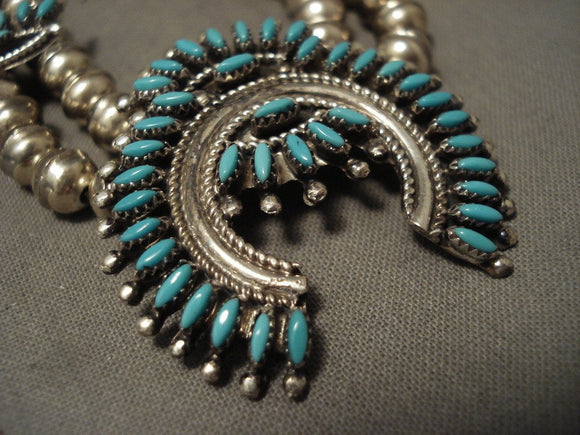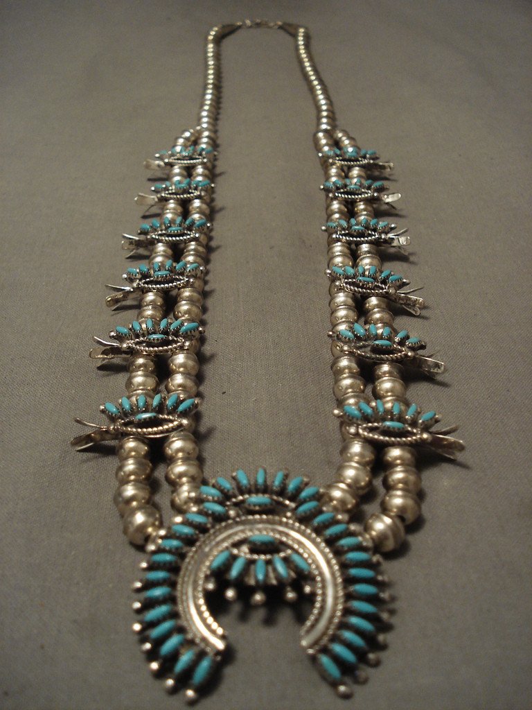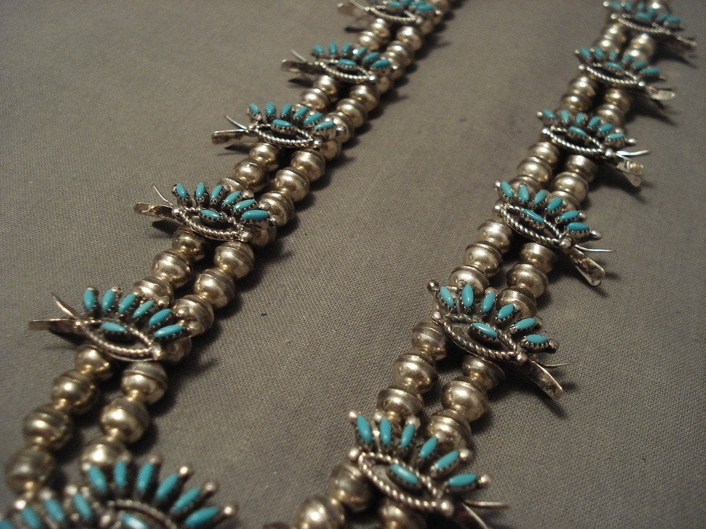 This is an impressive vintage Zuni Native American jewelry very important and museum quality Evangelita Edaakie silver squash blossom necklace. Located on this piece are 12 fabulous and uniquely shaped squashes that each contain a phenomenal plethora of hand carved needlepoint turquoise stones. All of the squash blossoms are eyes and each measure around 1" X 1/2". The wonderful 1-1/2" X 1-1/2" silver naja pendant also contains incredible hand cut needlepoint turquoise stones. Resting throughout the necklace are marvelous hand wrought silver beads with two accenting silver cones and a traditional silver clasp. Sterling silver. Cir. 1960's+. Signed by Zuni Native American jewelry artist, Evangelita Edaakie. The length of the necklace measures around 29". Sturdy 58 grams. LAYAWAYS- We are happy to work with you and are more flexible than anyone on the net. Simply send us an email for more information.