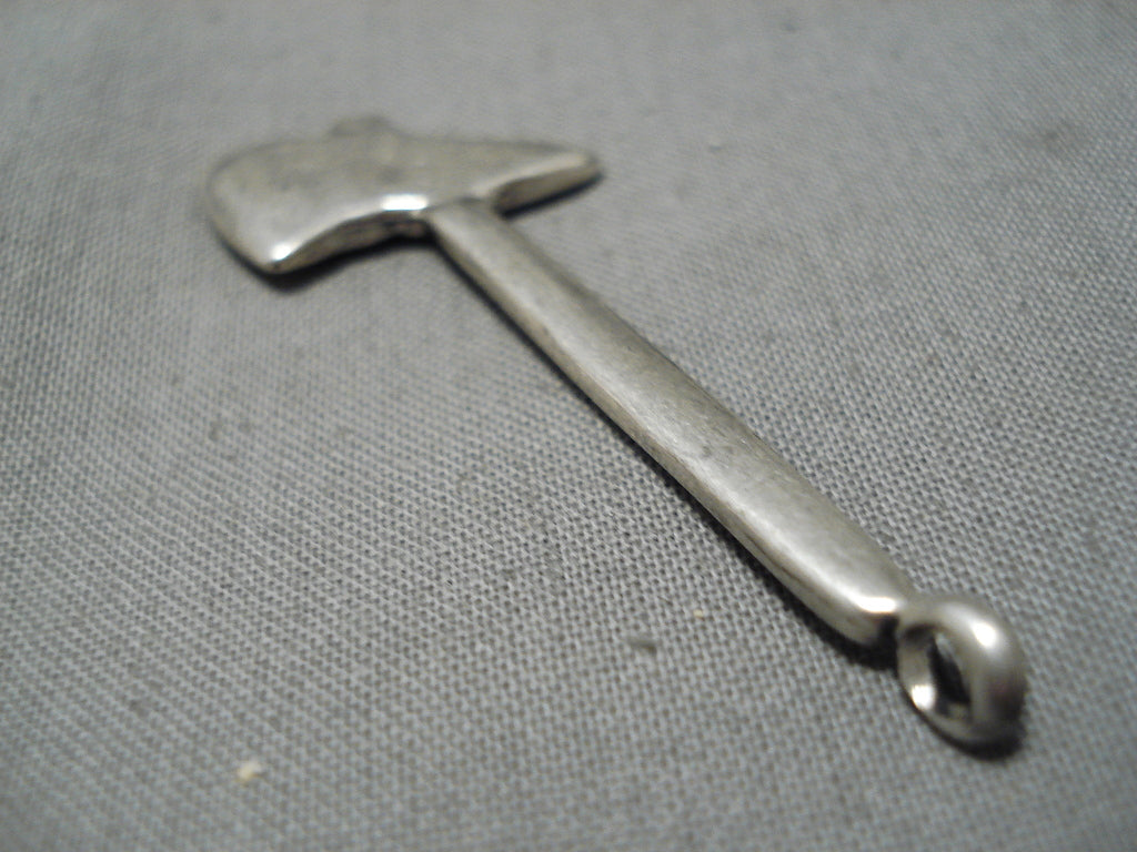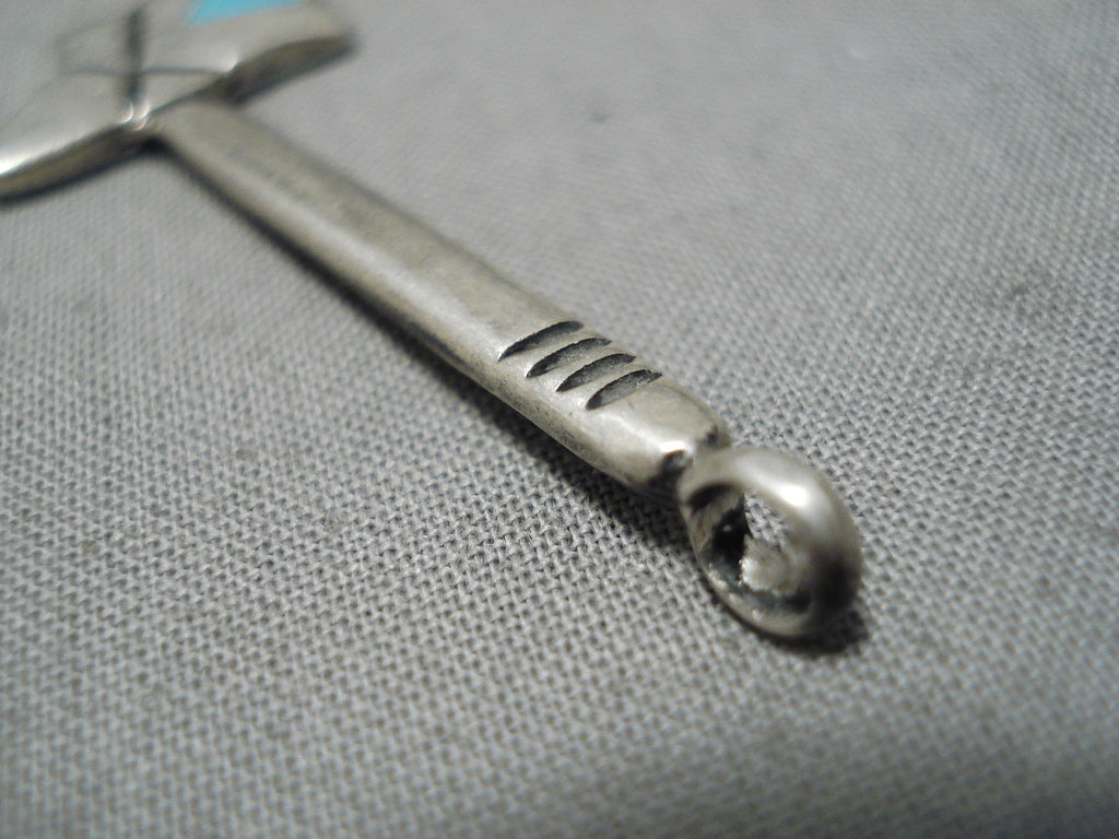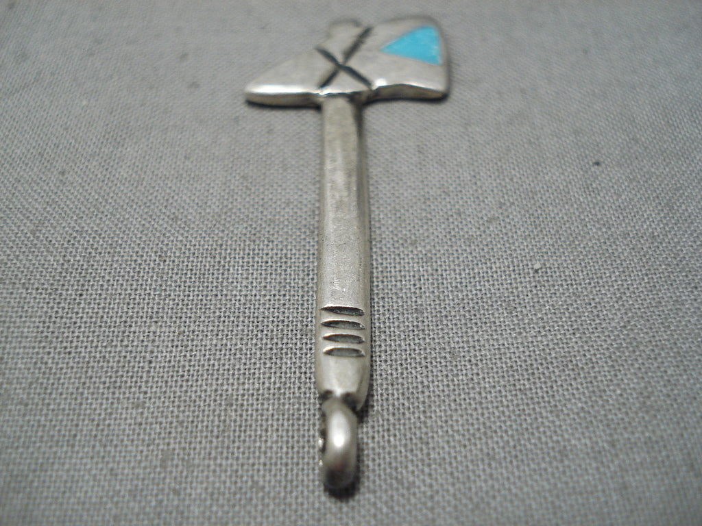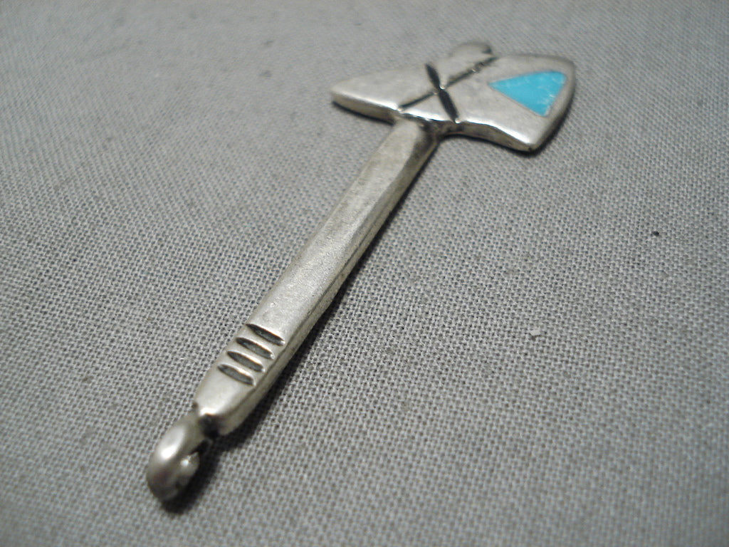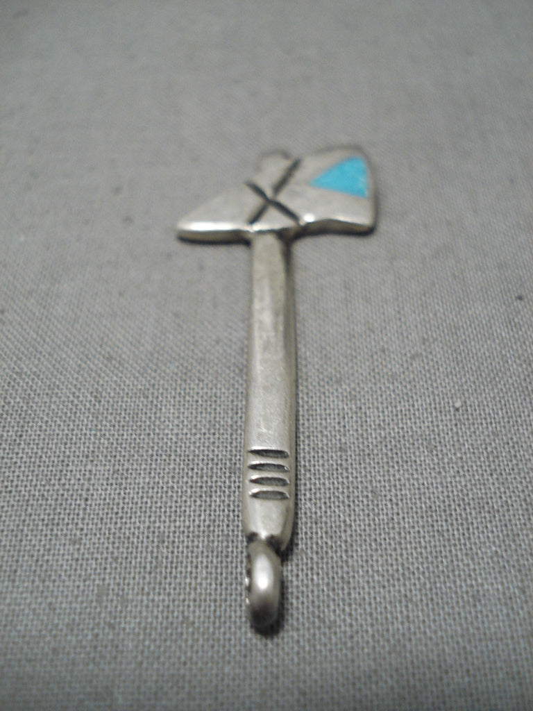 Impressive Vintage Native American Navajo Tomahawk Turquoise Inlay Sterling Silver Pendant